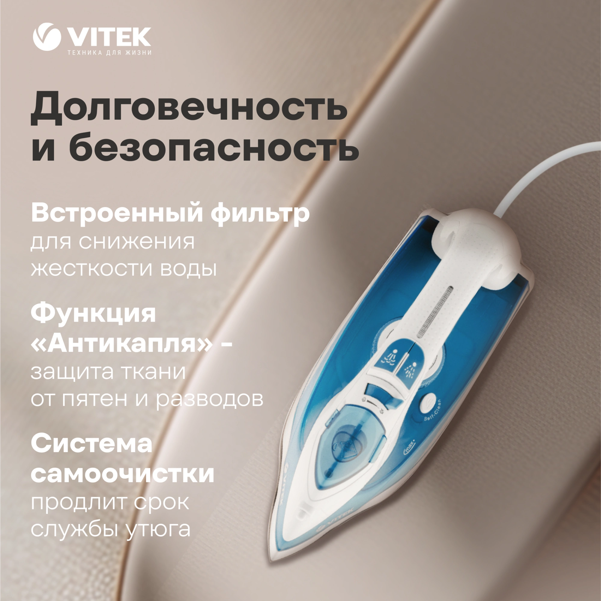 Безупречно отгладить любую одежду поможет VITEK VT-8330, максимальная мощность которого составляет 2400 Вт. Подошва прибора имеет уникальное двойное керамическое покрытие UniCera, которое обеспечивает легкое скольжение как по плотным тканям, так и по самым тонким. Утюг способен работать в двух режимах: сухого глажения с возможностью разбрызгивания воды и отпаривания, в том числе вертикального (паровой удар — 140 г/мин). Особому комфорту в использовании способствует система самоочистки, а также функция «Антикапля». Встроенная защита от накипи способствует продлению срока службы прибора. Утюг защищен от перегрева и отключается автоматически, если остается без движения на протяжении некоторого времени. Купите утюг VITEK VT-8330, который позволит вам не просто обеспечивать одежде идеальный внешний вид, но и заботиться о ней!