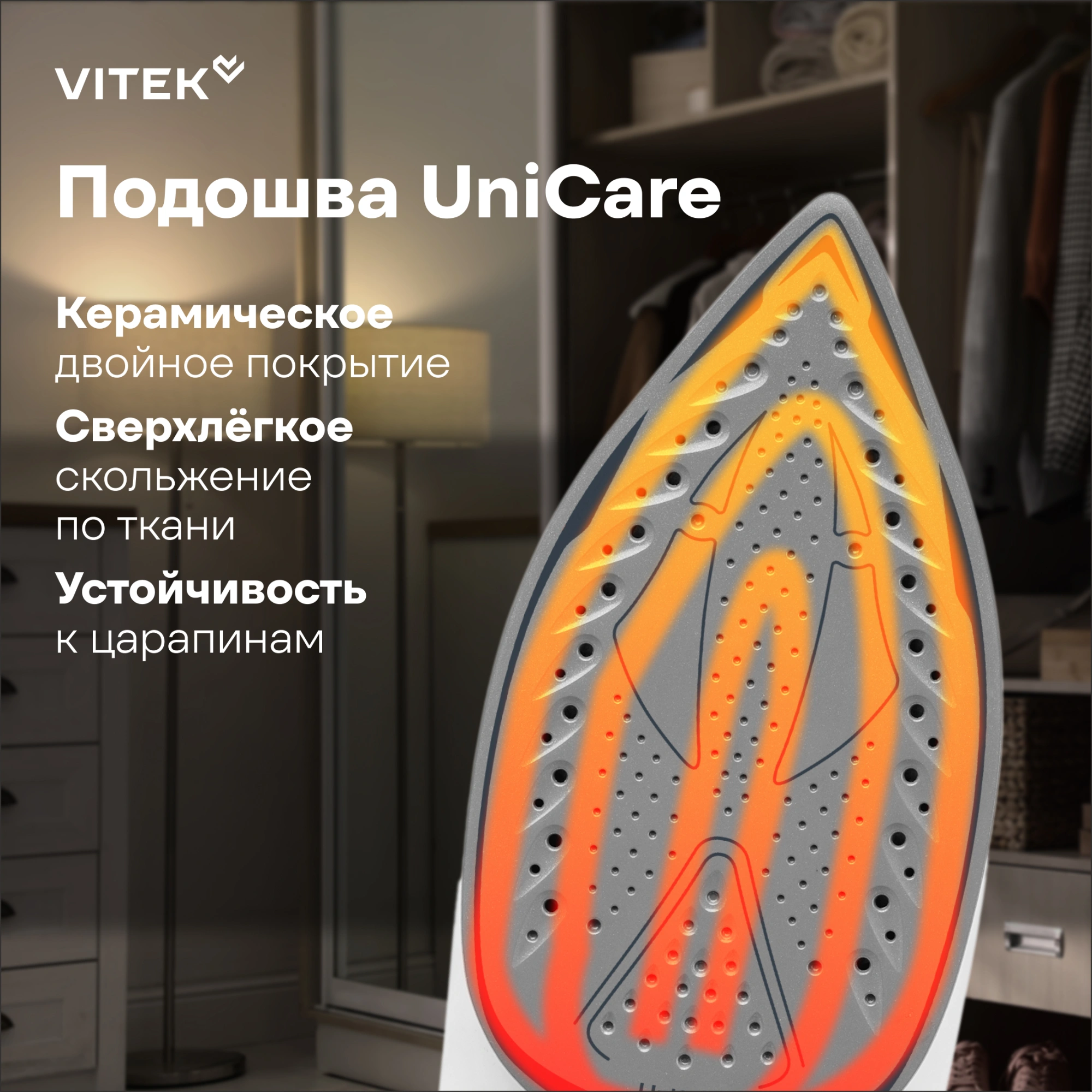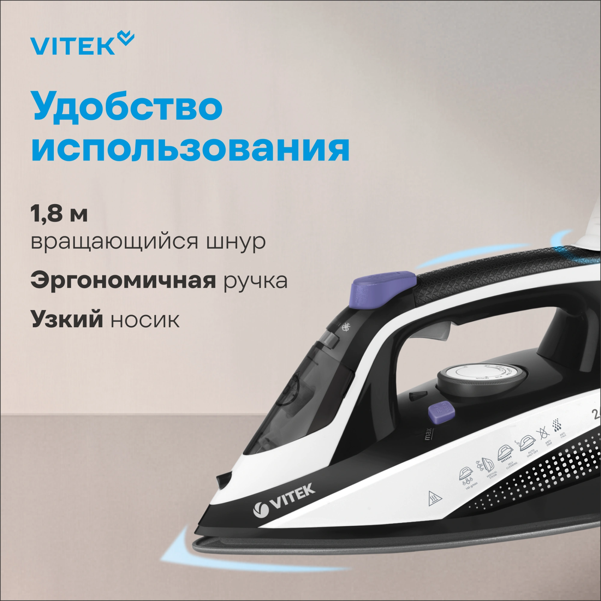 Быстро и качественно привести в порядок костюм или платье позволит утюг VITEK VT-8360 — его максимальная мощность составляет 2400 Вт, а паровой удар — до 145 г/мин. Утюг обеспечит дополнительную безопасность, так как автоматически отключится, если оставить его без движения. Утюг способен работать как в режиме сухого глажения, так и отпаривания (в том числе вертикального). По желанию вы можете воспользоваться функцией тонкого разбрызгивания. Подошва прибора имеет уникальное двойное керамическое покрытие UniCera, которое обеспечивает невероятно легкое скольжение по любому виду ткани. Особому комфорту в использовании прибора способствует встроенная система защиты от накипи, а также система самоочистки и функция «Антикапля».