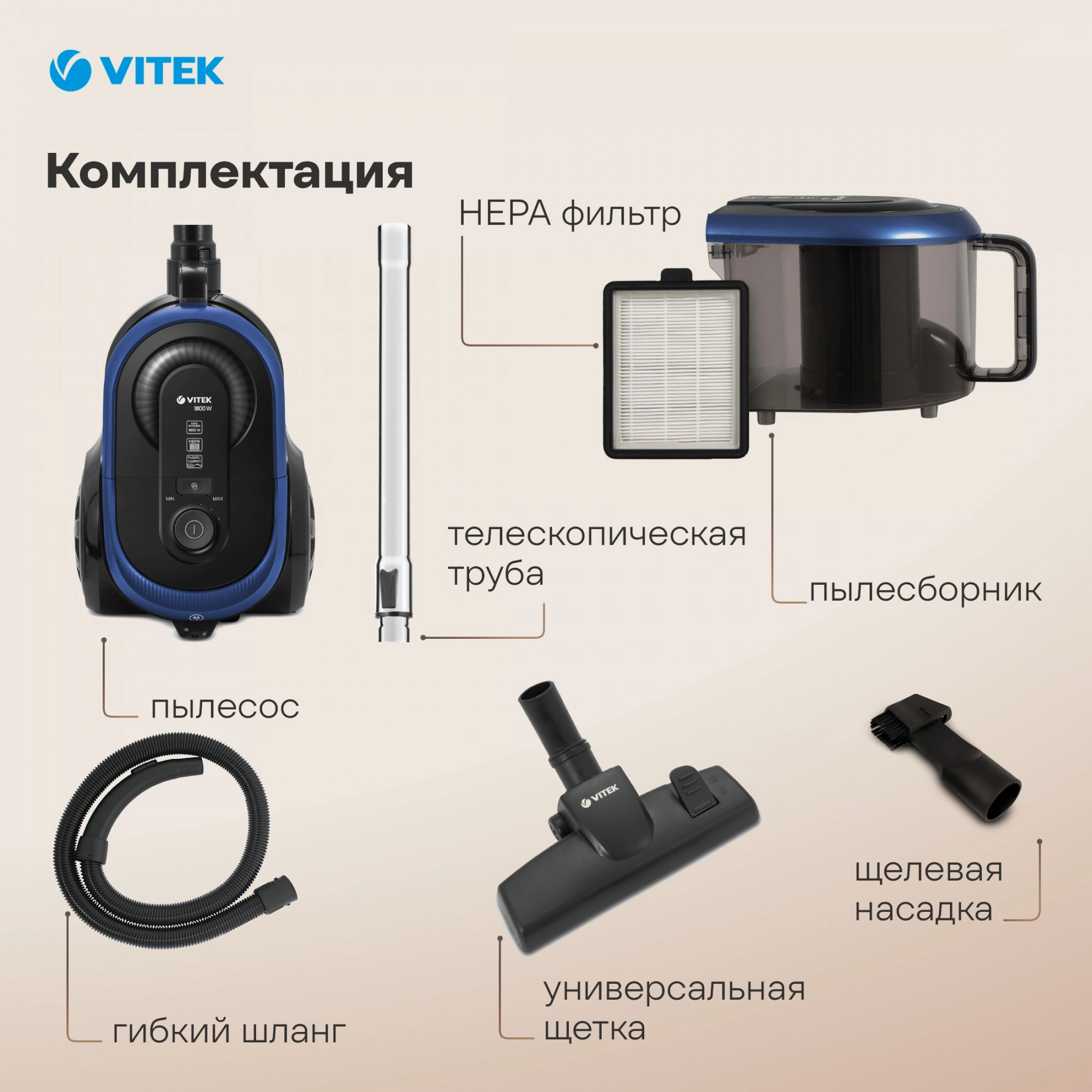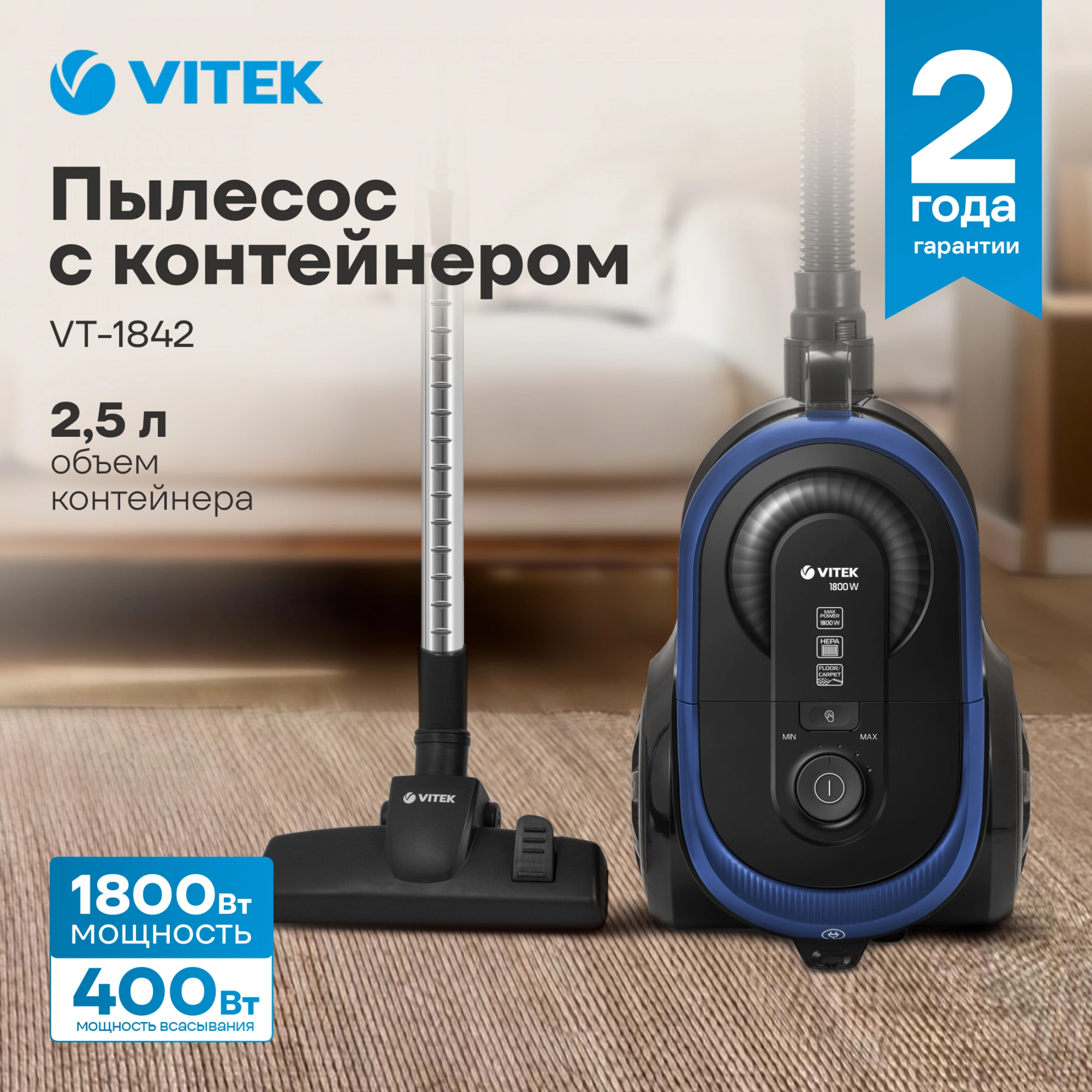 Пылесос для дома Vitek VT-1842 — надежное решение для повседневной сухой уборки, сочетающее мощность, фильтрацию и удобство эксплуатации. С двигателем мощностью 1400 Вт и силой всасывания 400 Вт он справляется с пылью, крошками и шерстью даже на коврах с плотным ворсом. Вместительный контейнер для пыли объемом 2.5 литра позволяет убираться без частых перерывов на очистку пылесборника, а функция индикации наполнения подскажет, когда пришло время его опорожнить.