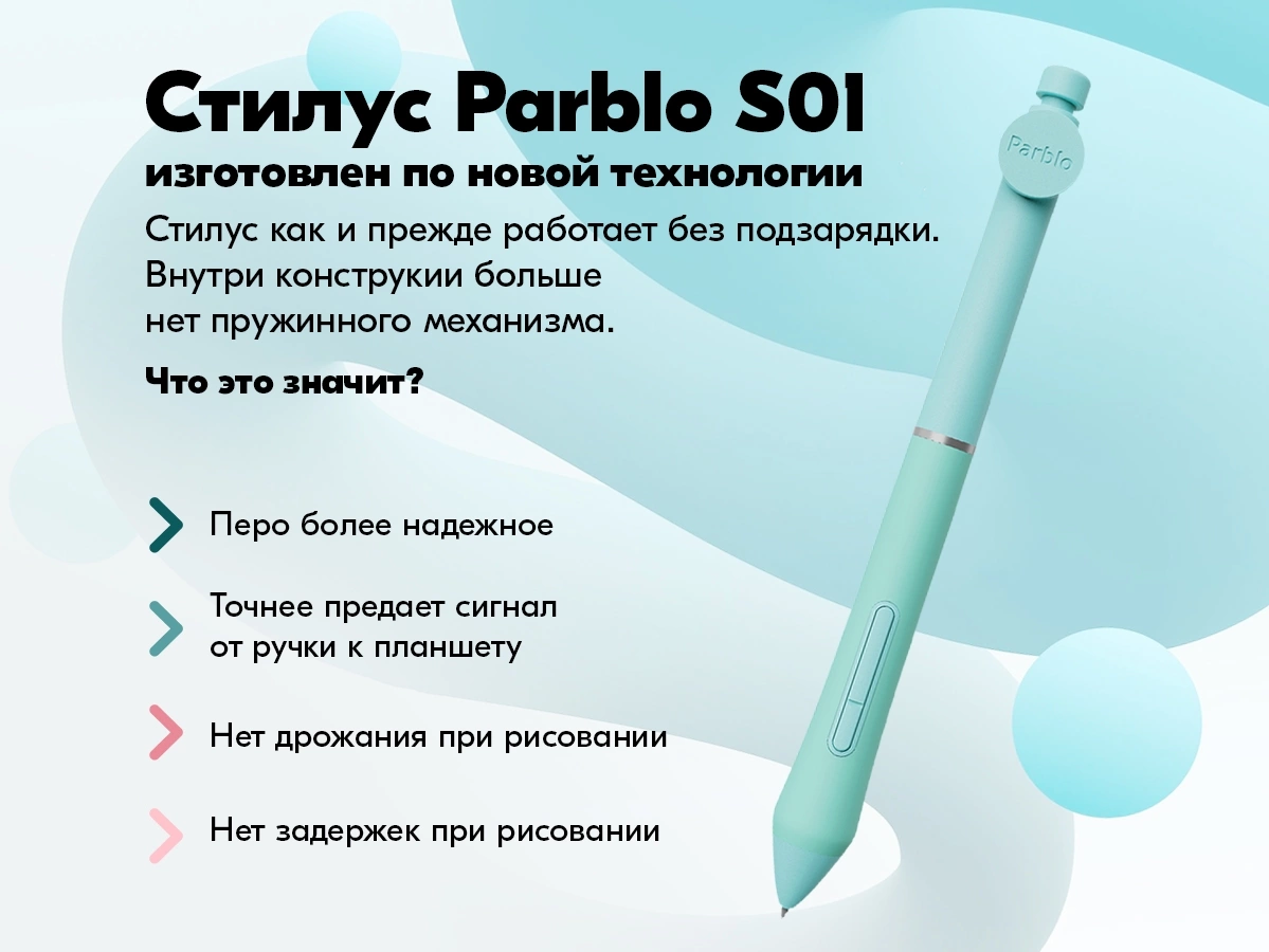 Новый стилус S01. Его особенности: полностью устранен джиттер эффект (эффект подрагивания курсора) при рисовании. Изменена конструкция фиксирования наконечника пера - теперь наконечник неподвижен, это точнее передает нажим пера. Программируемое Dial-кольцо.Физический переключатель режимов планшета.