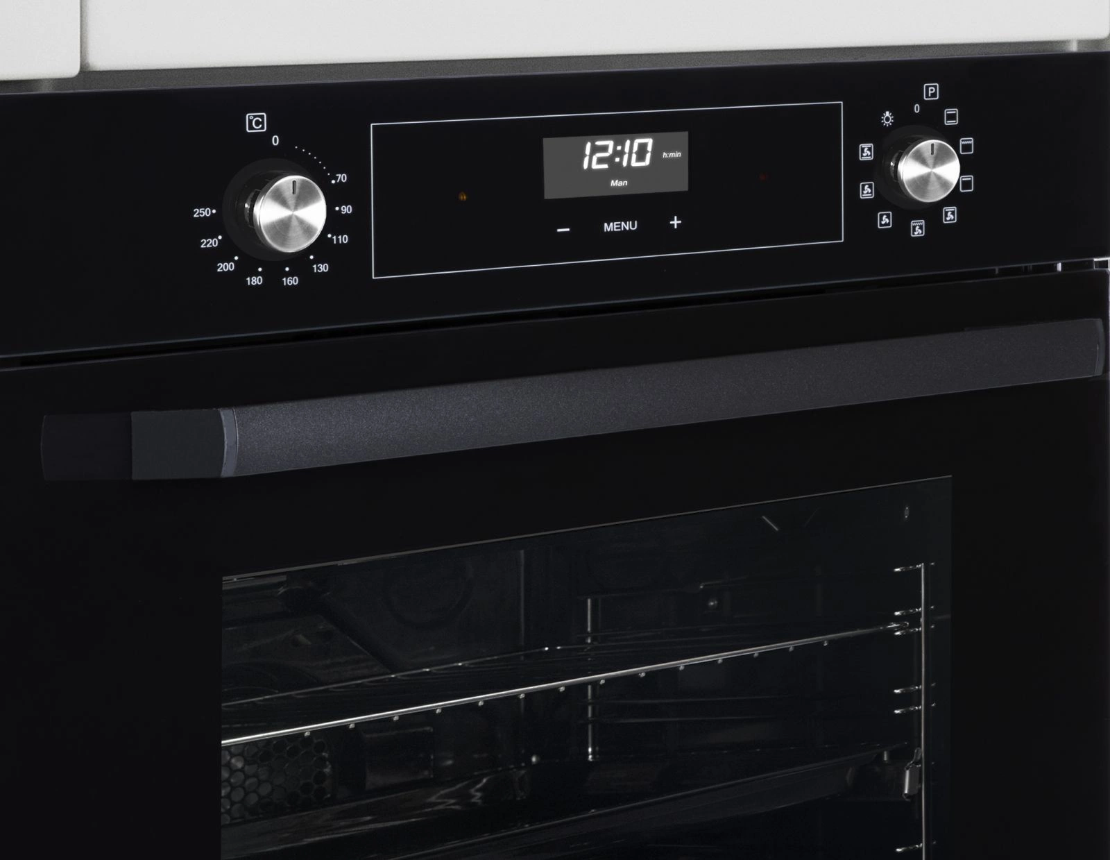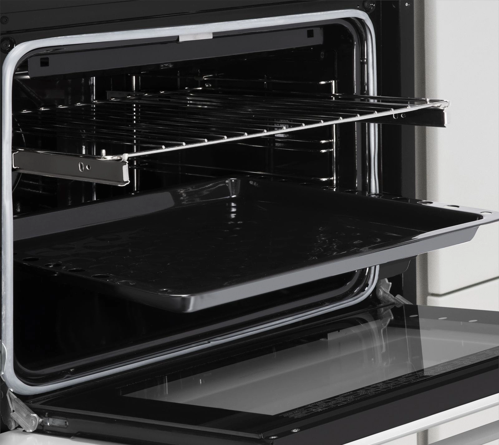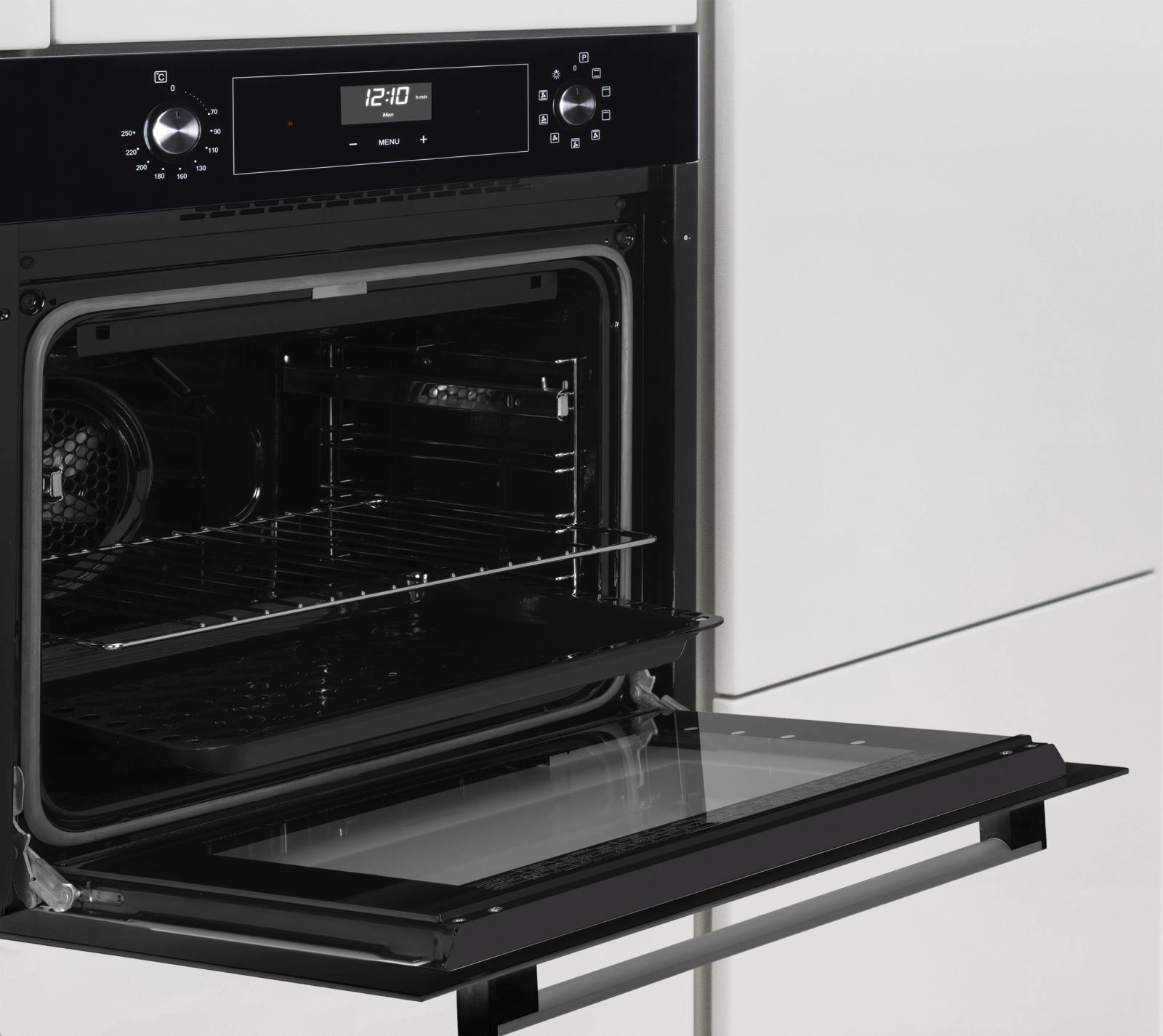 дисплей, полностью стеклянная внутренняя поверхность дверцы духовки, телескопические направляющие, утапливаемые переключатели