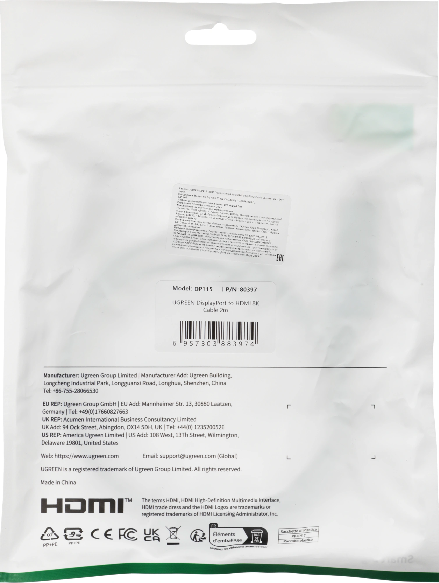 Кабель UGREEN DP115 (80397) DisplayPort to HDMI 8K@60Hz Cable. Длина: 2м. Цвет: серый