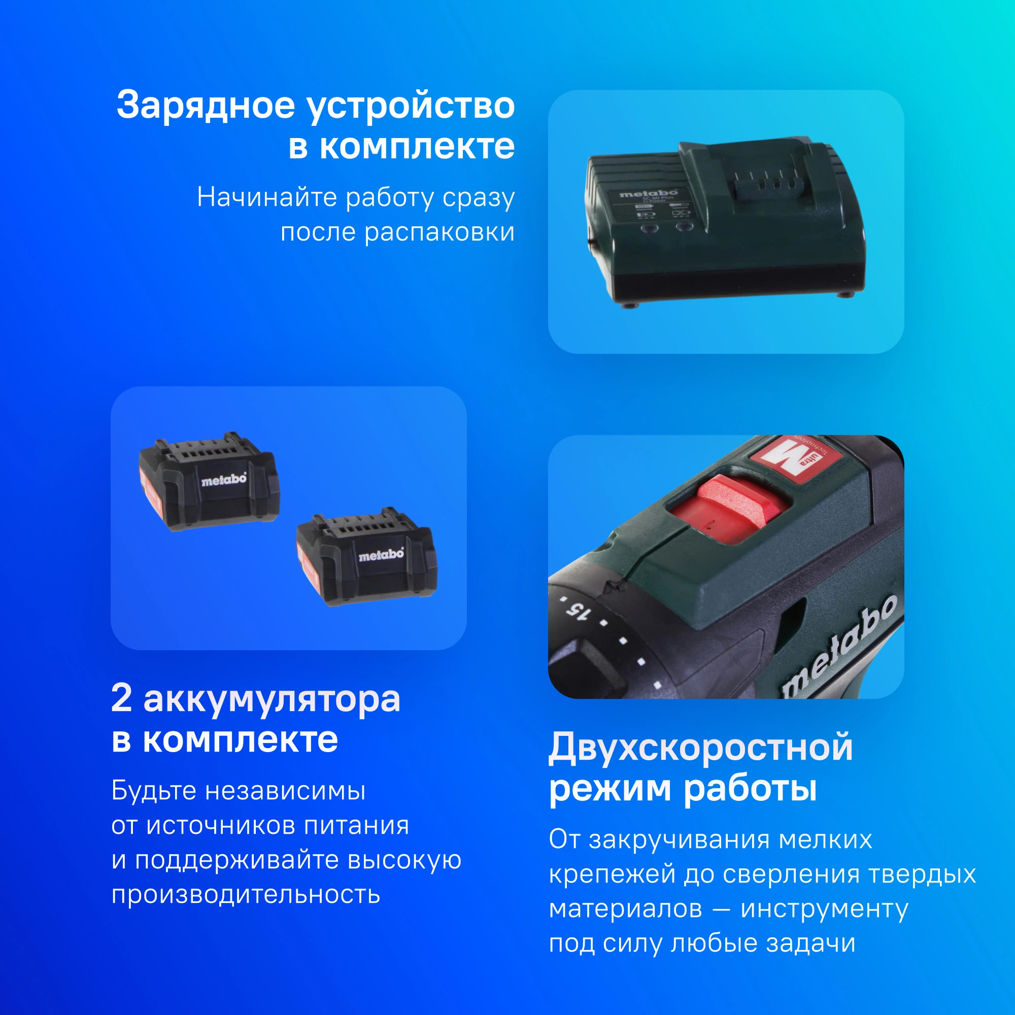 Дрель-шуруповерт, быстрозажимной сверлильный патрон 1.5-13 мм; крючок для ношения на ремне; 2 аккумуляторных блока Li-Power (14,4 В/2,0 А*ч); зарядное устройство SC 30; пластиковый кофр.