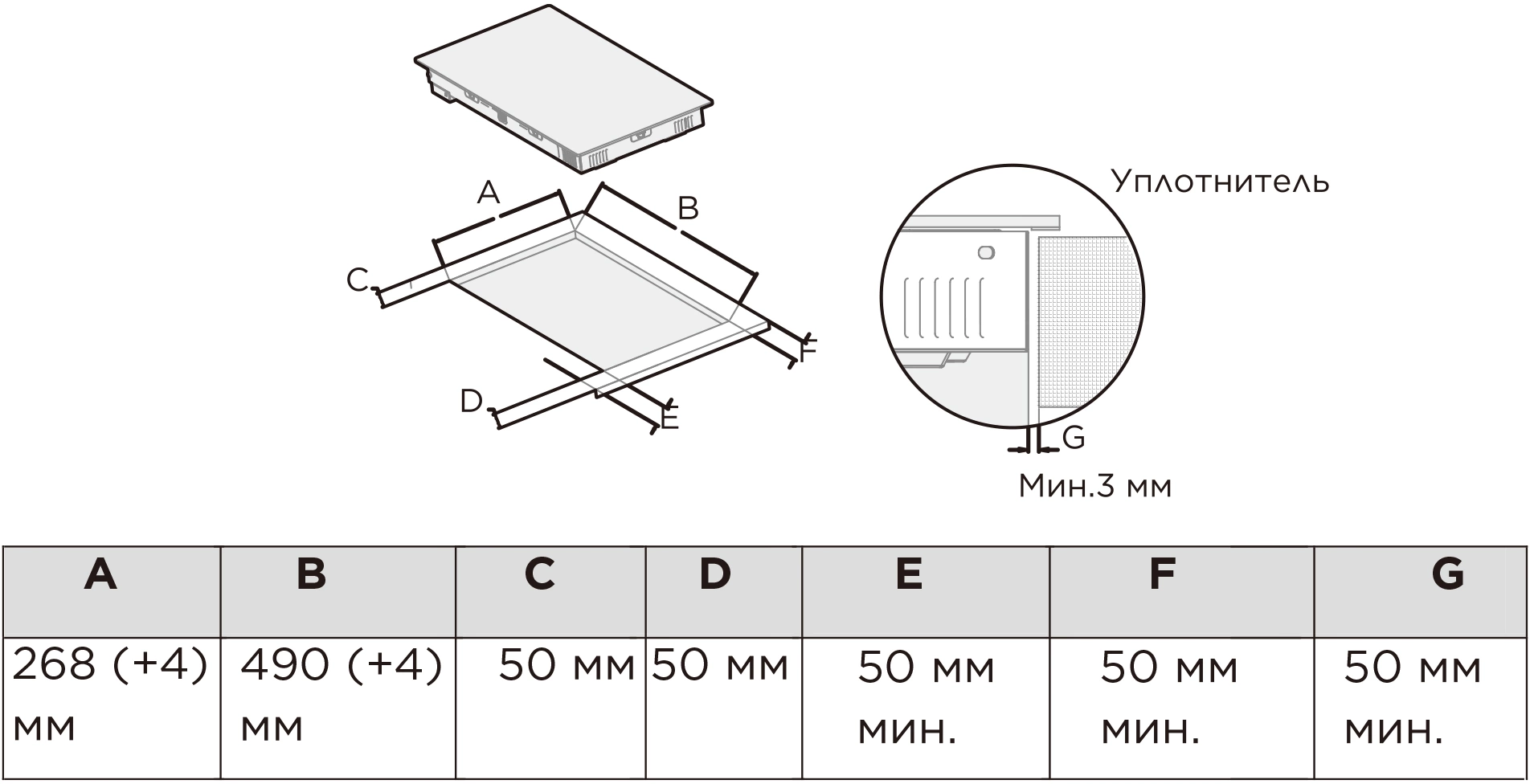 блокировка управления (защита от детей), защитное отключение, отключение при проливе жидкости, самодиагностика