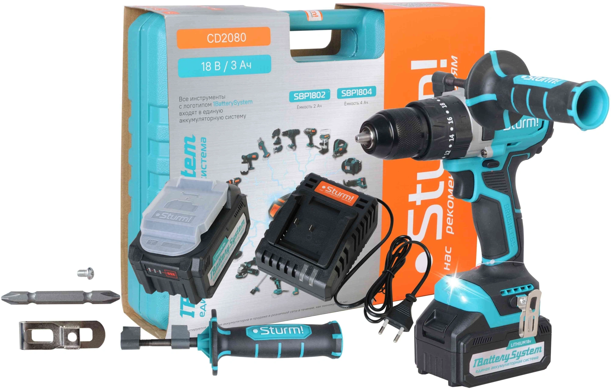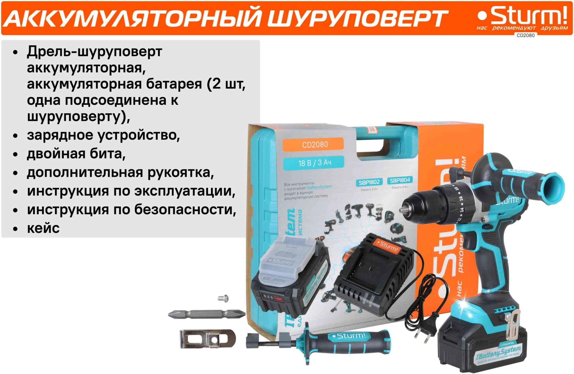 Дрель-шуруповерт аккумуляторная, аккумуляторная батарея (2 шт, одна подсоединена к шуруповерту), зарядное устройство, двойная бита, дополнительная рукоятка, инструкция по эксплуатации, инструкция по безопасности, кейс.