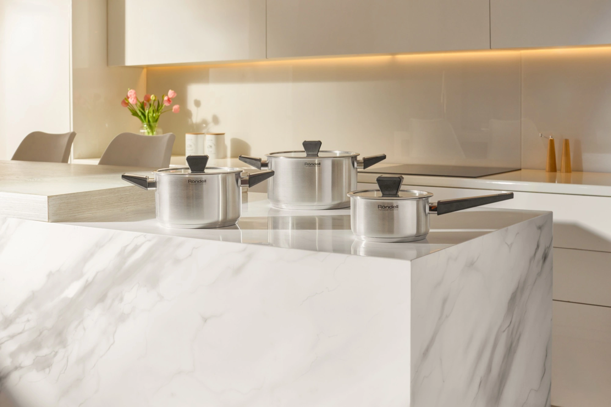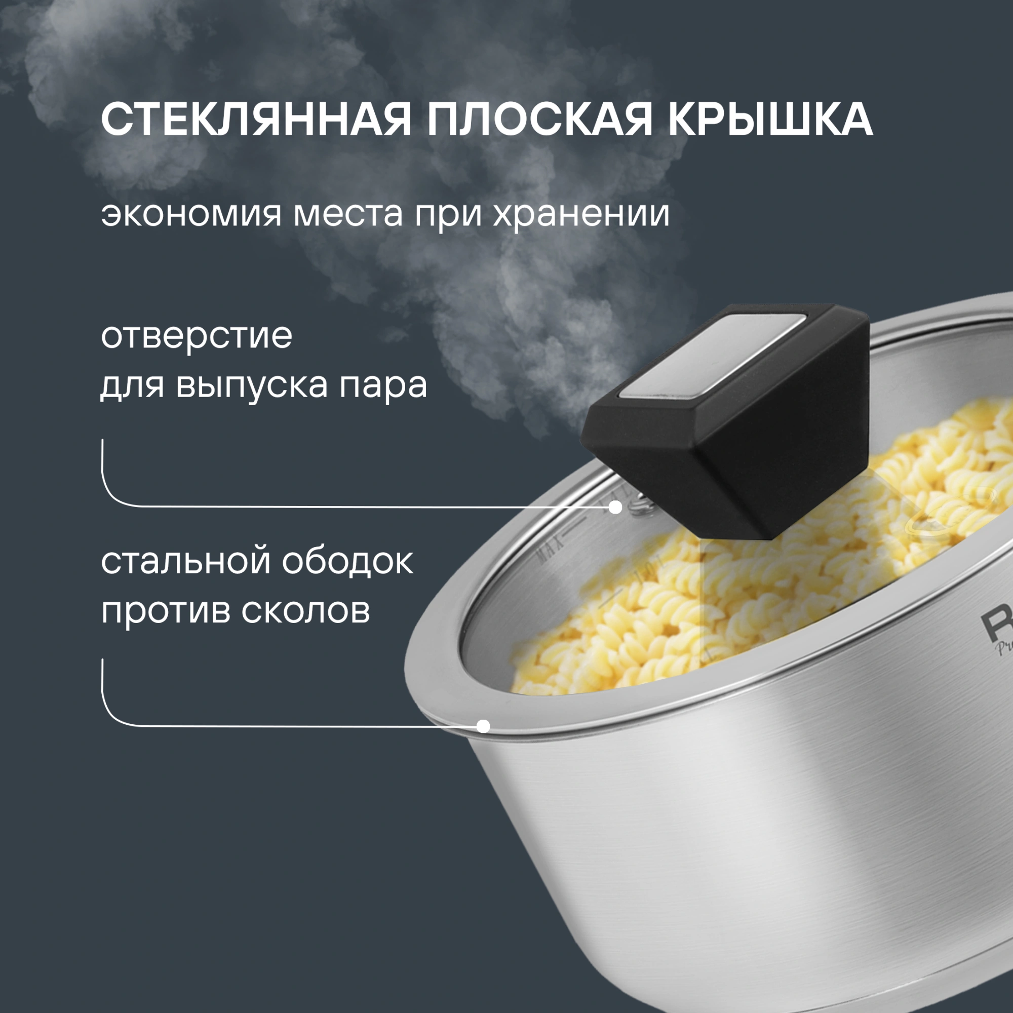 Технология: тройное вштампованное, а затем вплавленное дно без воздушных полостей. Аксессуары: стильные бакелитовые ручки со стальными вставками. Преимущества: эргономичная форма ручек. Плоская крышка из термостойкого стекла с паровыпуском и широким металлическим ободом.