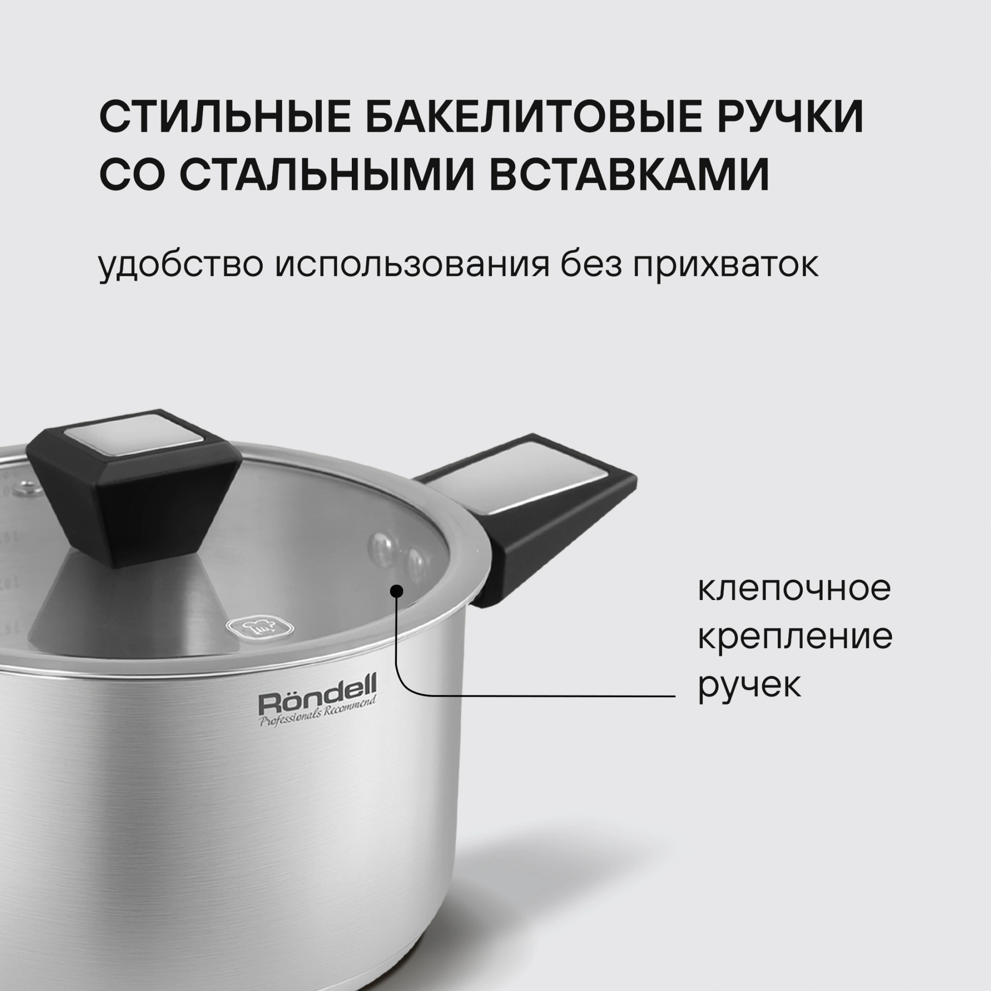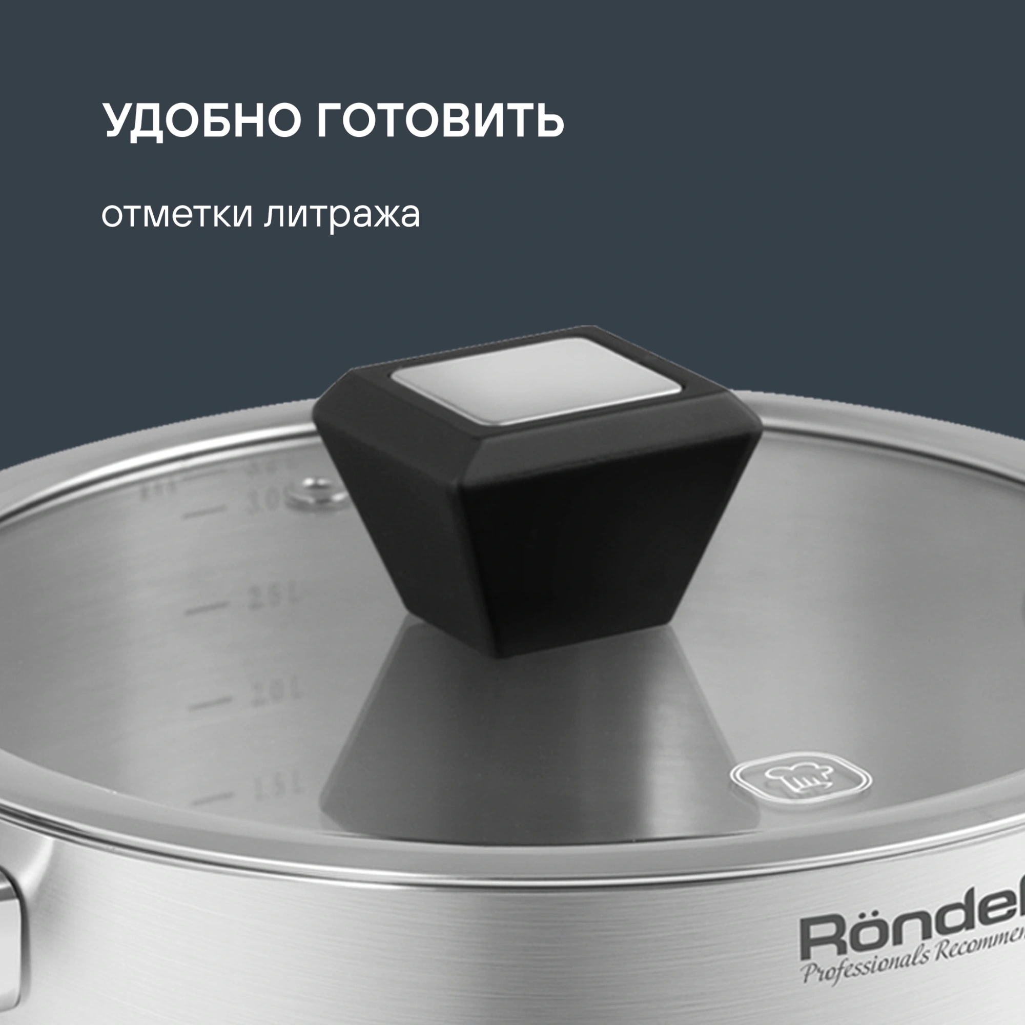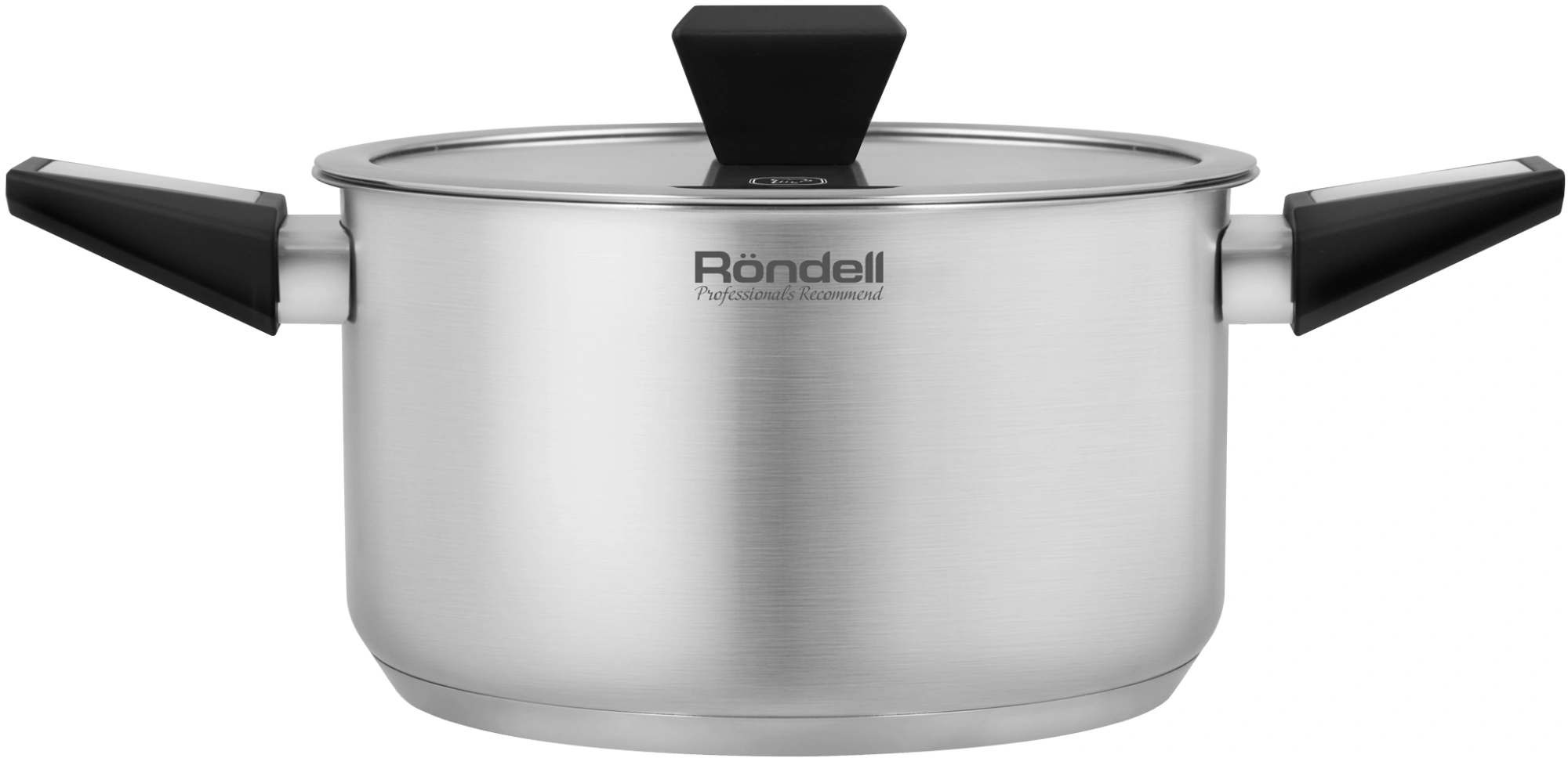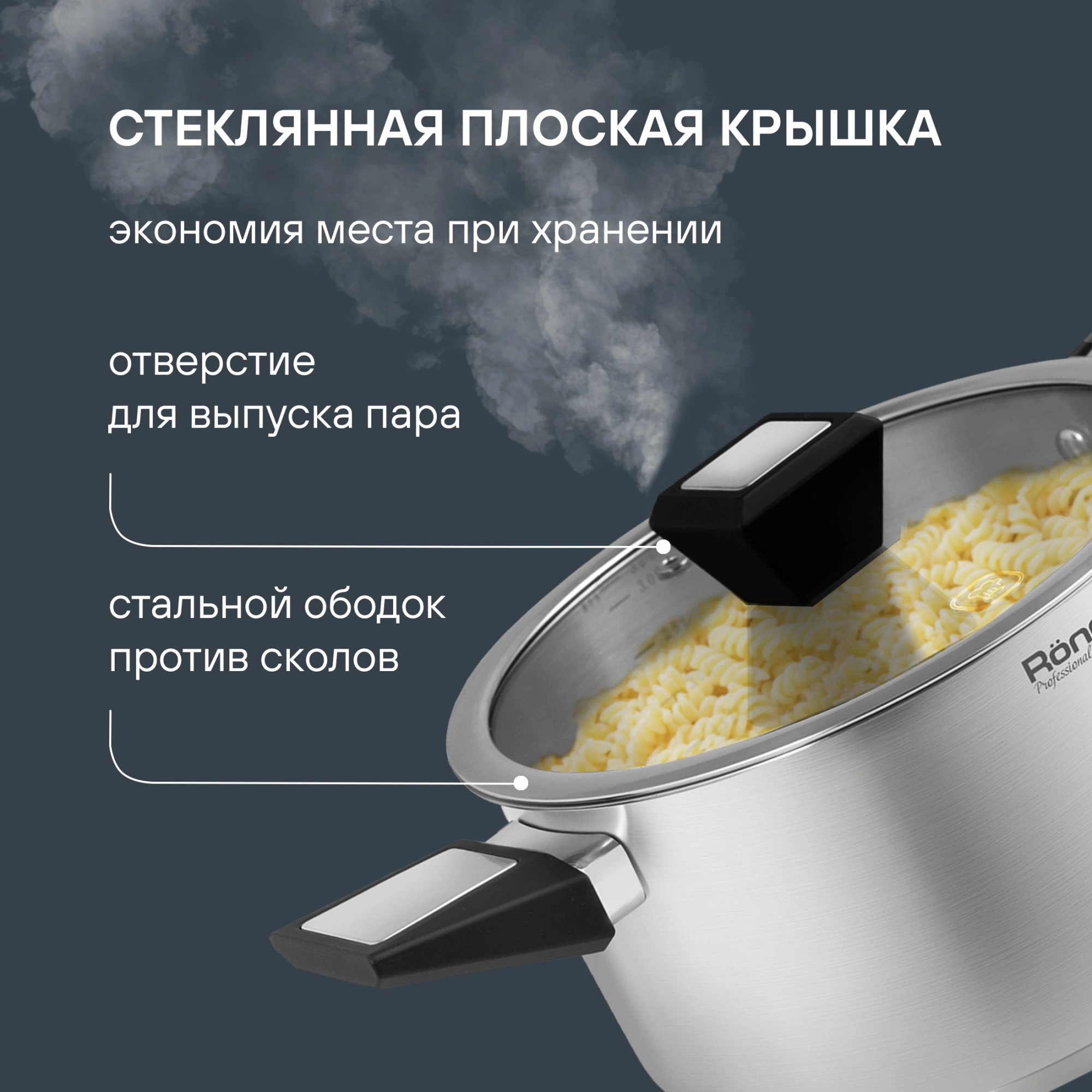 Технология: тройное вштампованное, а затем вплавленное дно без воздушных полостей. Аксессуары: cтильные бакелитовые ручки со стальными вставками. Преимущества: эргономичная форма ручек; Плоская крышка из термостойкого стекла с паровыпуском и широким металлическим ободом.