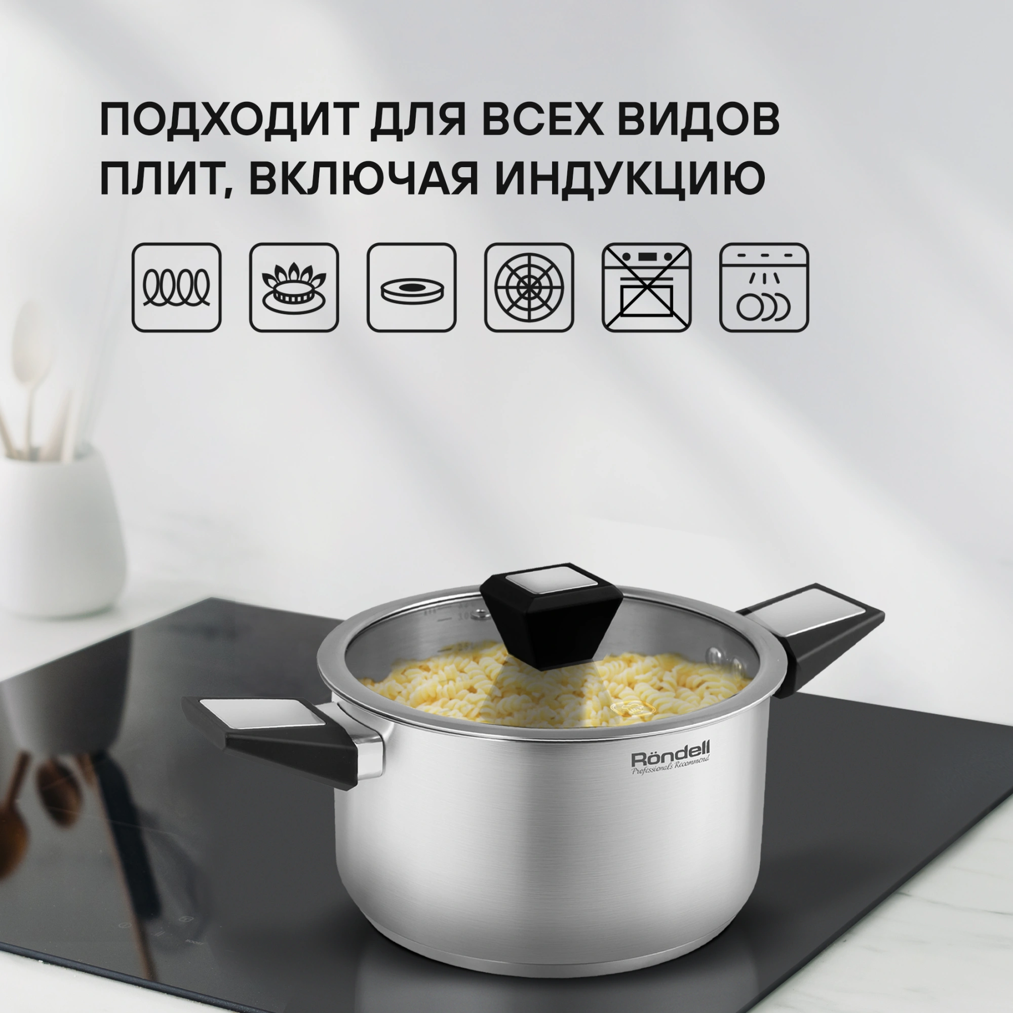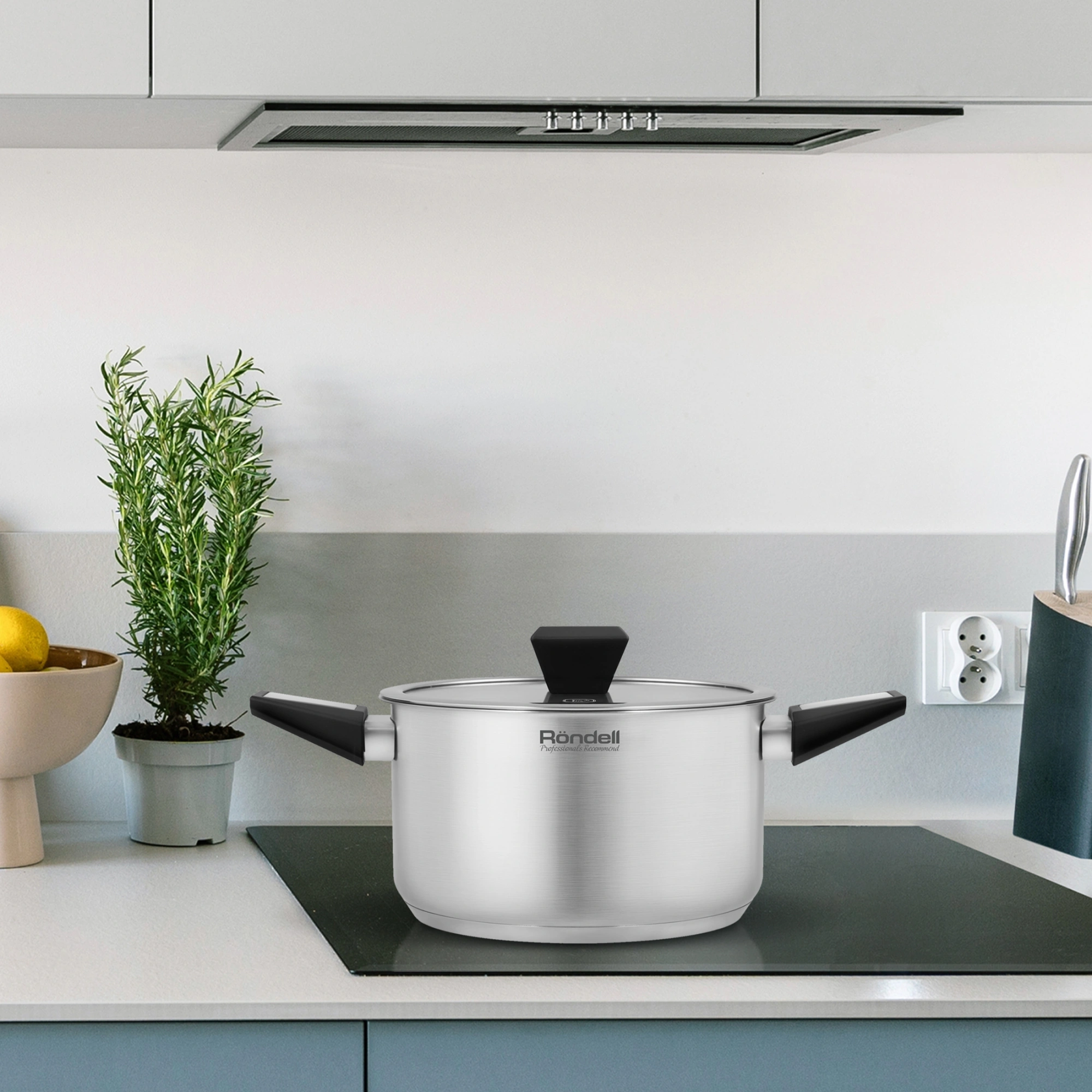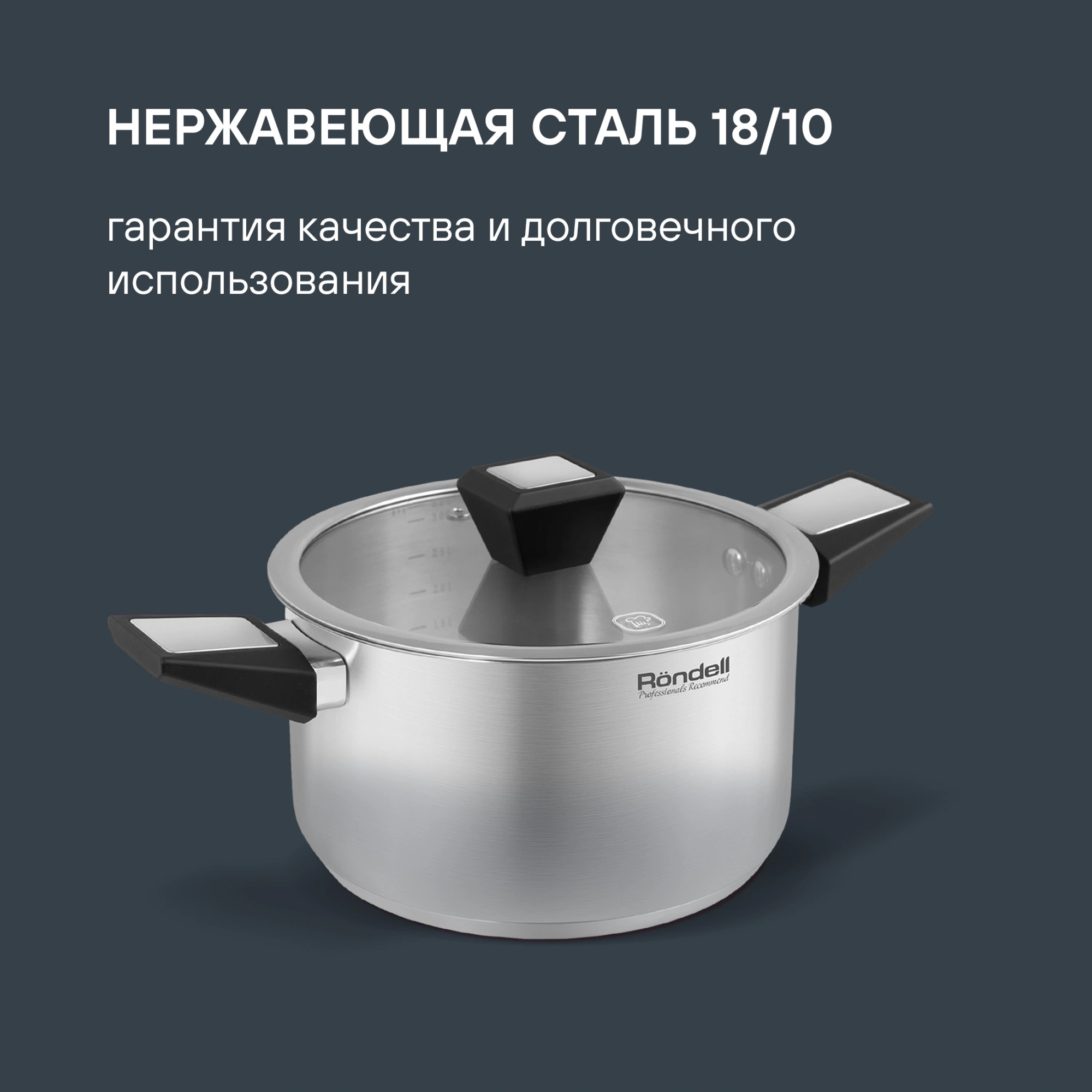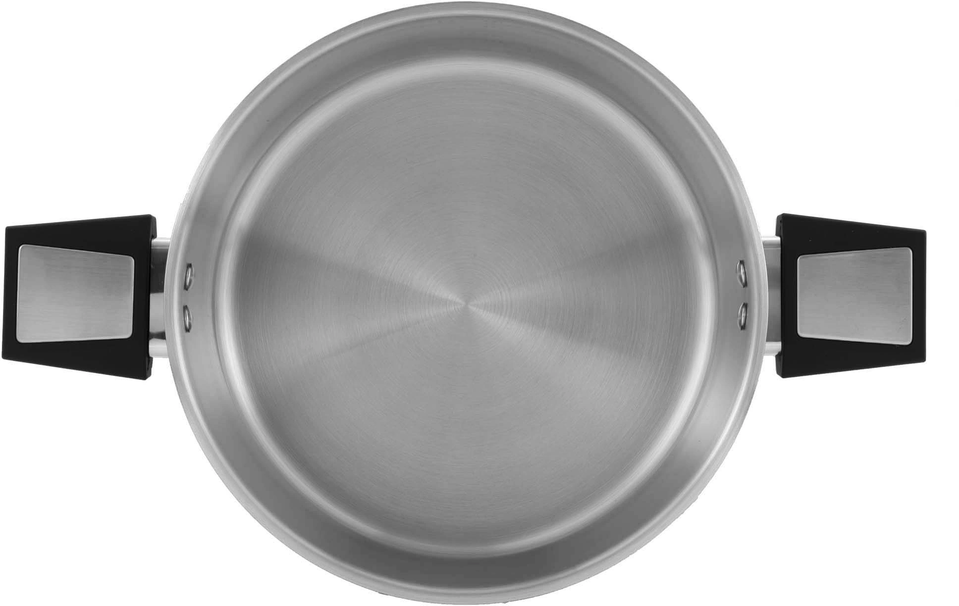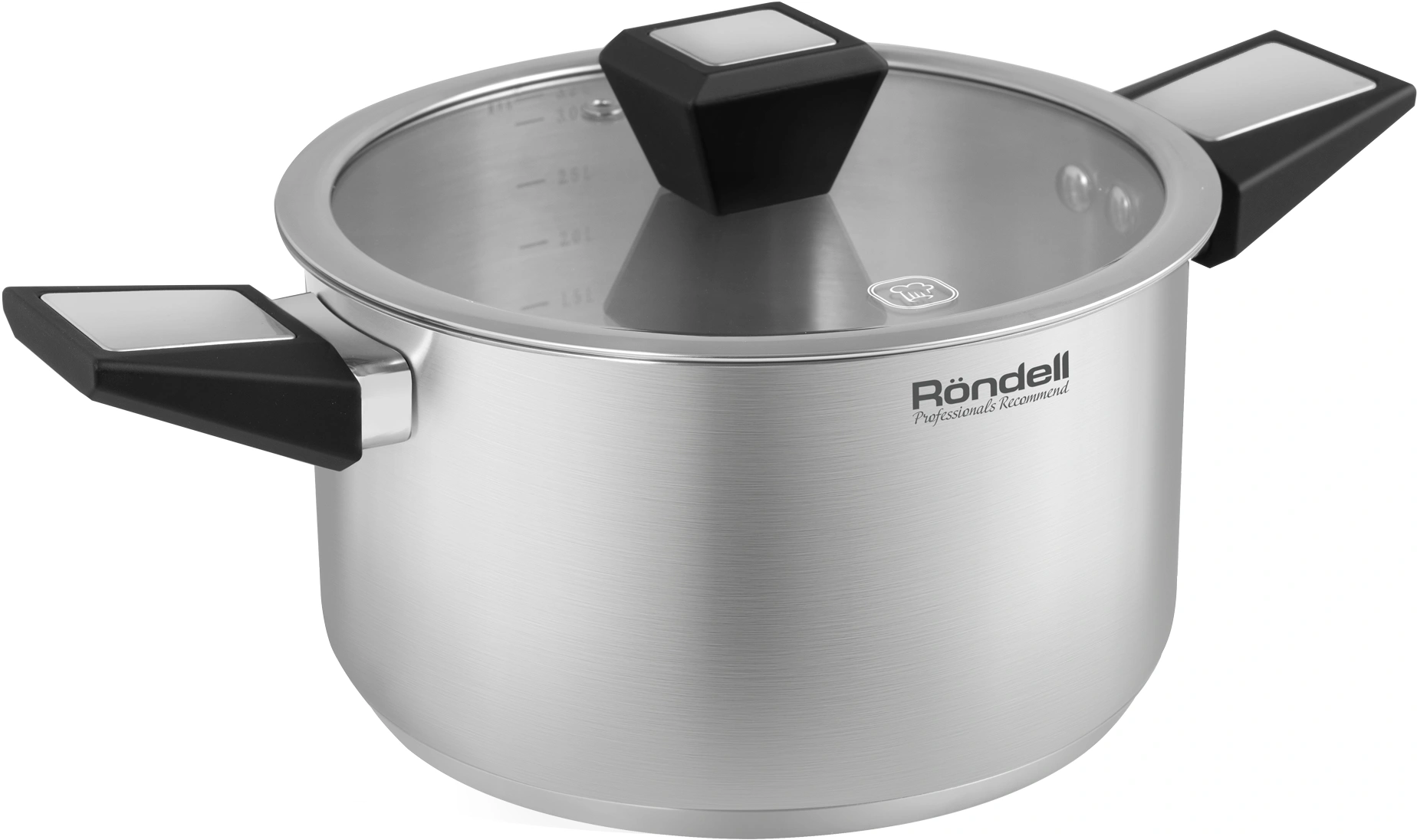 Технология: тройное вштампованное, а затем вплавленное дно без воздушных полостей. Аксессуары: cтильные бакелитовые ручки со стальными вставками. Преимущества: эргономичная форма ручек; Плоская крышка из термостойкого стекла с паровыпуском и широким металлическим ободом.