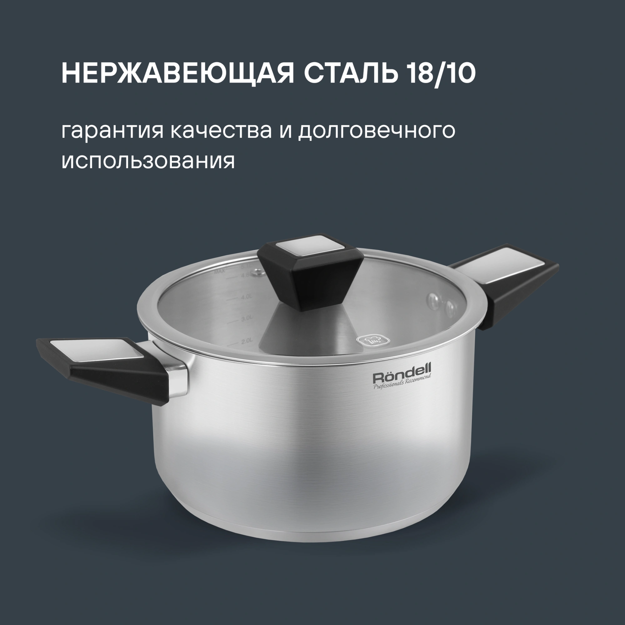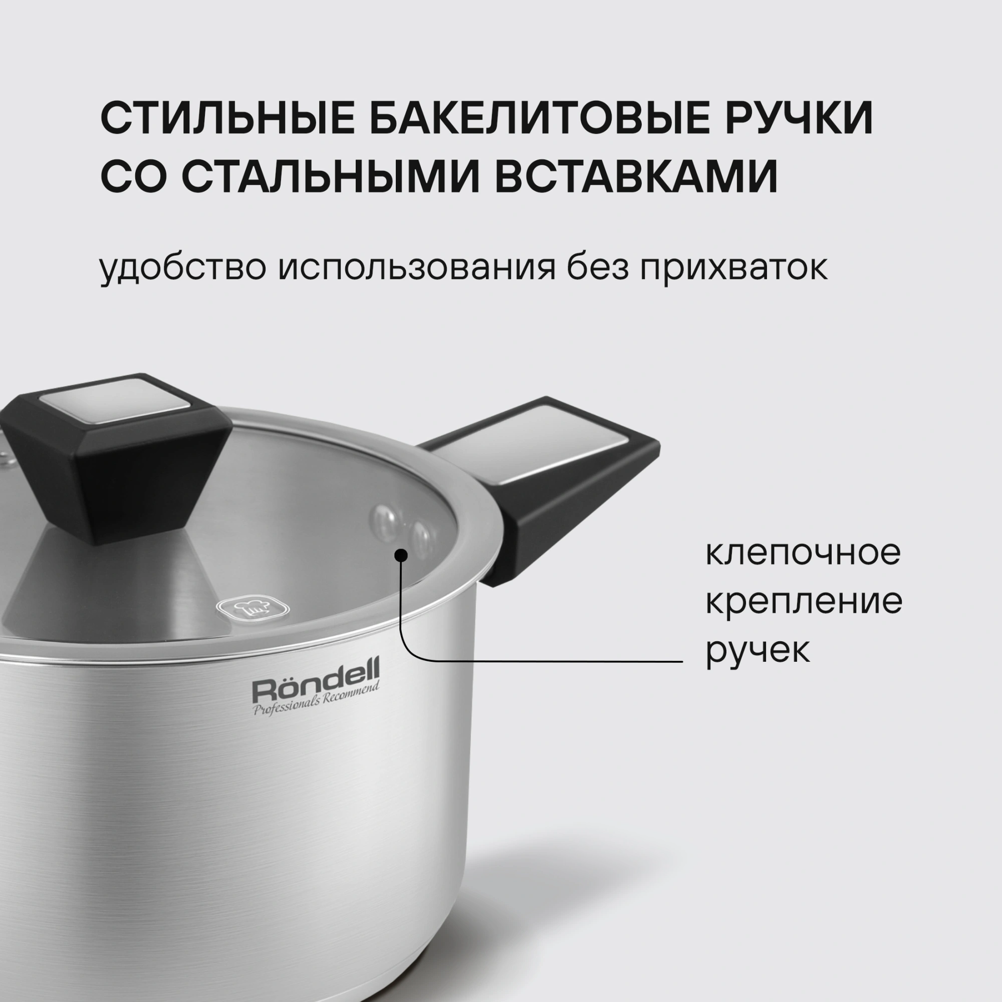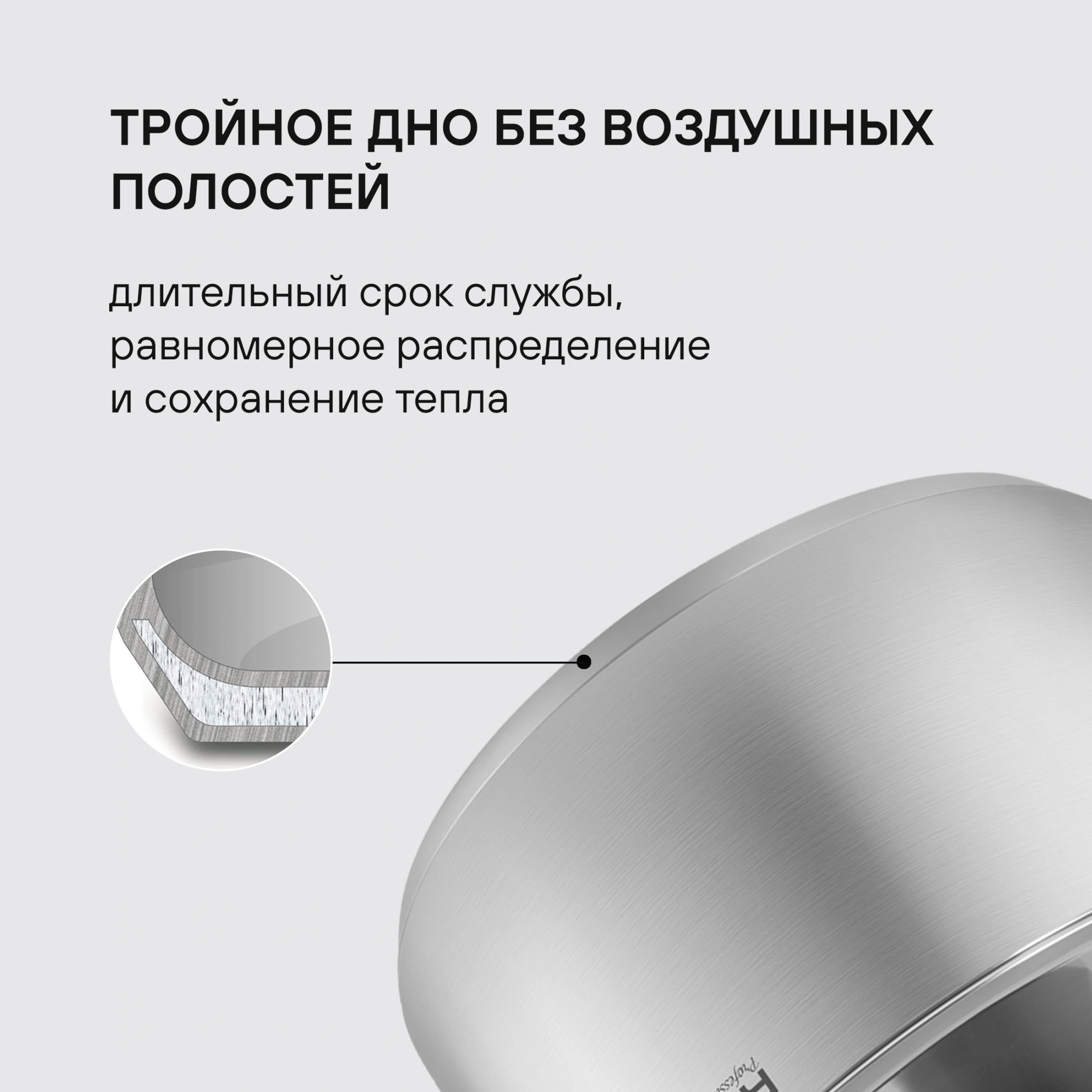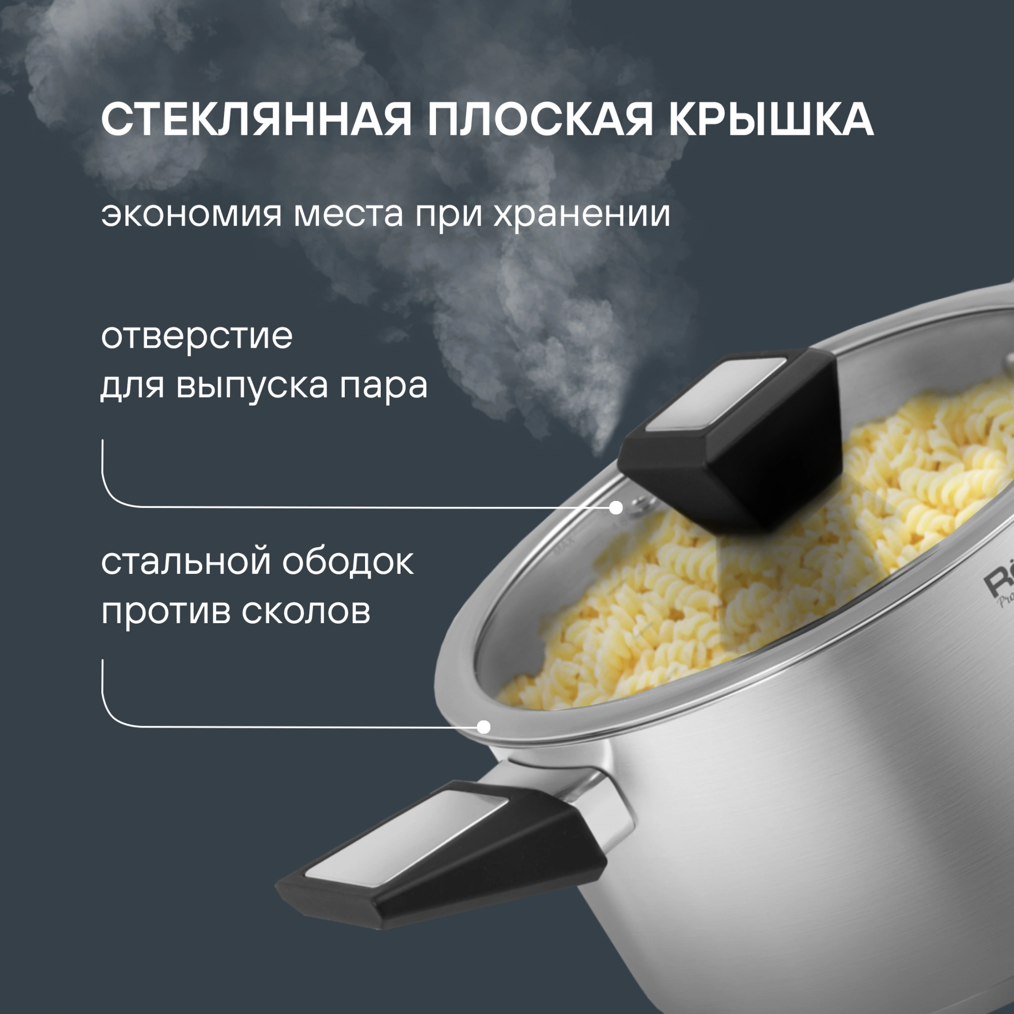 Технология: тройное вштампованное, а затем вплавленное дно без воздушных полостей. Аксессуары: cтильные бакелитовые ручки со стальными вставками. Преимущества: эргономичная форма ручек; Плоская крышка из термостойкого стекла с паровыпуском и широким металлическим ободом.
