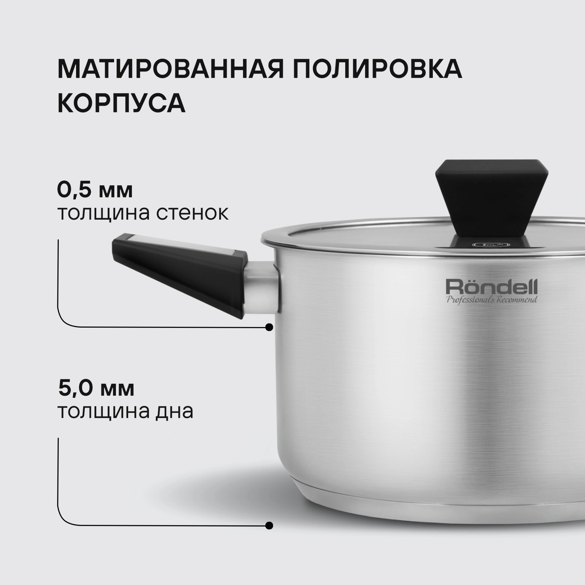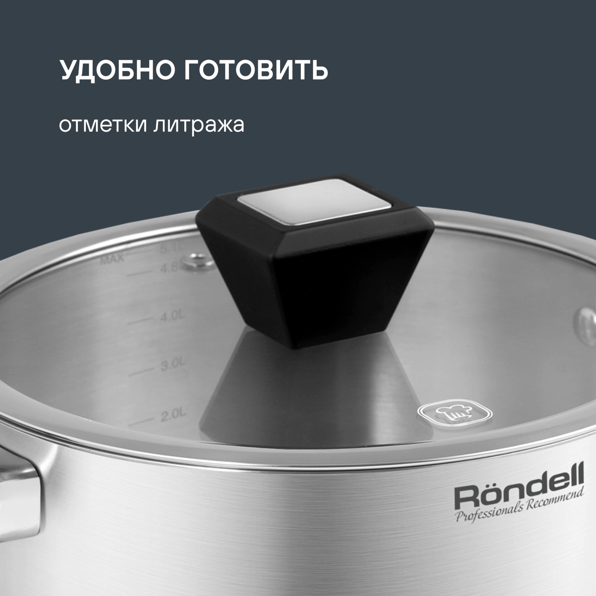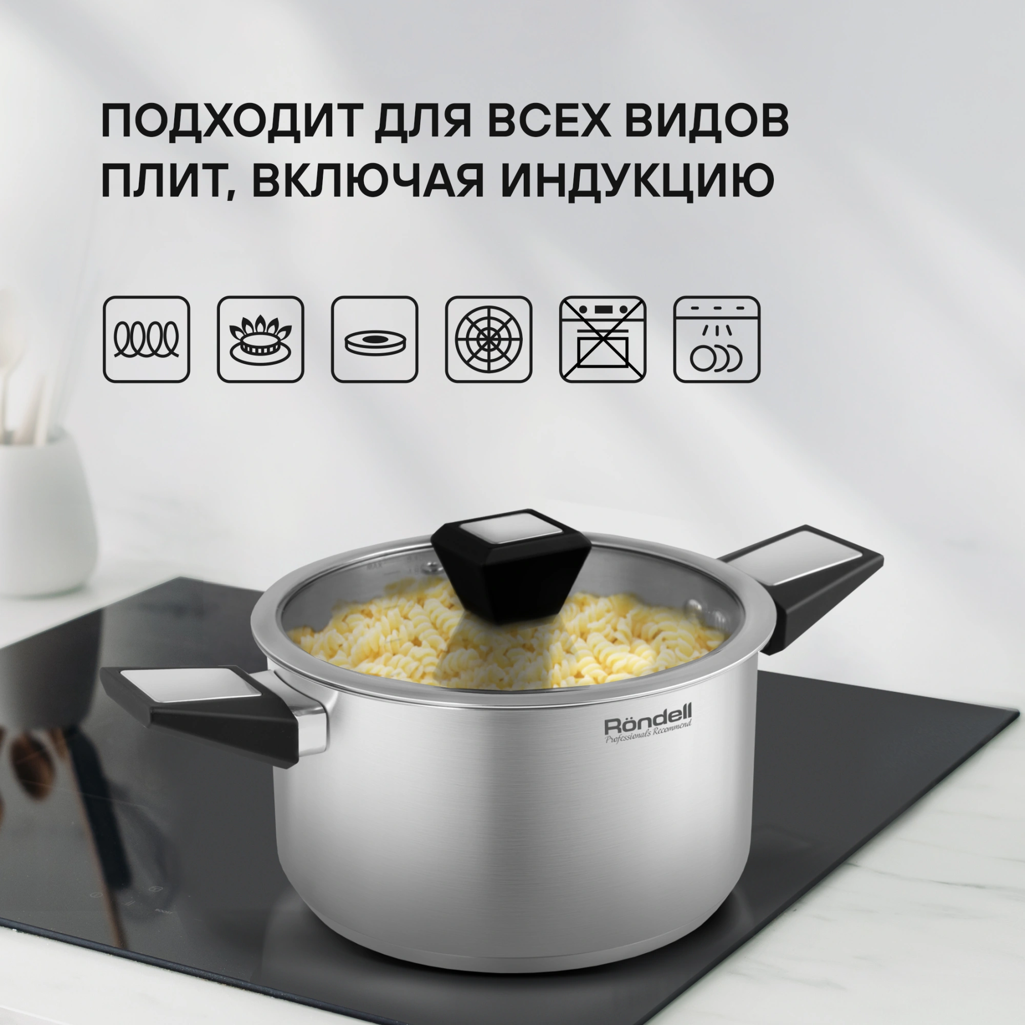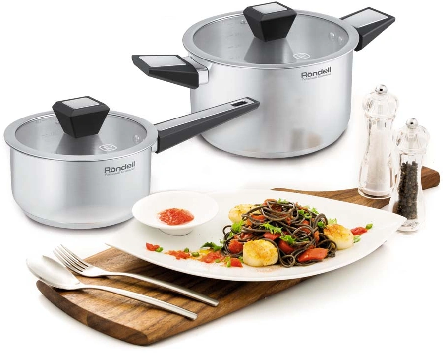 Технология: тройное вштампованное, а затем вплавленное дно без воздушных полостей. Аксессуары: cтильные бакелитовые ручки со стальными вставками. Преимущества: эргономичная форма ручек; Плоская крышка из термостойкого стекла с паровыпуском и широким металлическим ободом.