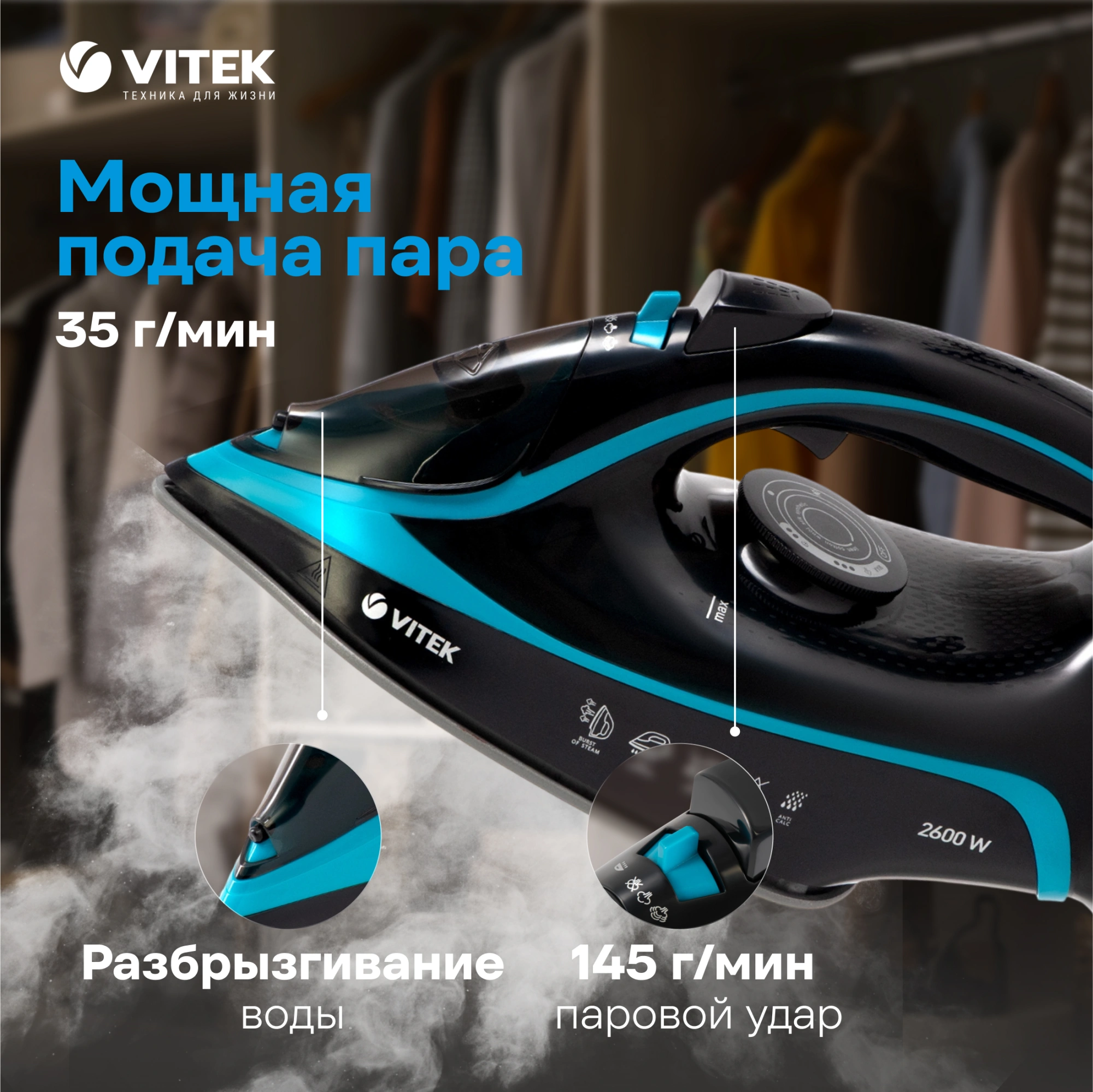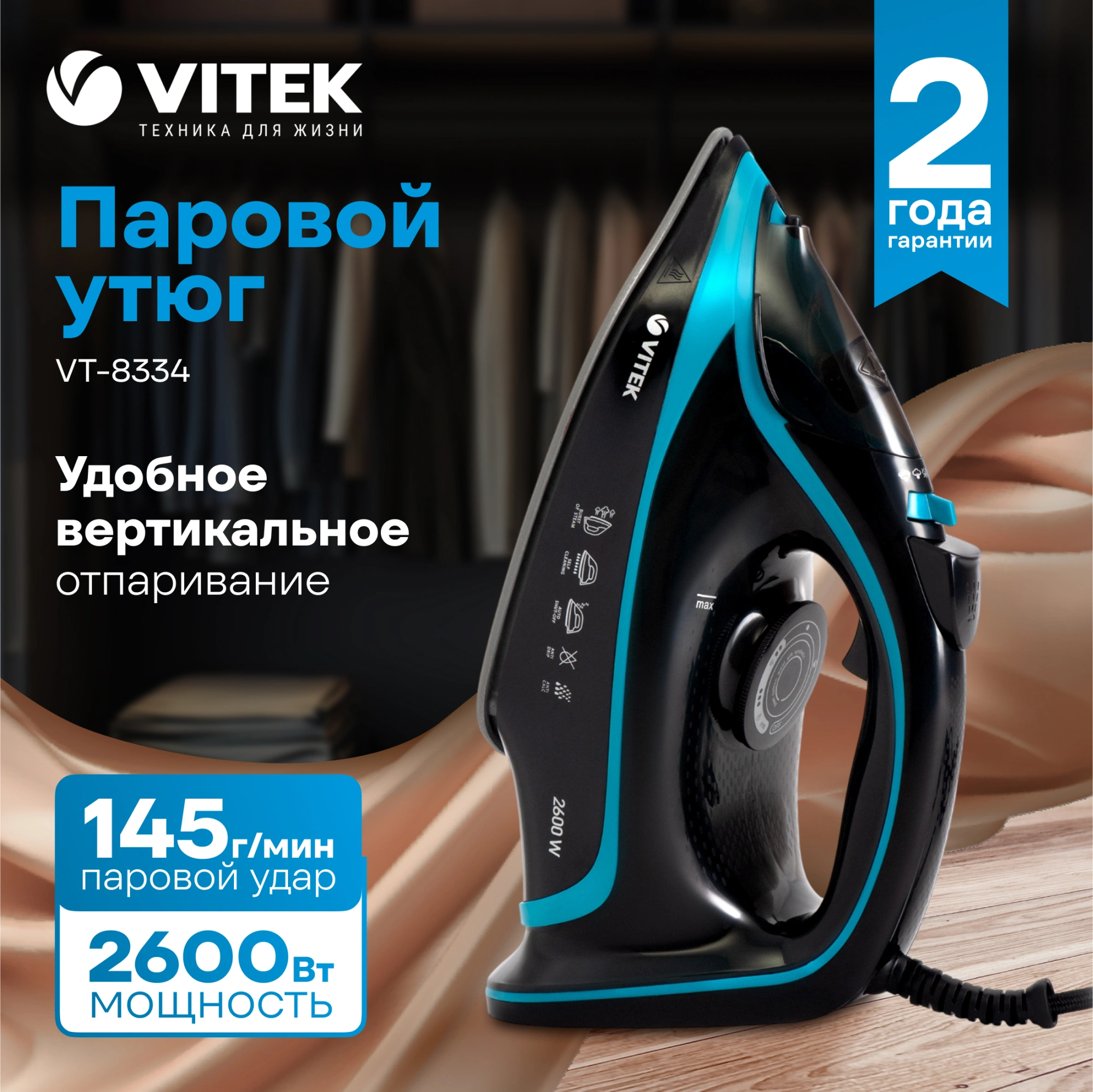 Утюг VITEK VT-8334 с максимальной мощностью 2600 Вт поможет быстро и легко привести в порядок вашу одежду. Подошва прибора имеет уникальное двойное керамическое покрытие UniCera, которое обеспечивает легкое скольжение по любому виду ткани. При наличии серьезных заломов на ней можно воспользоваться функцией разбрызгивания. В режиме отпаривания утюг очень эффективен: паровой удар в 145 г/мин гарантирует идеальный результат. Встроенная защита от накипи, а также система самоочистки и функция «Антикапля» способствуют особому комфорту в использовании прибора. Купите утюг VITEK VT-8334 и получайте удовольствие от обычной заботы о вещах!