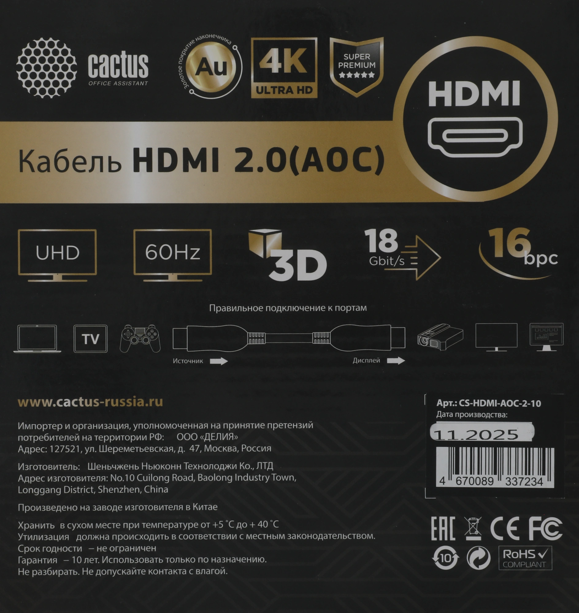 Кабель AOC HDMI 2.0 обладает пропускной способностью до 18 Гбит/c, поддерживает передачу изображения с расширенным динамическим диапазоном HDR 4:4:4 в формате 4K с частотой до 60Hz, и 3D-графику, благодаря чему вы получите потрясающую четкую картинку и яркие цвета на большом экране. Использование оптического кабеля уменьшает риск возникновения электромагнитных и радиопомех, передавая сигнал в любых сложных условиях. Данный кабель полностью совместим с портами HDMI более ранних версий.
