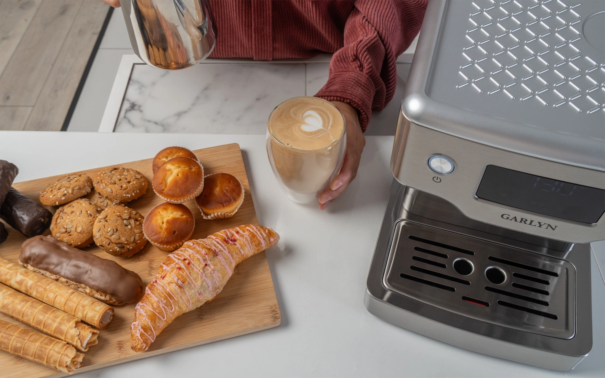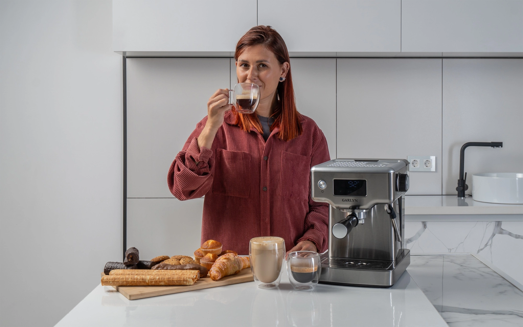дисплей, капучинатор, панель для подогрева чашек, регулируемый по высоте дозатор кофе, съемный поддон для капель, съемный резервуар для воды, темпер