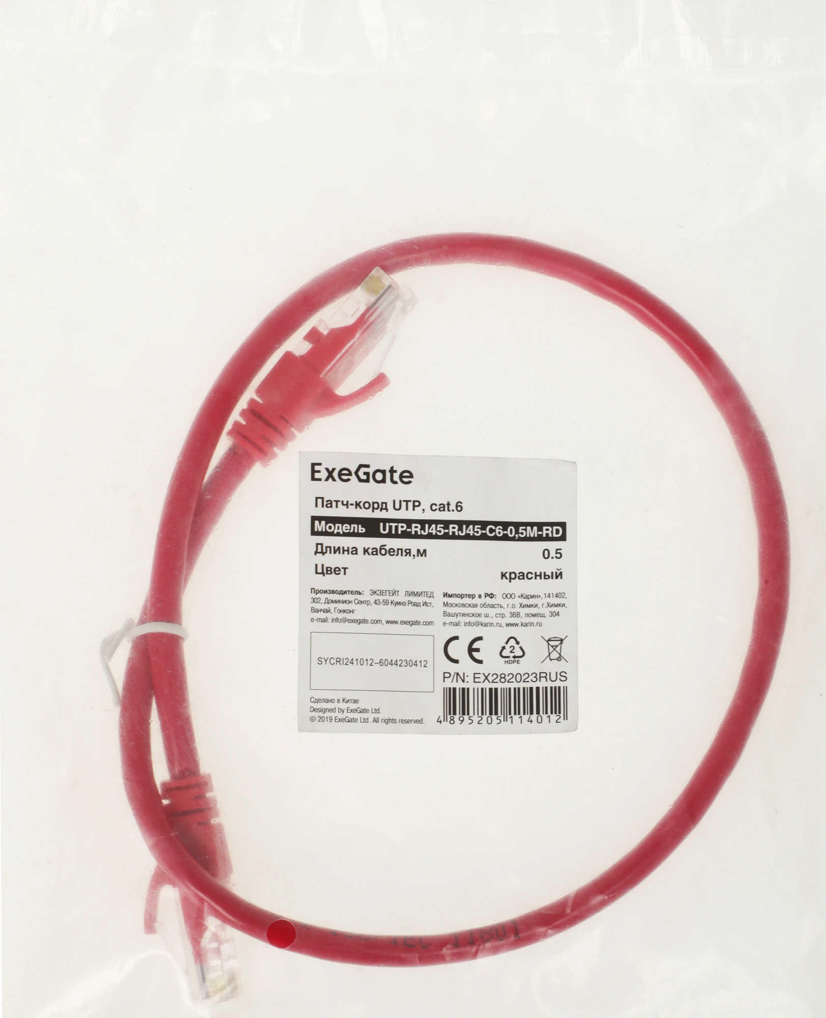 Патч-корд Exegate UTP-RJ45-RJ45-C6-0,5M-RD