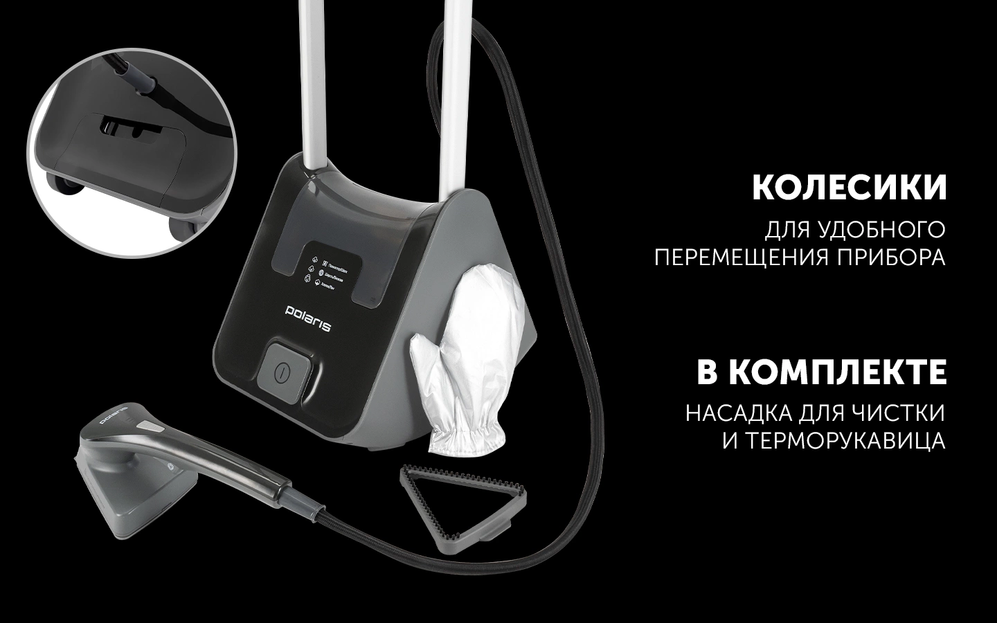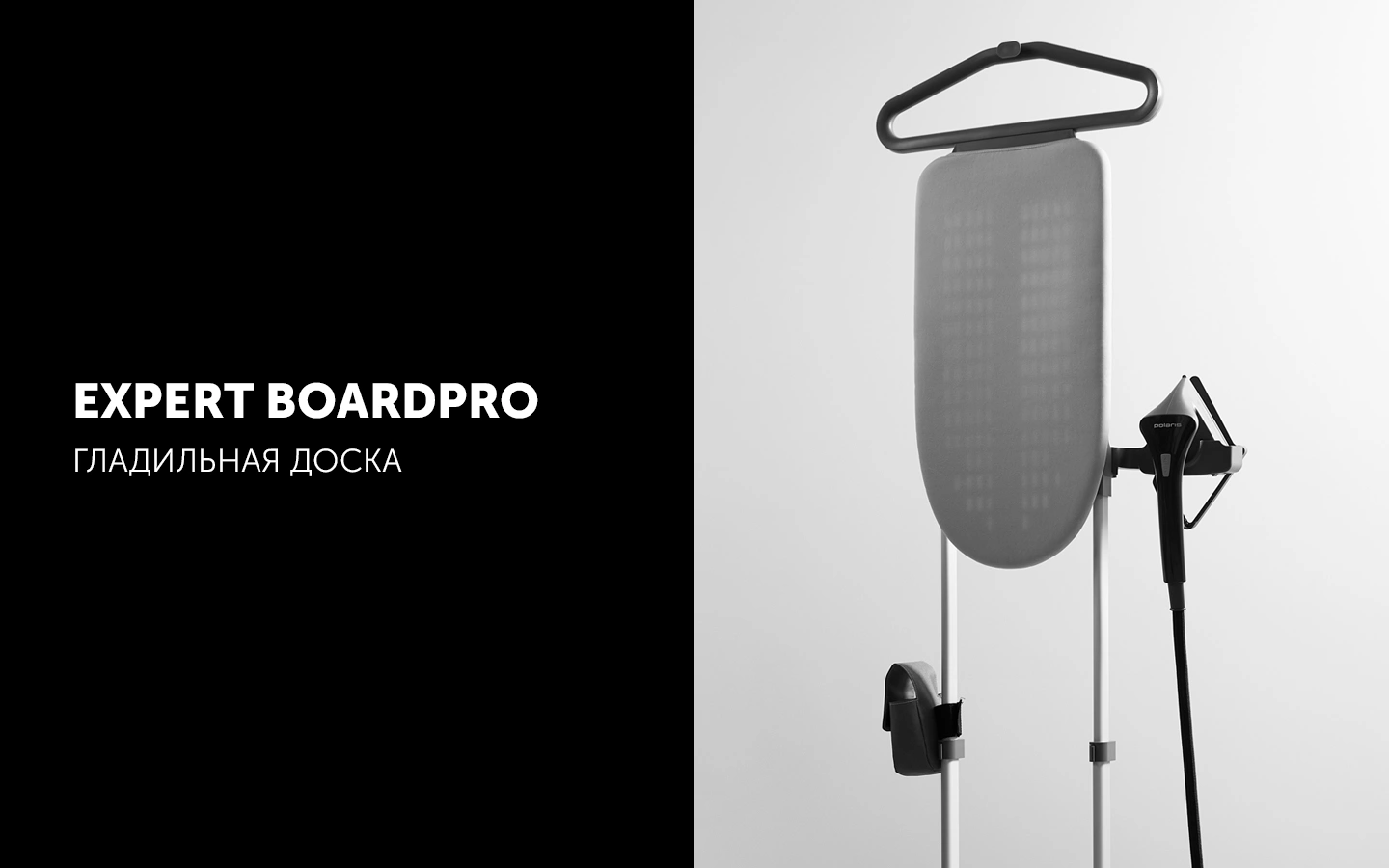 Колесики для удобного перемещения прибора; гладильная доска Expert BoardPRO; насадка для чистки и терморукавица в комплекте; удобный отсек для хранения шнура