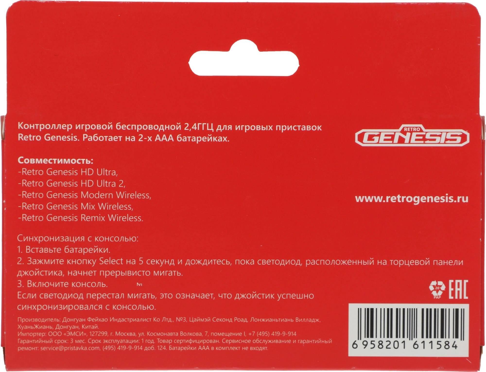 Контроллер игровой беспроводной 2,4ГГЦ для игровых приставок Retro Genesis.. Совместимость: Retro Genesis HD Ultra, Retro Genesis HD Ultra 2, Retro Genesis Modern Wireless, Retro Genesis Mix Wireless, Retro Genesis Remix Wireless. Работает на 2-х ААА батарейках.