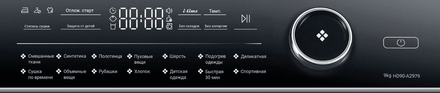 Синтетика, Смешанные ткани, Деликатная, Шерсть, Хлопок эко, Детская одежда, Сушка по времени, Объемные вещи, Полотенца, Пуховое одеяло, Рубашки, Подогрев одежды, Быстрая 30 мин, Спортивная