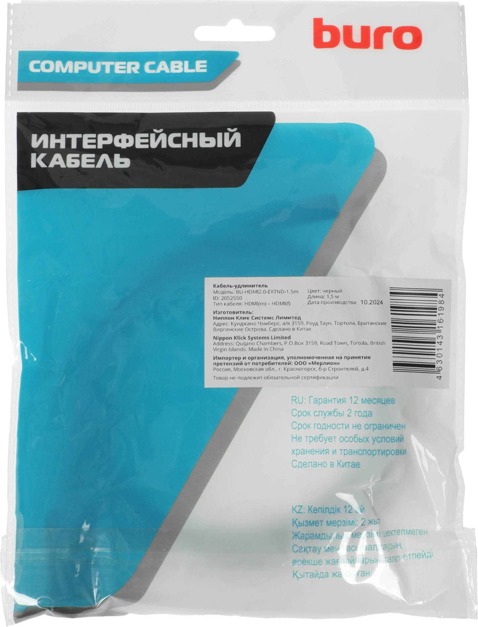 Кабель-удлинитель аудио-видео Buro HDMI (m)/HDMI (f) 1.5м. позолоч.конт. черный (BU-HDMI2.0-EXTND-1.5M)