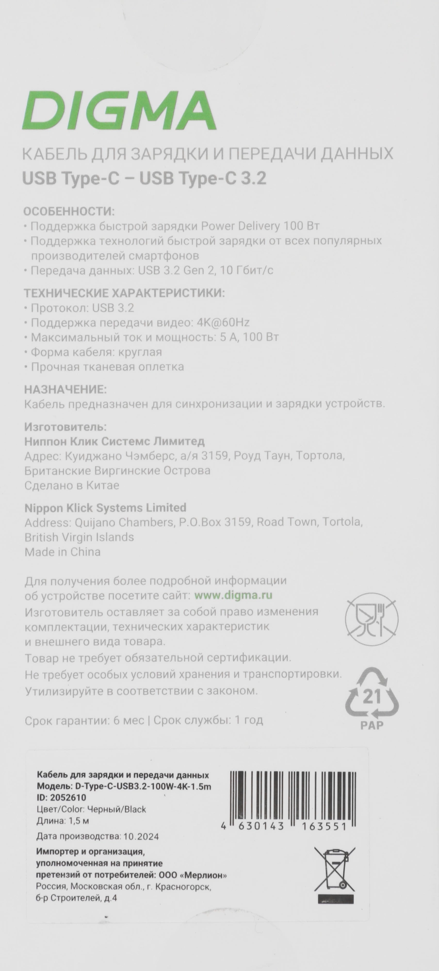 Кабель Digma D-TYPE-C-USB3.2-100W-4K-1.5M USB Type-C (m)-USB Type-C (m) 1.5м черный