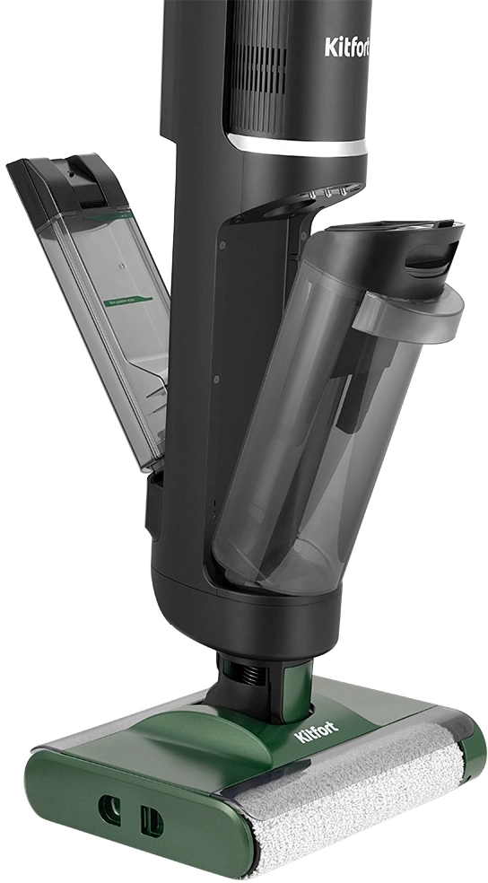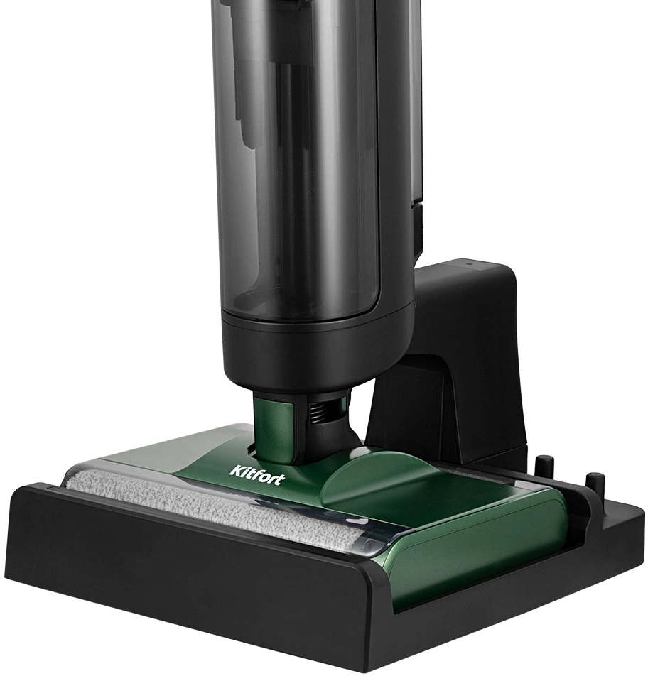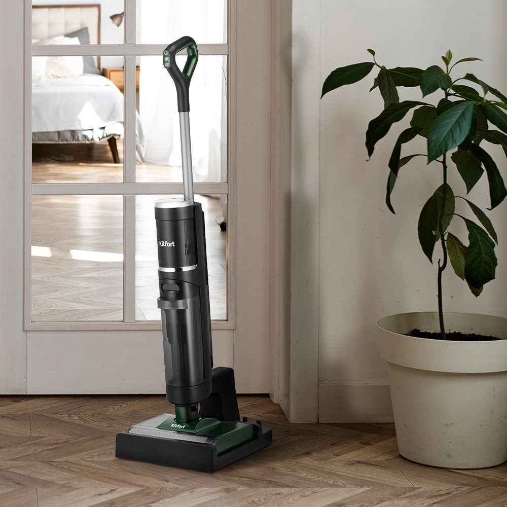 Вертикальный беспроводной моющий пылесос КТ-5259 очень удобен для проведения сухой и влажной уборки. По умолчанию устройство подает воду на валики турбощётки. Для сильных загрязнений предусмотрена усиленная подача воды.