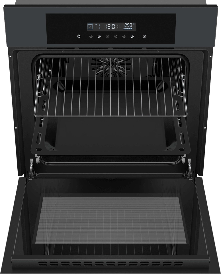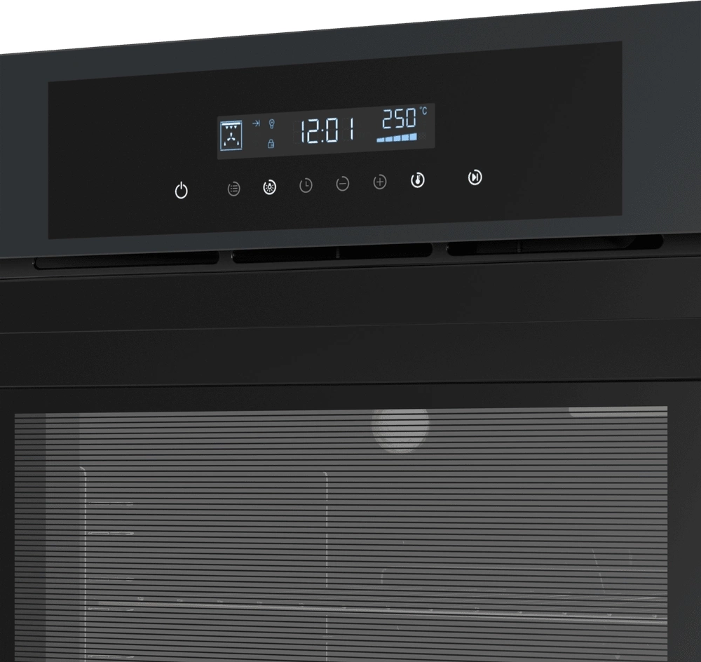 вентилятор охлаждения, дисплей, полностью стеклянная внутренняя поверхность дверцы духовки, телескопические направляющие