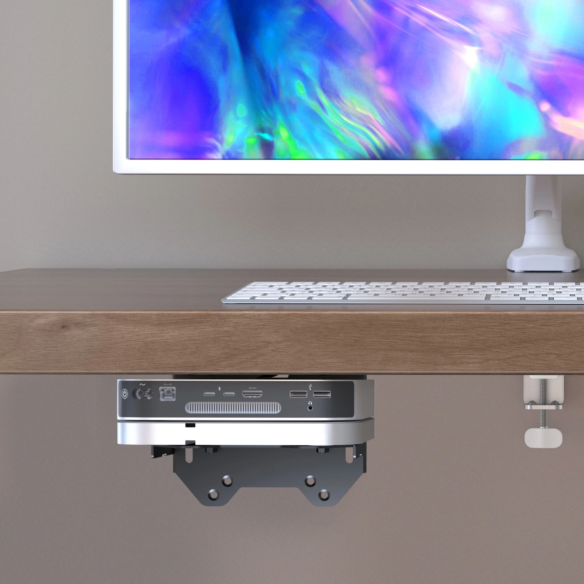 Позволяет размещать мини ПК, Mac mini, ноутбуки, неттопы, планшеты, клавиатуры, смарт-боксы, роутеры, ресиверы спутниковых операторов и компьютерные аксессуары.