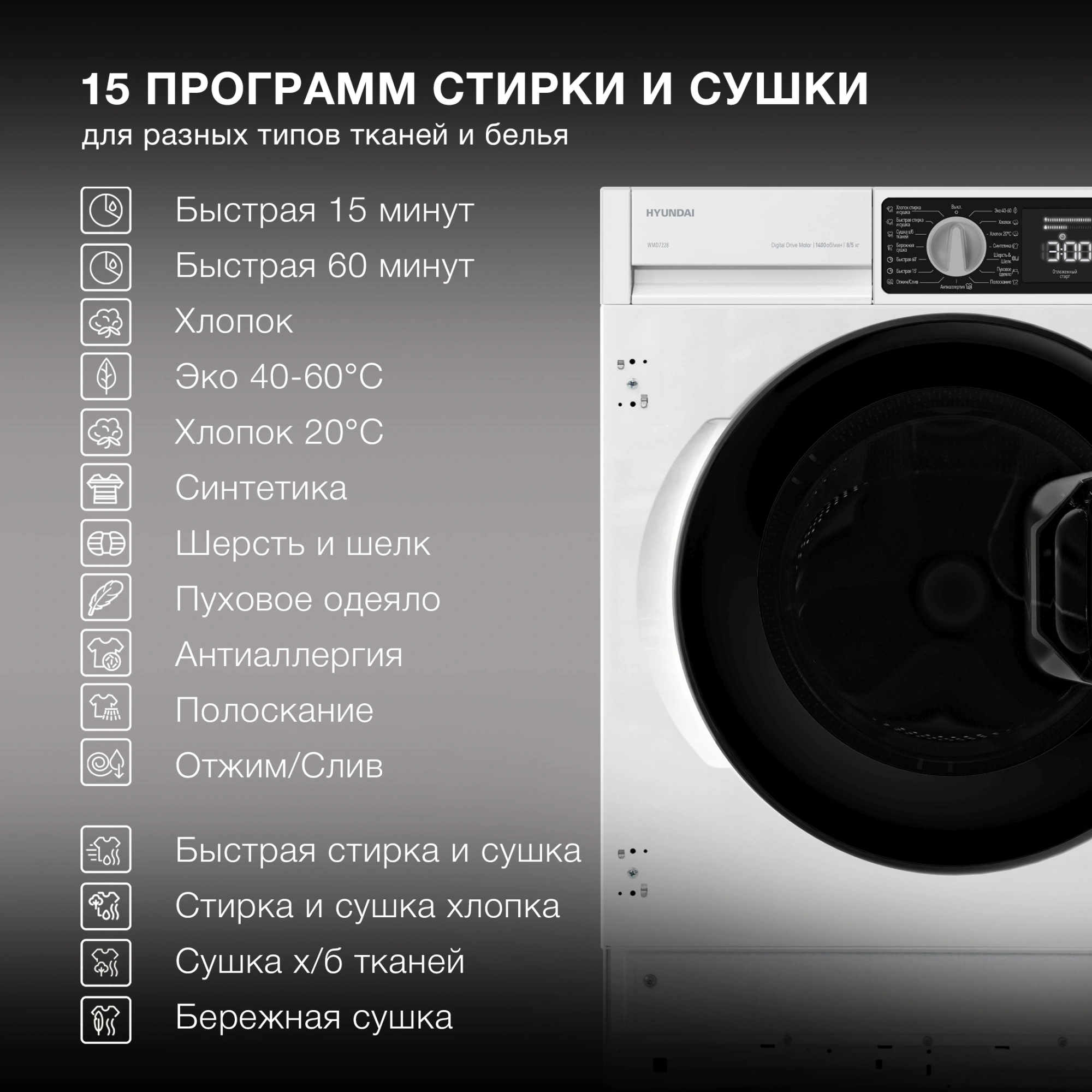 ECO 40-60, Хлопок, Хлопок 20°C, Синтетика, Шерсть и шелк, Пуховое одеяло, Антиаллергия, Полоскание, Отжим/Слив, Быстрая стирка 15 мин, Быстрая стирка 60 мин, Стирка и сушка хлопка, Быстрая стирка и сушка, Сушка х/б тканей, Бережная сушка