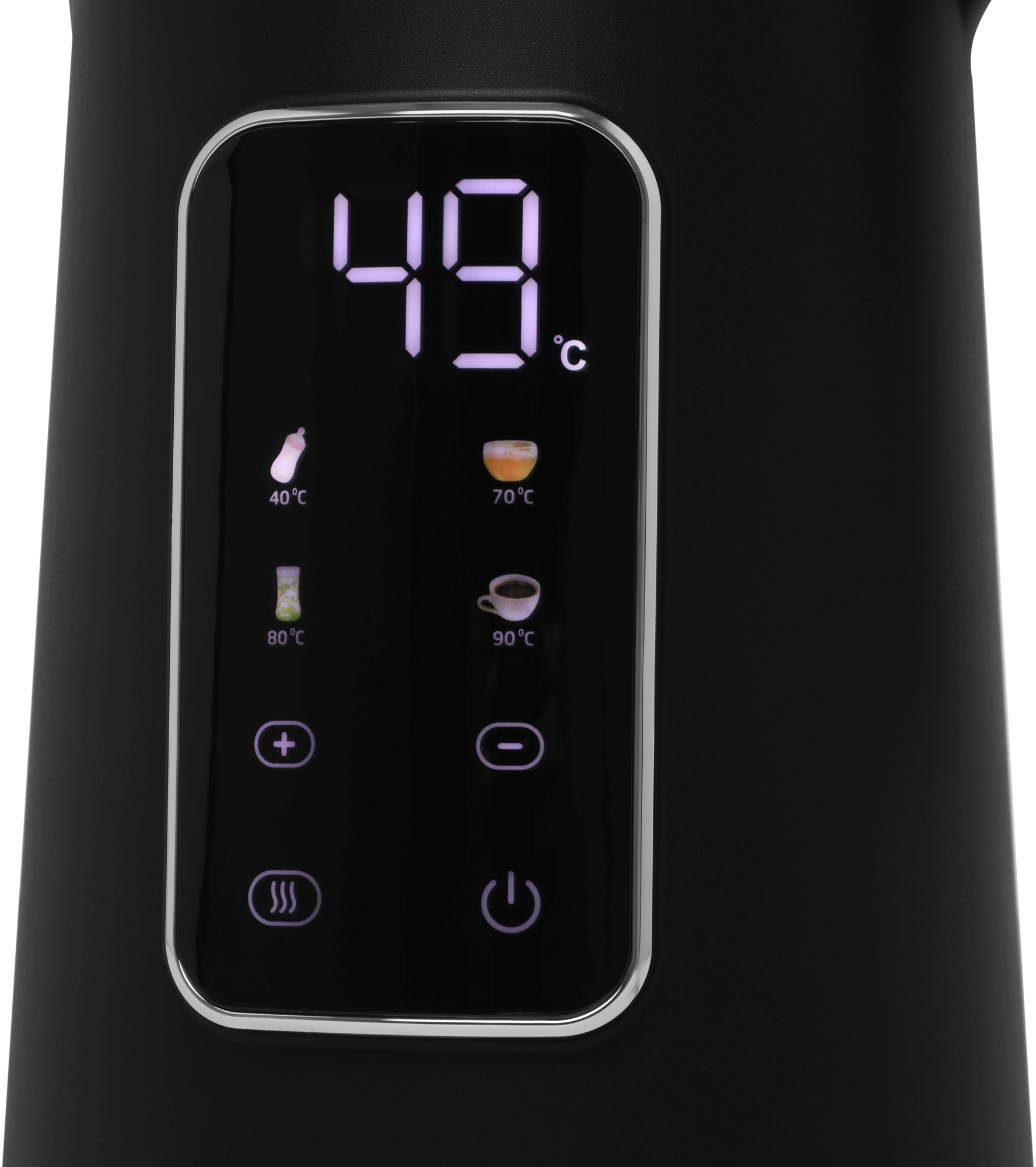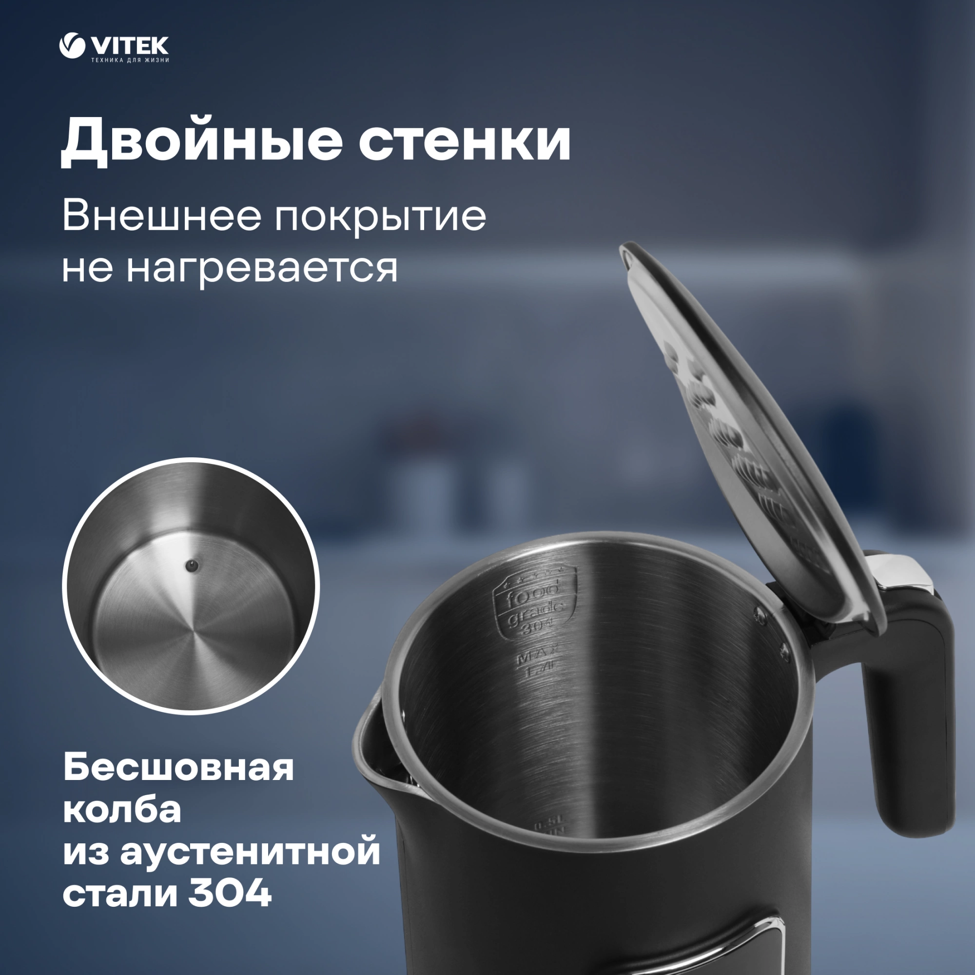 Стильный чайник VITEK VT-1162 с корпусом из термостойкого пластика и нержавеющей стали станет одним из самых желанных аксессуаров на вашей кухне. Отличительной особенностью модели являются двойные стенки корпуса и большой сенсорный дисплей с индикацией температурных режимов. Смотрится очень стильно и современно! Благодаря многофункциональности чайника Вы сможете каждый день угощать своих близких идеально приготовленными горячими напитками. С мощностью (2200 Вт) электрочайник VT-1162 в считанные минуты вскипятит воду (1,7 л) или нагреет ее до нужной температуры. В чайнике предусмотрено 4 режима для подогрева воды — 40°С, 70°С, 80°С, 90°С, а также функция поддержания температуры (до 2 часов). Тринадцать режимов регулировки температуры нагрева воды от 40°С до 100°С позволят заваривать кофе, зеленый, белый чай или приготовить детское питание водой правильной температуры. Благодаря технологии Cool touch он абсолютно безопасен в работе: поверхность не нагревается в процессе кипячения воды! Чайник соединён с базой центральным контактом и легко вращается на 360?C градусов, обеспечивая полную свободу передвижения. Нагревательный элемент чайника VT- 1162 встроен в плоское дно и надежно защищен стальной пластиной, это позволяет не только сделать чайник привлекательным даже изнутри, но и делает его чистку максимально удобной. В чайнике VT- 1162 три степени безопасности: защита от перегрева, автоматическое выключение при закипании и отсутствии воды. Купите чайник VITEK VT-1162 и наслаждайтесь любимыми напитками!