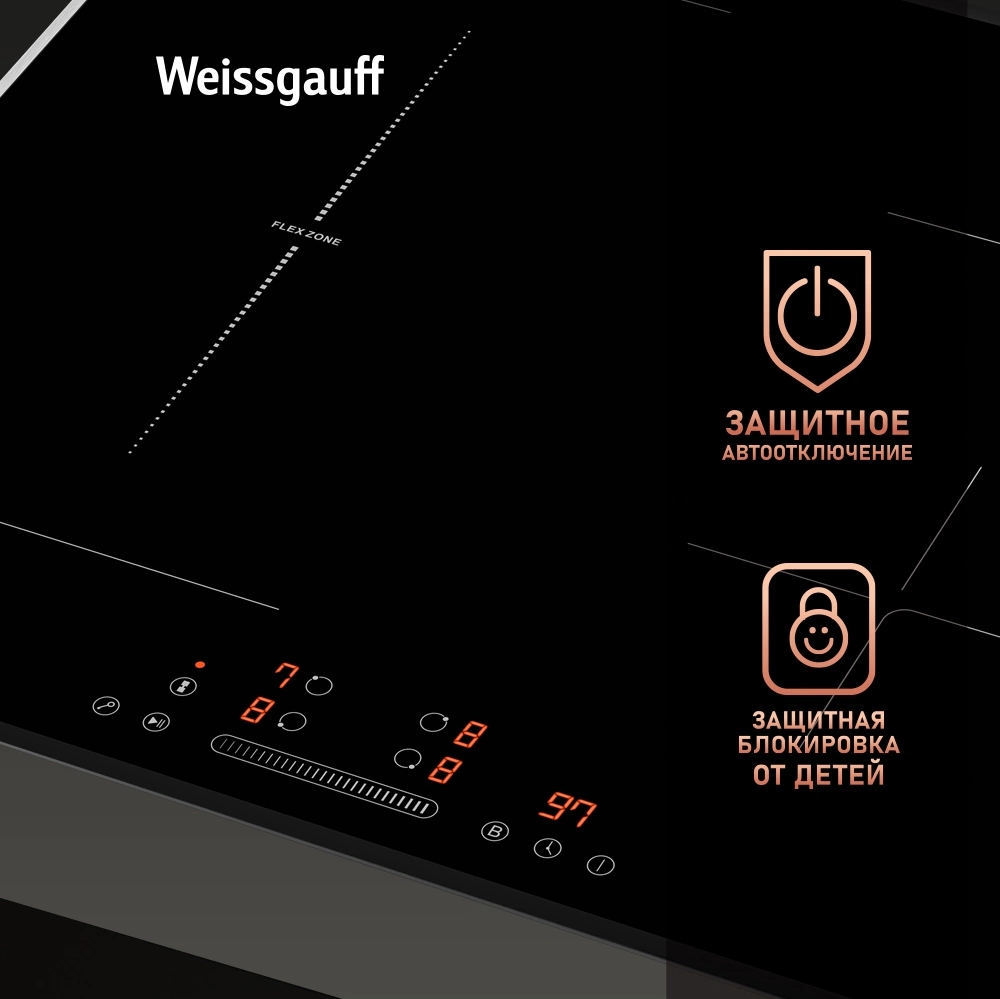 блокировка управления (защита от детей), защитное отключение, распознавание наличия посуды