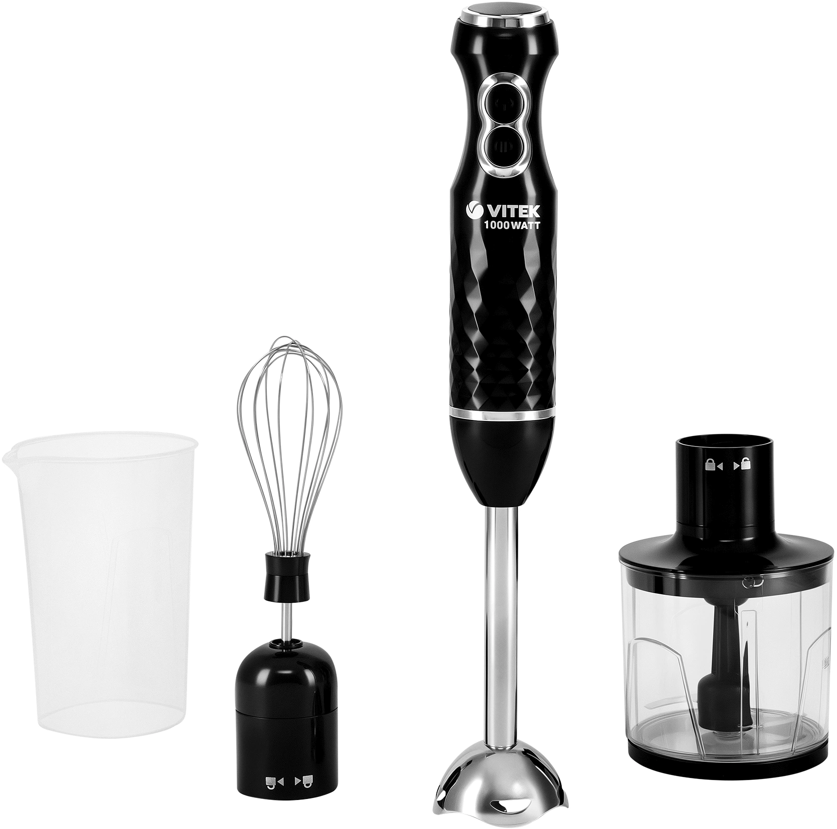 Блендерный набор VITEK VT-1478 с максимальной мощностью 1000 Вт поможет быстро и эффективно приготовить коктейль или смузи, пюрировать суп, измельчить до гладкости составляющие соуса. Погружная часть прибора, насадка-венчик для взбивания, а также лезвия для измельчения продуктов выполнены из нержавеющей стали, обеспечивающей прибору долгий и надежный срок службы. Блендер имеет 2 скорости, необходимые для комфортного приготовления блюд в домашних условиях. В комплект с набором входят стакан для смешивания емкостью 600 мл и чаша измельчителя объемом 300 мл. Длина сетевого шнура составляет 110 см. Купите погружной блендер VITEK VT-1478, который позволит вам получать удовольствие от кулинарного творчества на домашней кухне!