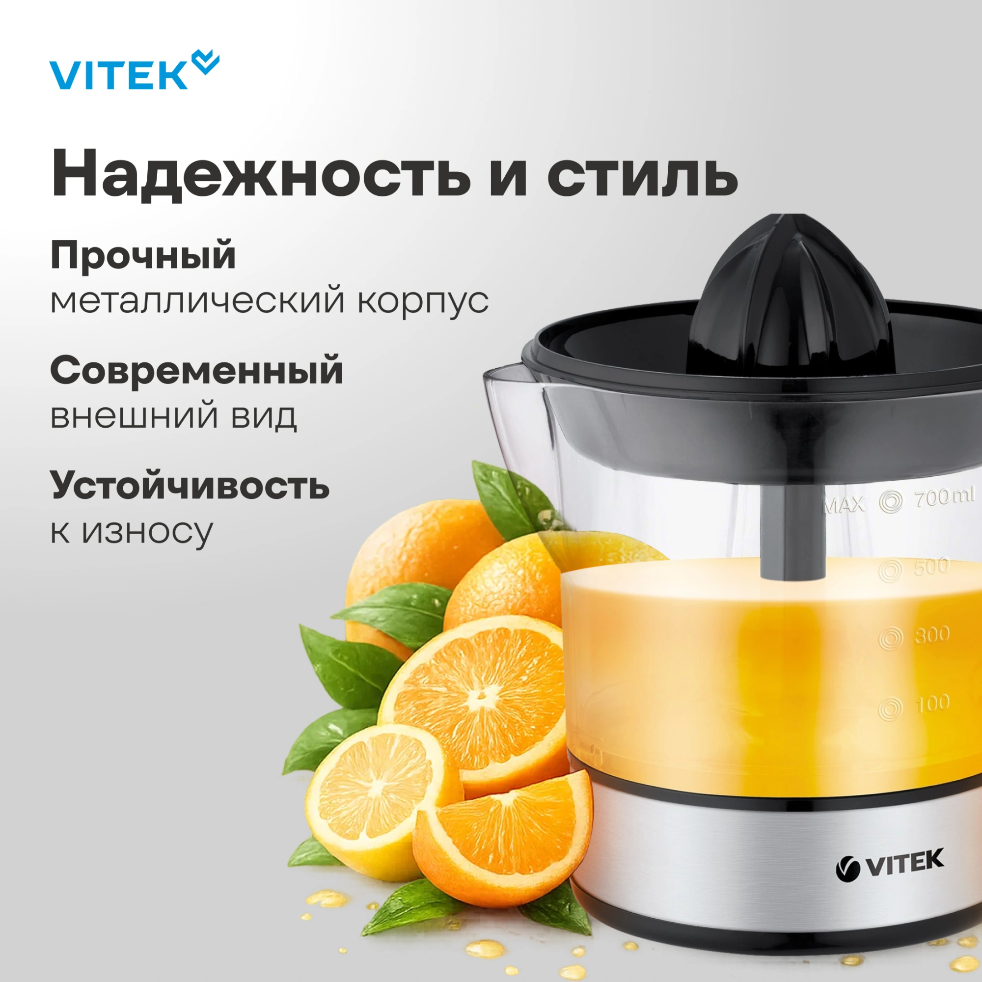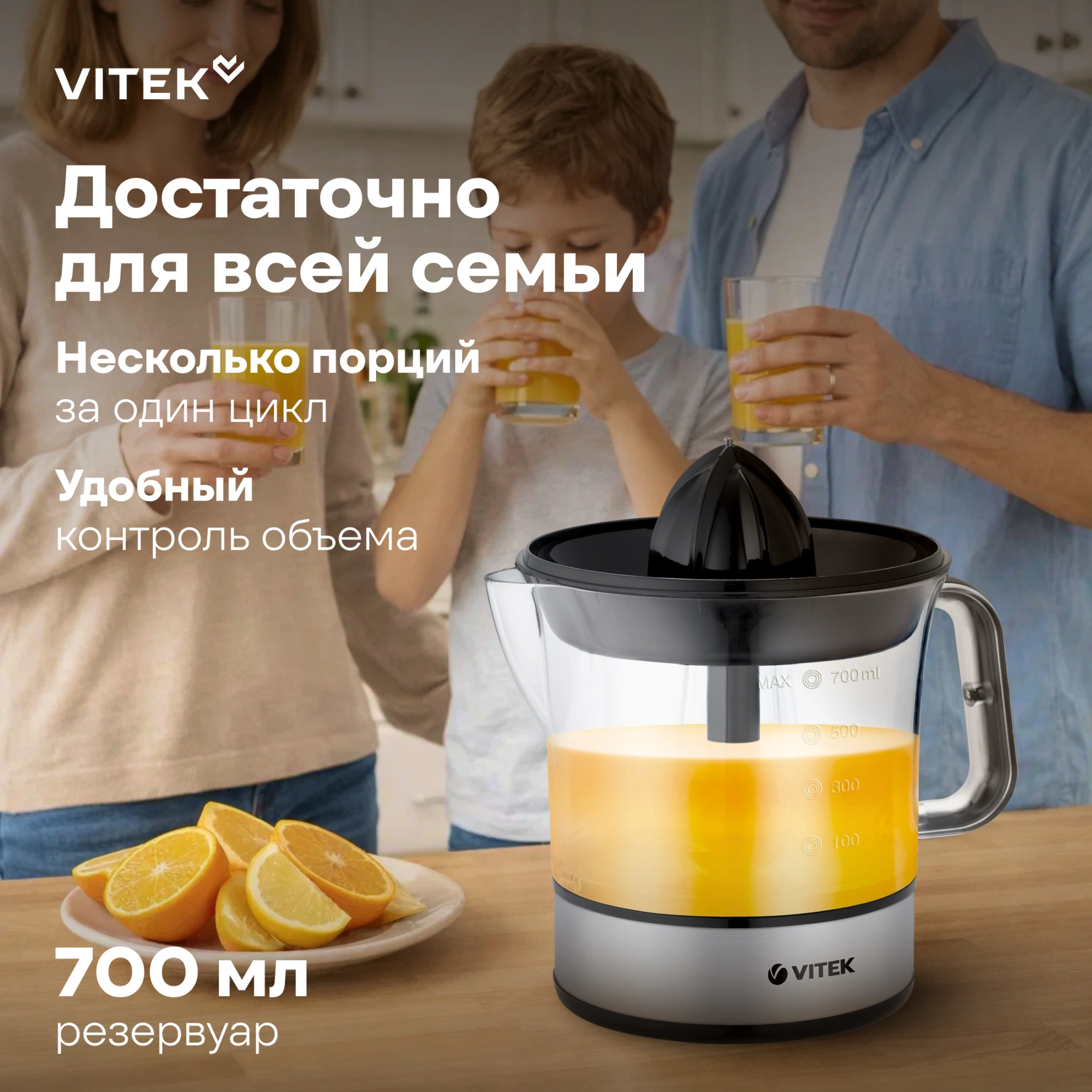 Любите начинать день со стакана апельсинового, грейпфрутового или даже лимонного сока? Тогда без цитрусовой соковыжималки VITEK VT-3669 просто не обойтись! Ее мощность в 25 Вт позволяет быстро и легко извлекать сок из плодов, которые вам потребуется лишь разрезать на половинки. Сетка фильтра изготовлена из высококачественной нержавеющей стали, нейтральной к кислоте, что делает этот материал устойчивым к коррозии. А значит, прибор прослужит вам действительно долго! Сок, проходя через такой фильтр, сохранит по максимуму все витамины, которыми богаты цитрусовые. Емкость чаши составляет 0,7 л: она выполнена из прозрачного пластика, что позволяет контролировать уровень сока. Пользоваться прибором удобно благодаря наличию двух конусов: малого для мелких лимонов и лаймов, а также большого для апельсинов, грейпфрутов и помело. Установите половинку фрукта на конусную насадку, нажмите для включения электромотора и вращайте в разные стороны, чтобы свежий сок стекал через решетку фильтра в чашу. Благодаря прорезиненным ножкам, пользоваться прибором очень удобно: он устойчиво стоит на любой поверхности. Купите цитрусовую соковыжималку VITEK VT-3669 и приготовьте любимые напитки тогда, когда этого захочется!