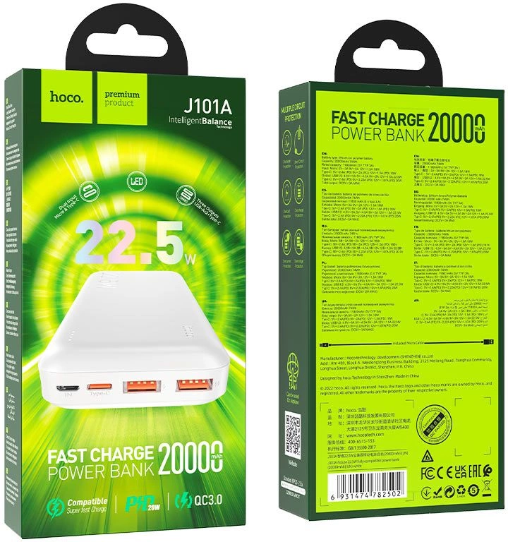 20000mAh QC3.0/PD2.0 22.5W 3A 2xUSB-A/USB-C белый...