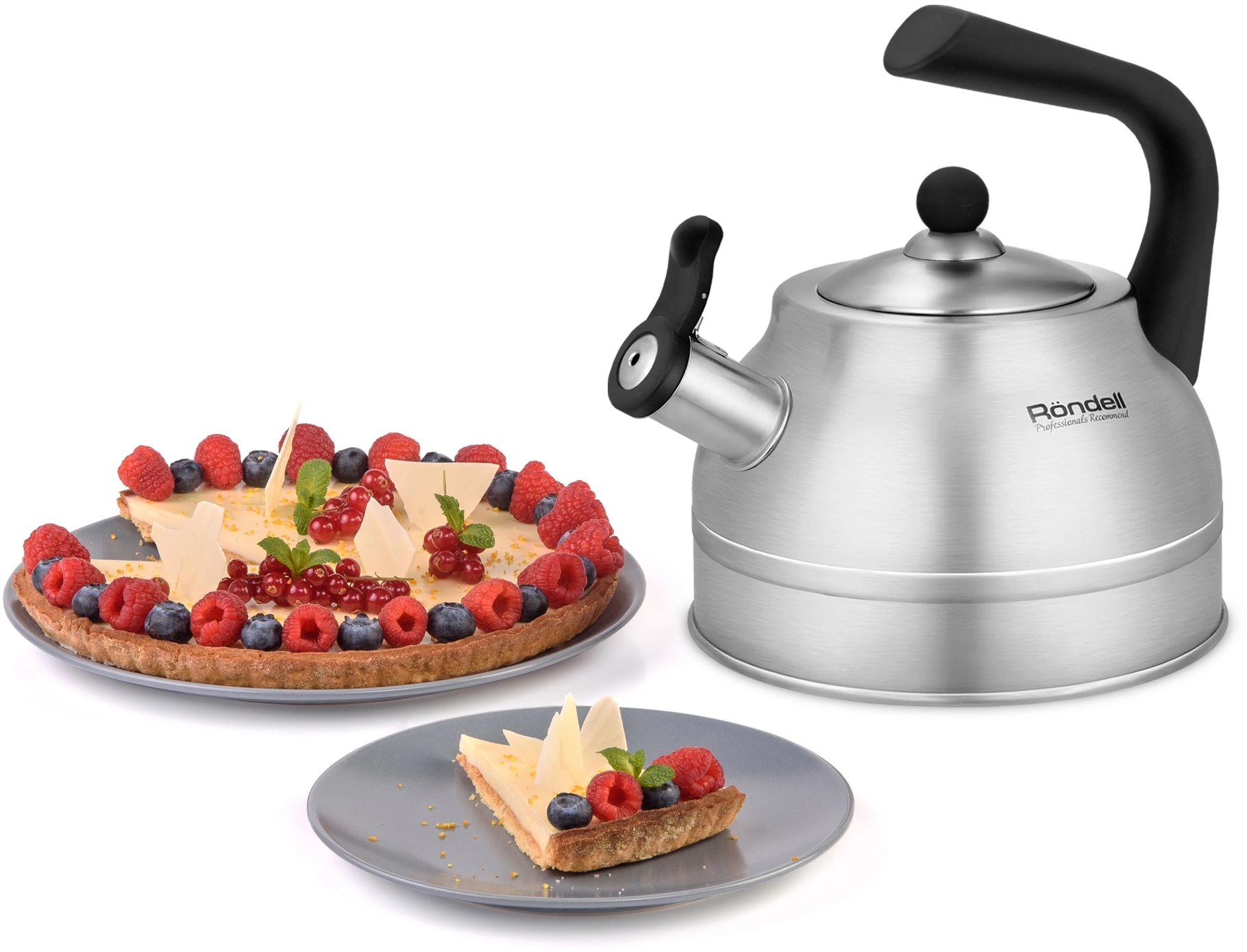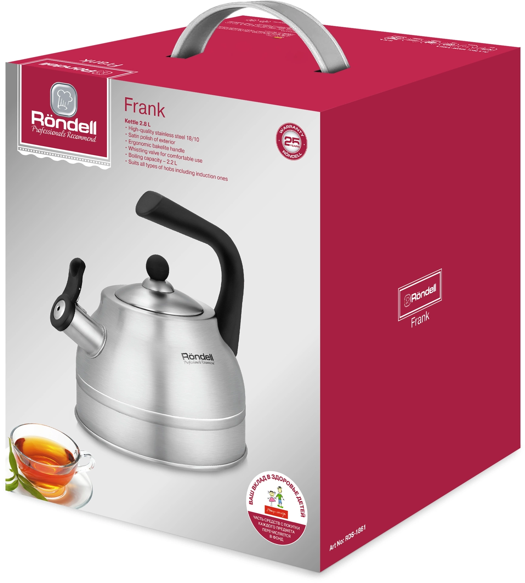 Эффектная матированная полировка. Аксессуары: прочные ненагревающиеся бакелитовые. Преимущества: цельный индукционный диск. Удобный хват. Возможность налива воды одной рукой. Бакелитовый свисток со стальной сердцевиной. Упаковка: подарочная коробка с ручкой.