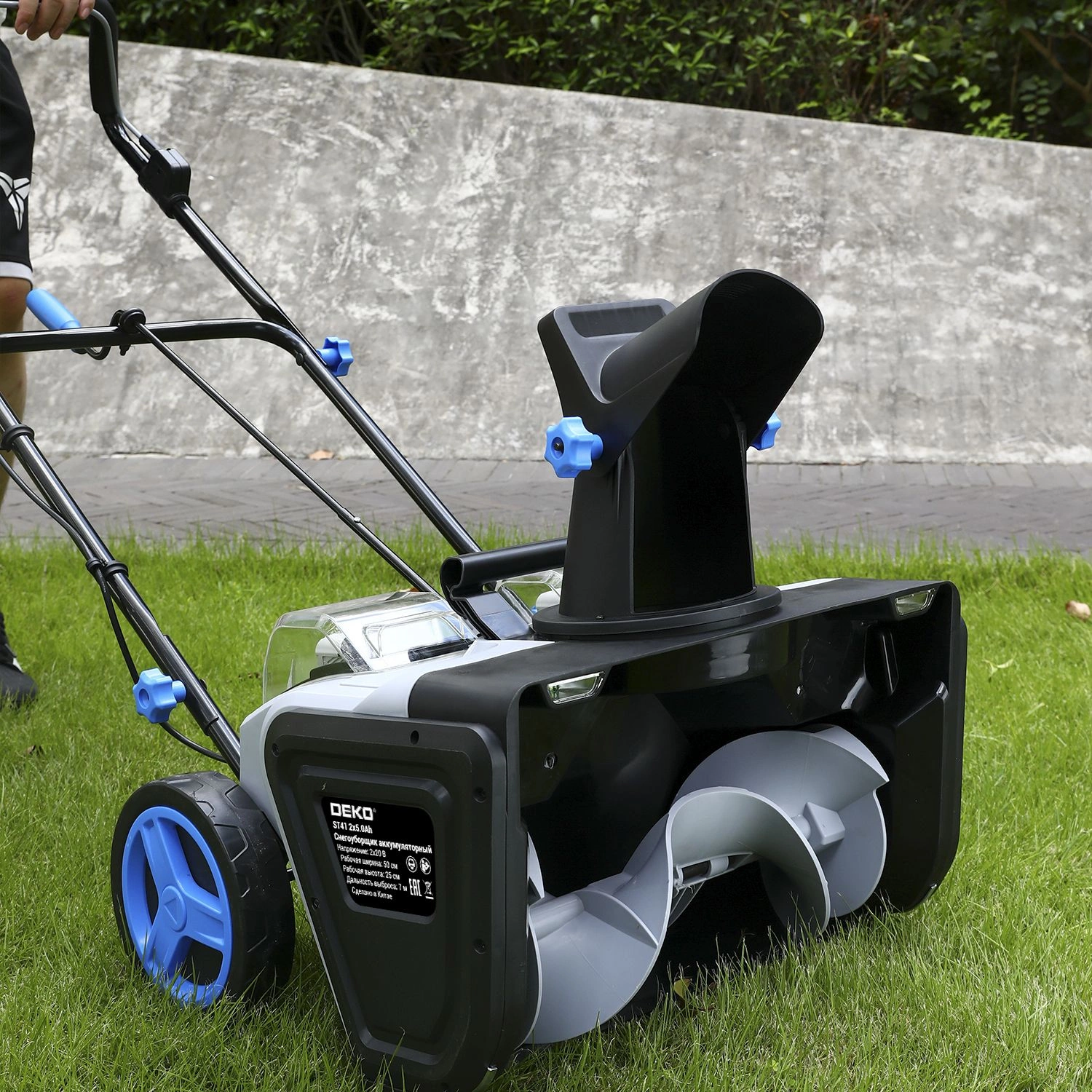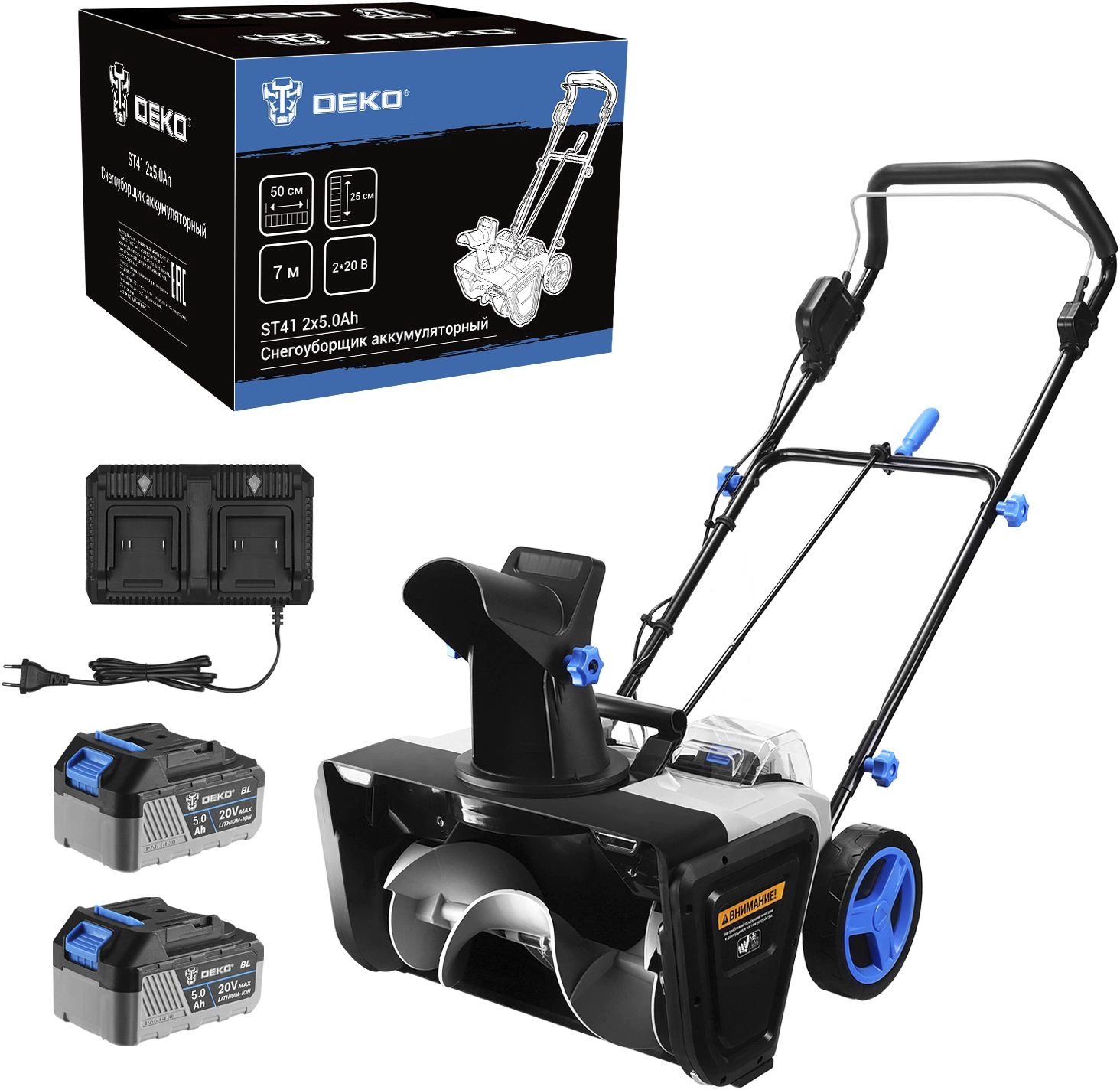 Снегоуборщик аккумуляторный Снегоуборщик аккумуляторный DEKO ST41, 2*20В, 2*5.0Ач, 50см, 2 фары предназначен для уборки небольших территорий от снега. Основная и дополнительная ручки способствуют лучшему удержанию устройства. Снегоуборщик аккумуляторный оснащен телескопической ручкой.