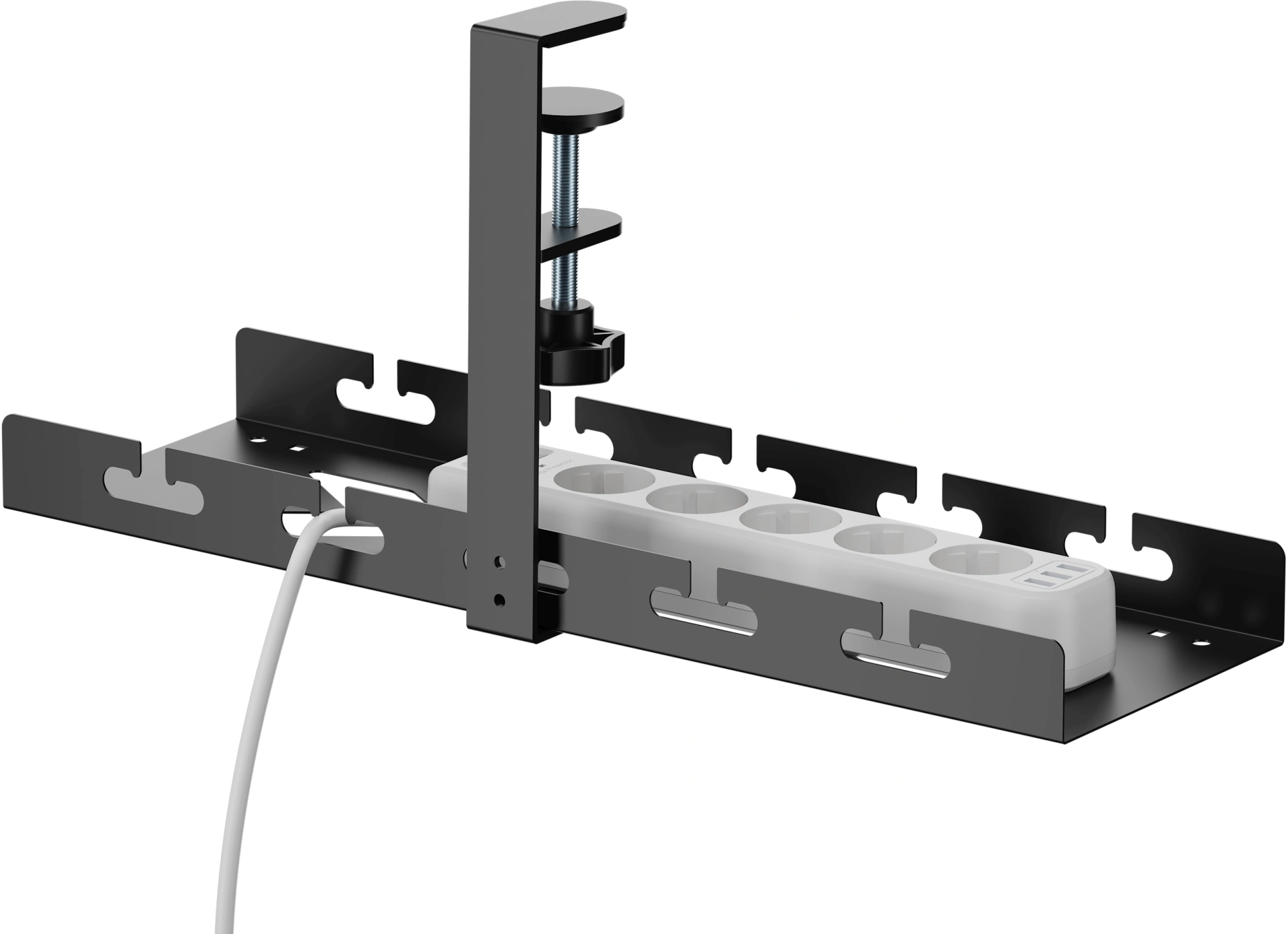 Кабель-канал с подстольным размещением позволит спрятать провода и навести порядок не только на столе, но и под ним, создавая условия для лёгкого доступа ко всем подключённым устройствам. Открытая конструкция обеспечивает вентиляцию, помогая избежать перегрева, а с помощью специального зажима, кабель-канал можно легко и надежно зафиксировать под столешницей. Данный продукт послужит отличным дополнением для компьютерных и игровых столов Cactus, независимо от сложности организации рабочего места.