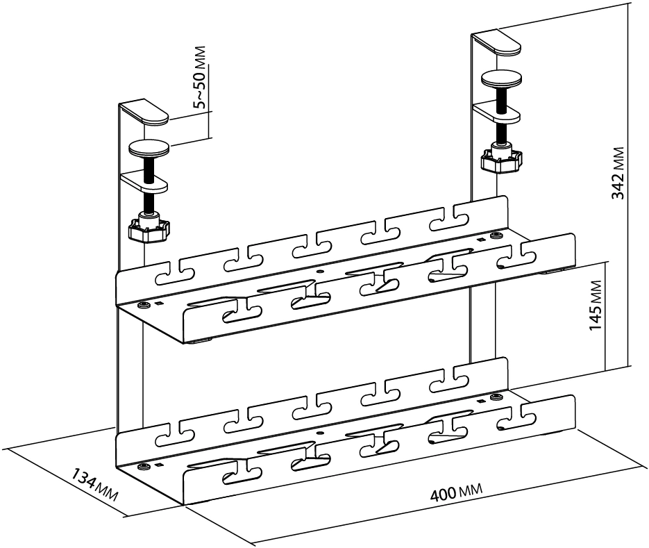 Кабель-канал с подстольным размещением позволит спрятать провода и навести порядок не только на столе, но и под ним, создавая условия для лёгкого доступа ко всем подключённым устройствам. Открытая конструкция обеспечивает вентиляцию, помогая избежать перегрева, а с помощью специального зажима, кабель-канал можно легко и надежно зафиксировать под столешницей. Данный продукт послужит отличным дополнением для компьютерных и игровых столов Cactus, независимо от сложности организации рабочего места.
