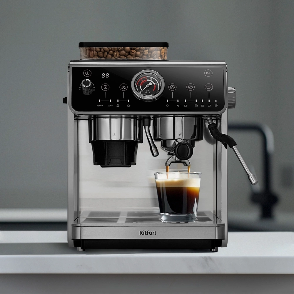 Кофейная станция КТ-7321 сочетает в себе два устройства в одном корпусе. Кофейная станция поможет приготовить кофе эспрессо, американо, капучино или латте, а также множество других видов кофе на ваш вкус.