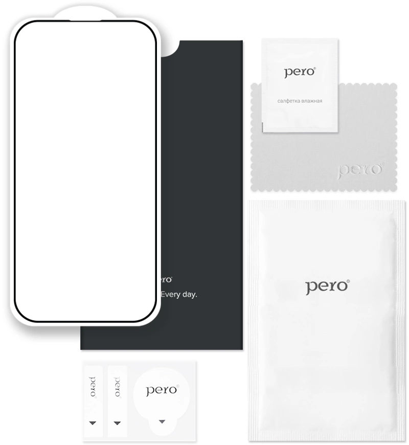Защитное стекло PERO FULL COVER & FULL GLUE GLASS имеет прокрашенную тонкую рамку по периметру. Комплектация: защитное стекло, влажная и сухая салфетка, стикеры для удаления пыли.
