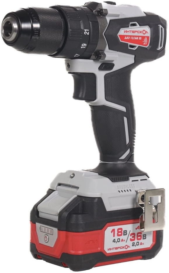 Дрель-шуруповерт, АКБ АПИ 18/36 В емкостью 4/2 А•ч - 2 шт., интеллектуальное зарядное устройство ЗУ-4/18 (арт. 2401.030), съемная клипса для крепления инструмента на поясе, пластиковый кейс, инструкция по эксплуатации и безопасности, гарантийный талон, список сервисных центров.