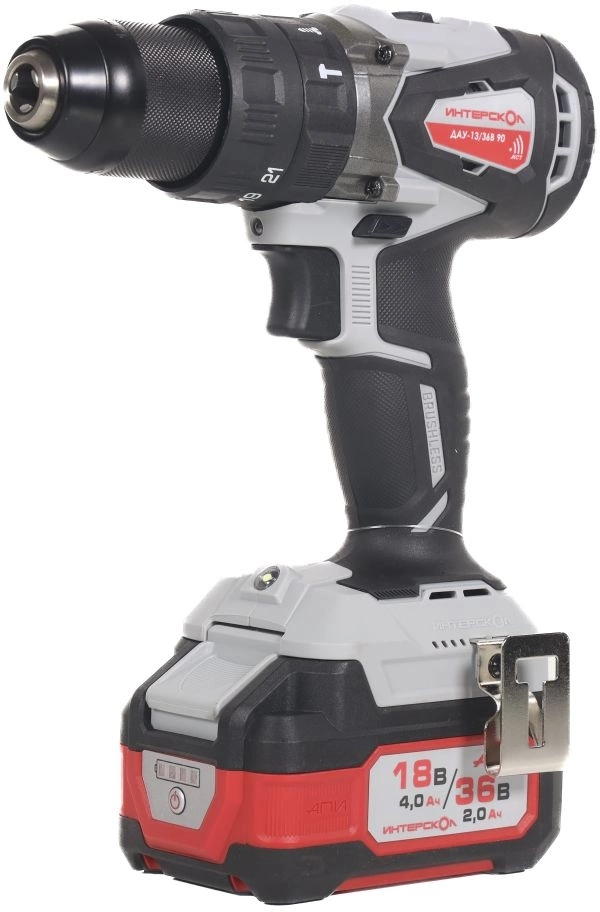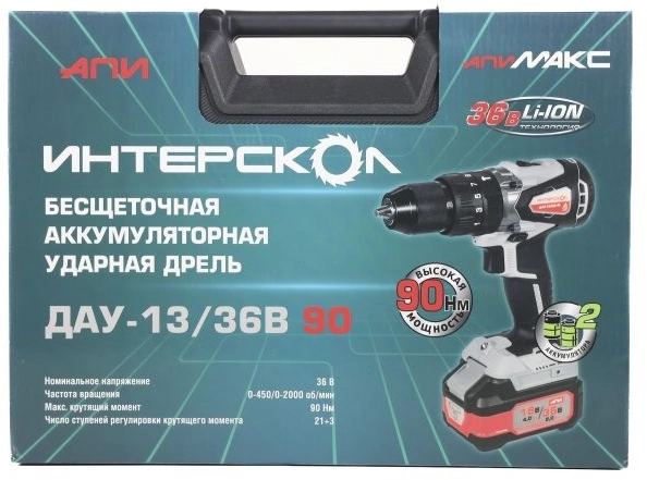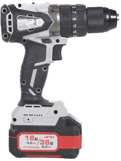 Дрель-шуруповерт, АКБ АПИ 18/36В емкостью 4/2 А•ч - 2 шт., интеллектуальное зарядное устройство ЗУ-4/18 (арт. 2401.030), съемная клипса для крепления инструмента на поясе, пластиковый кейс, инструкция по эксплуатации и безопасности, гарантийный талон, список сервисных центров.