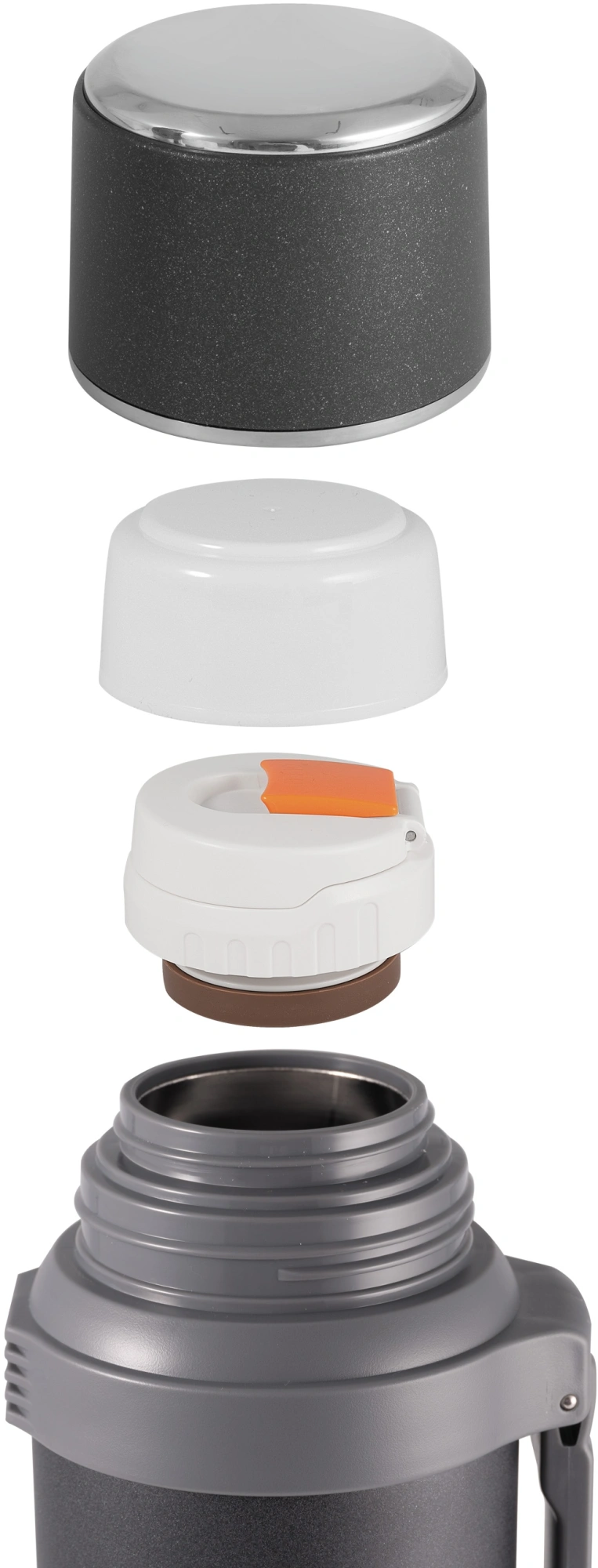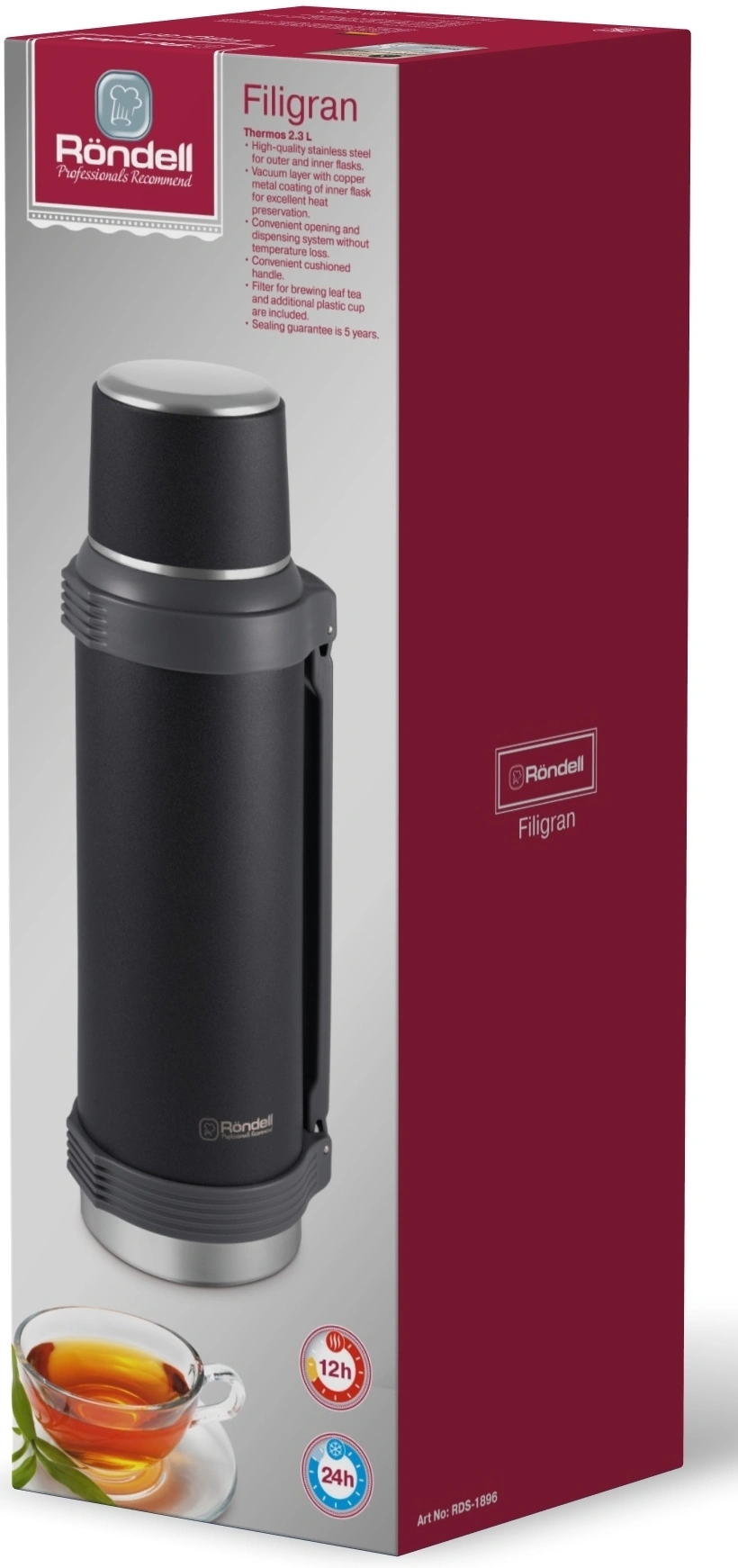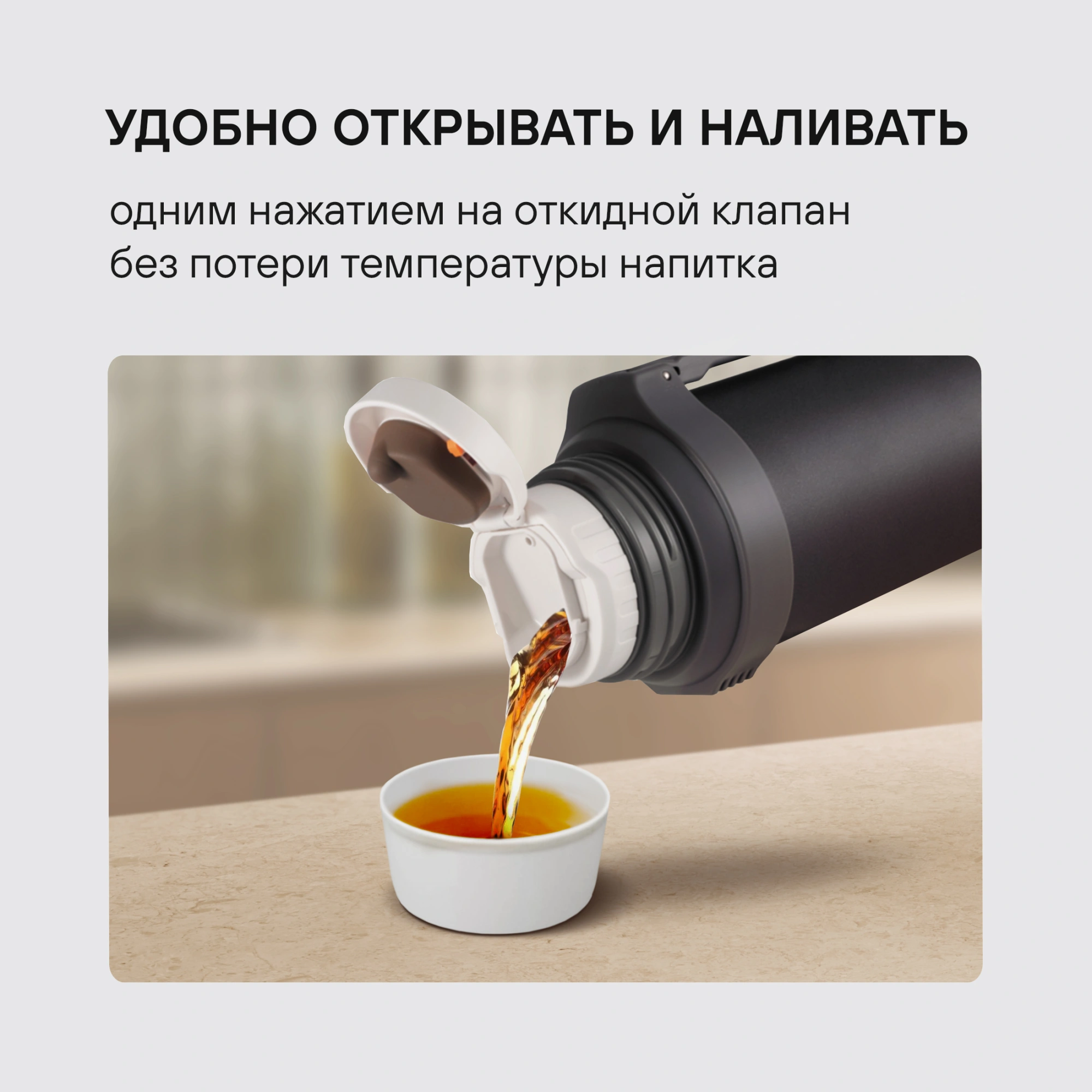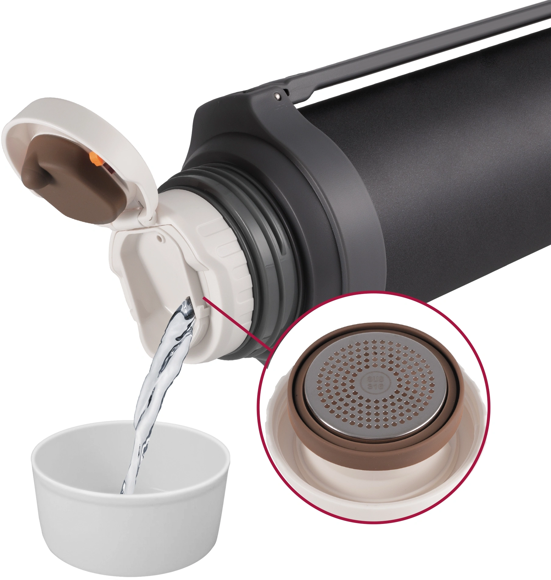 Нерж. сталь для внешней и внутр. колбы. Вакуумный слой с медной металлизацией внутр. колбы. Кнопочная система открывания и наливания без потери температуры. Амортизирующая ручка. Фильтр для заваривания листового чая в термосе. Крышка-чашка и доп. пластиковая чашка. Для горячих и холодных напитков.