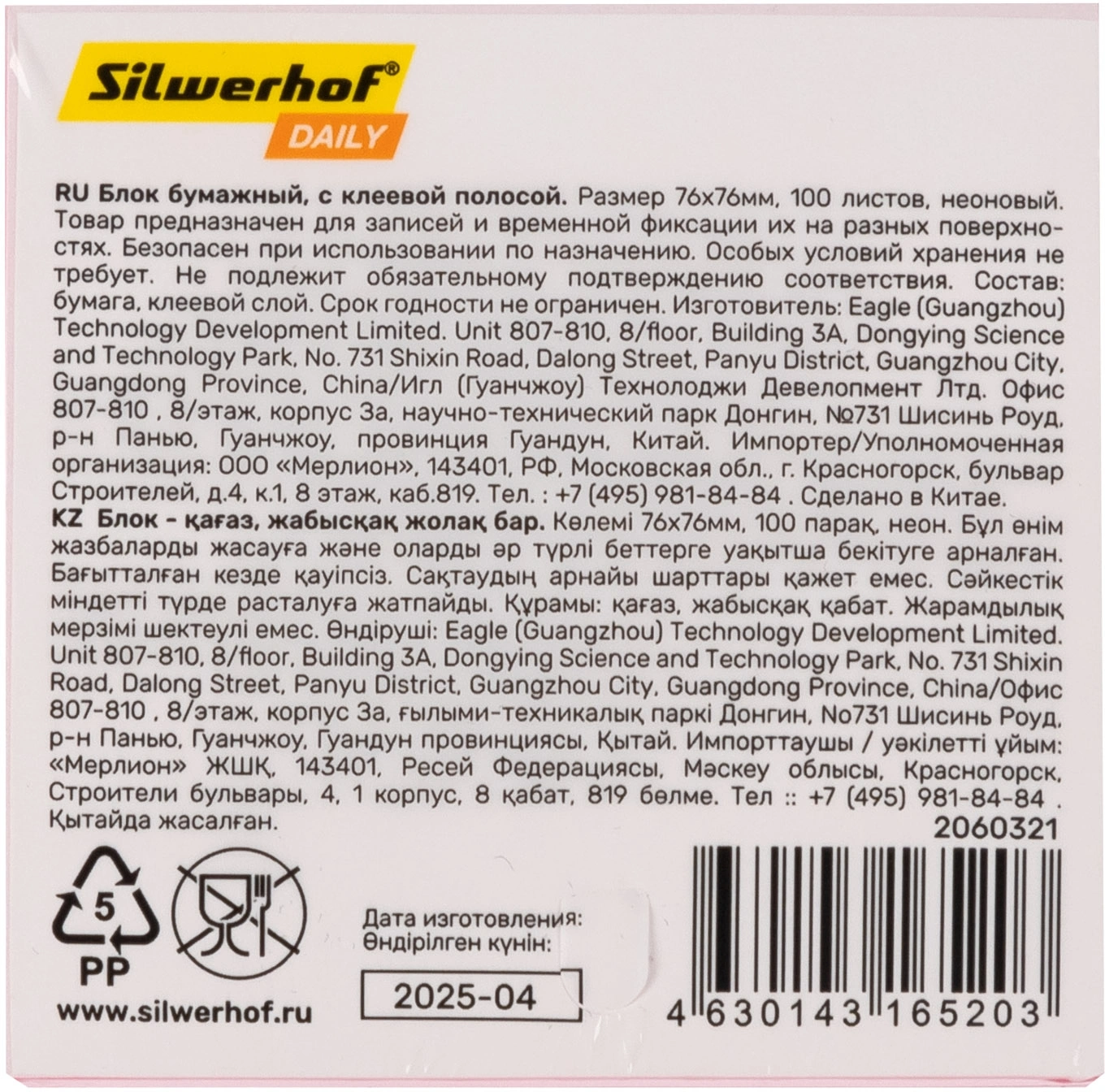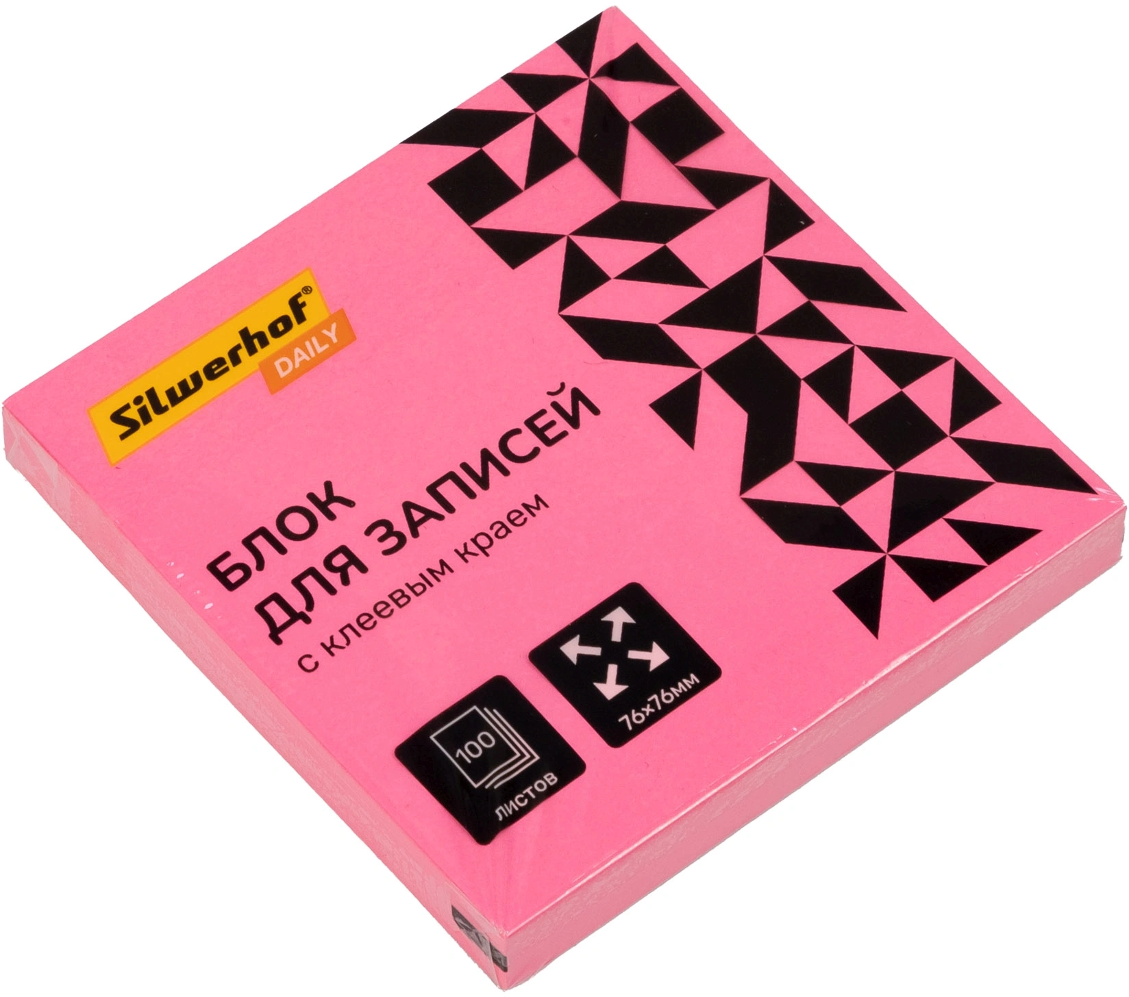 Блок самоклеящийся бумажный Silwerhof Daily 76x76мм 100лист. 75г/м2 неон розовый