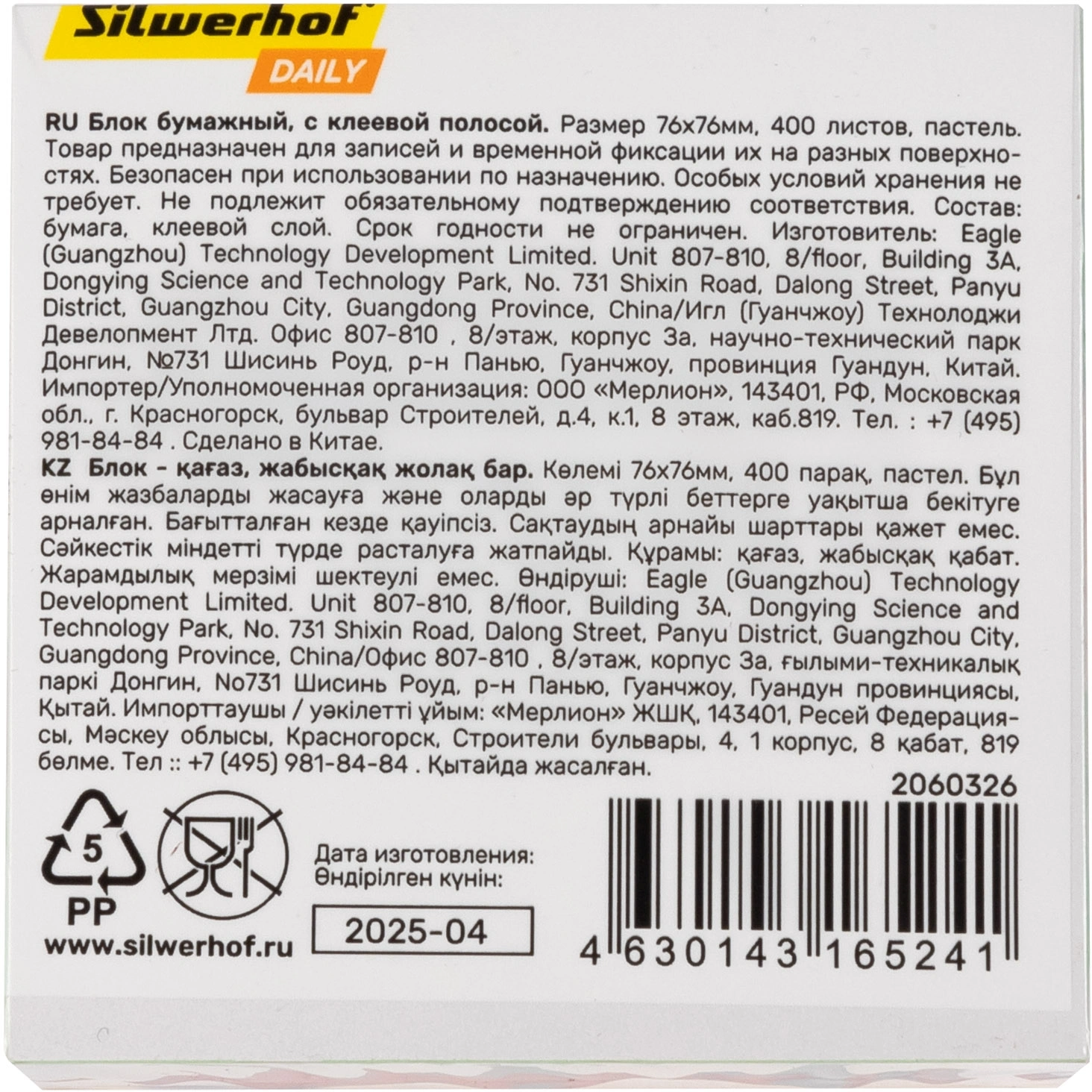 Блок самоклеящийся бумажный Silwerhof Daily 76x76мм 400лист. пастель 4цв.в упак.