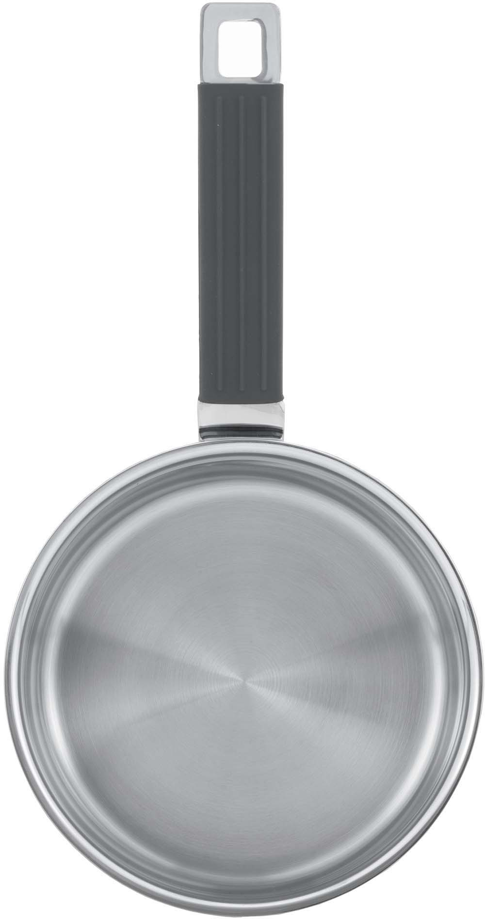 Технология: тройное вштампованное, а затем вплавленное дно без воздушных полостей. Аксессуары: стальные ручки с силиконовыми накладками. Преимущества: эргономичная форма ручек. Плоская крышка из термостойкого стекла с паровыпуском и металлическим ободом. Внутренние отметки литража.