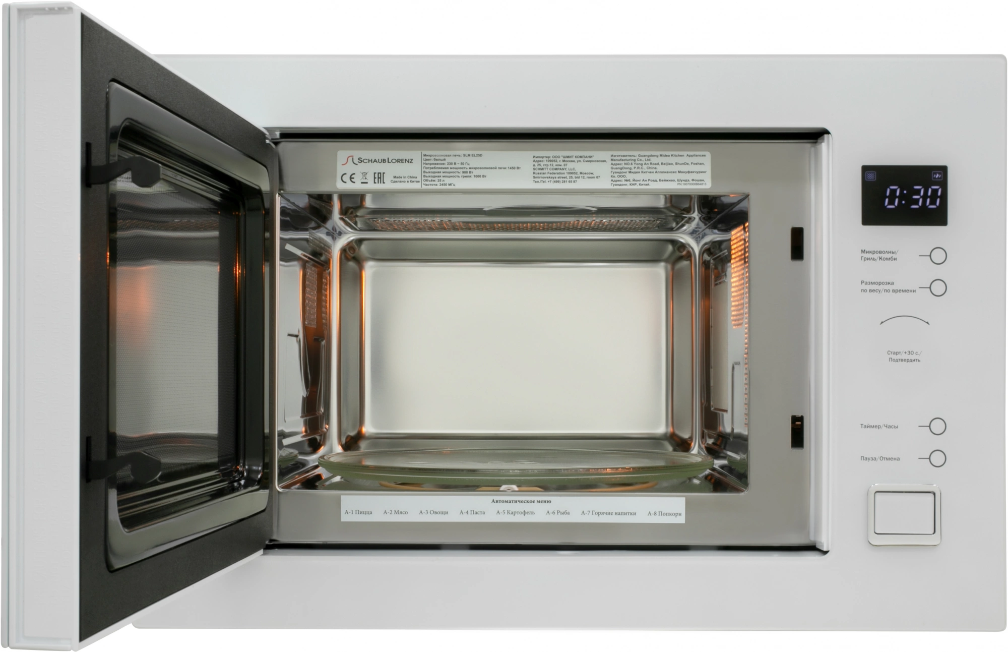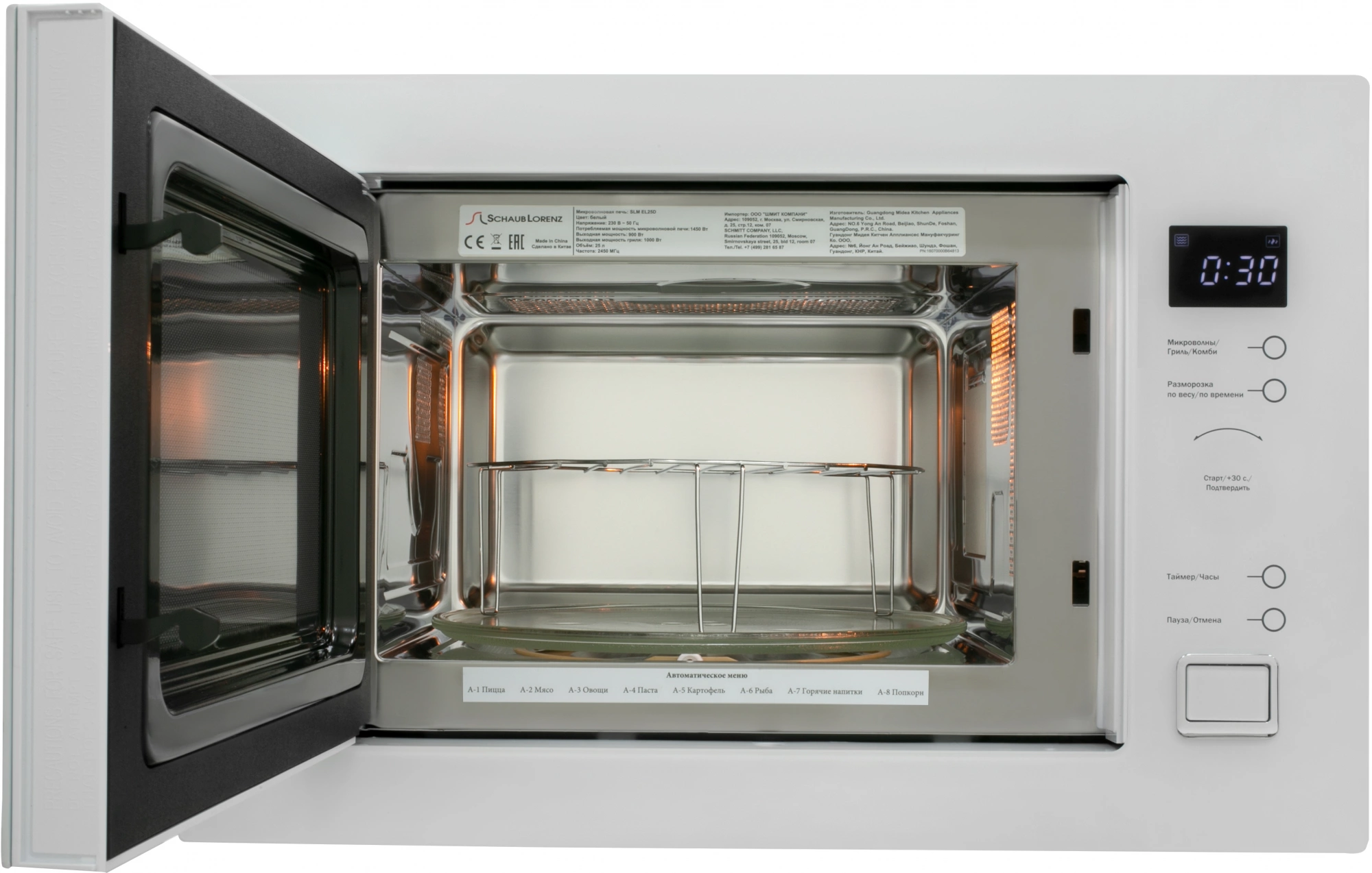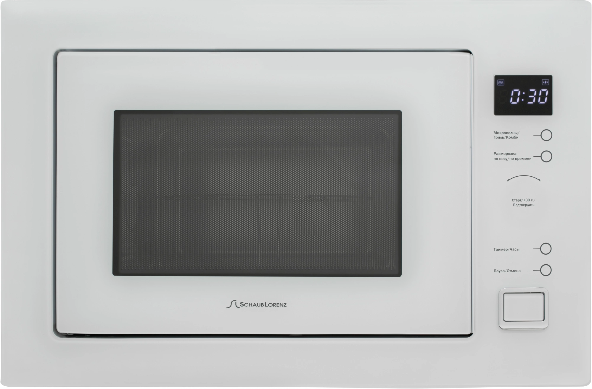 звуковой сигнал окончания приготовления, кнопка +30 секунд, пауза, регулировка мощности