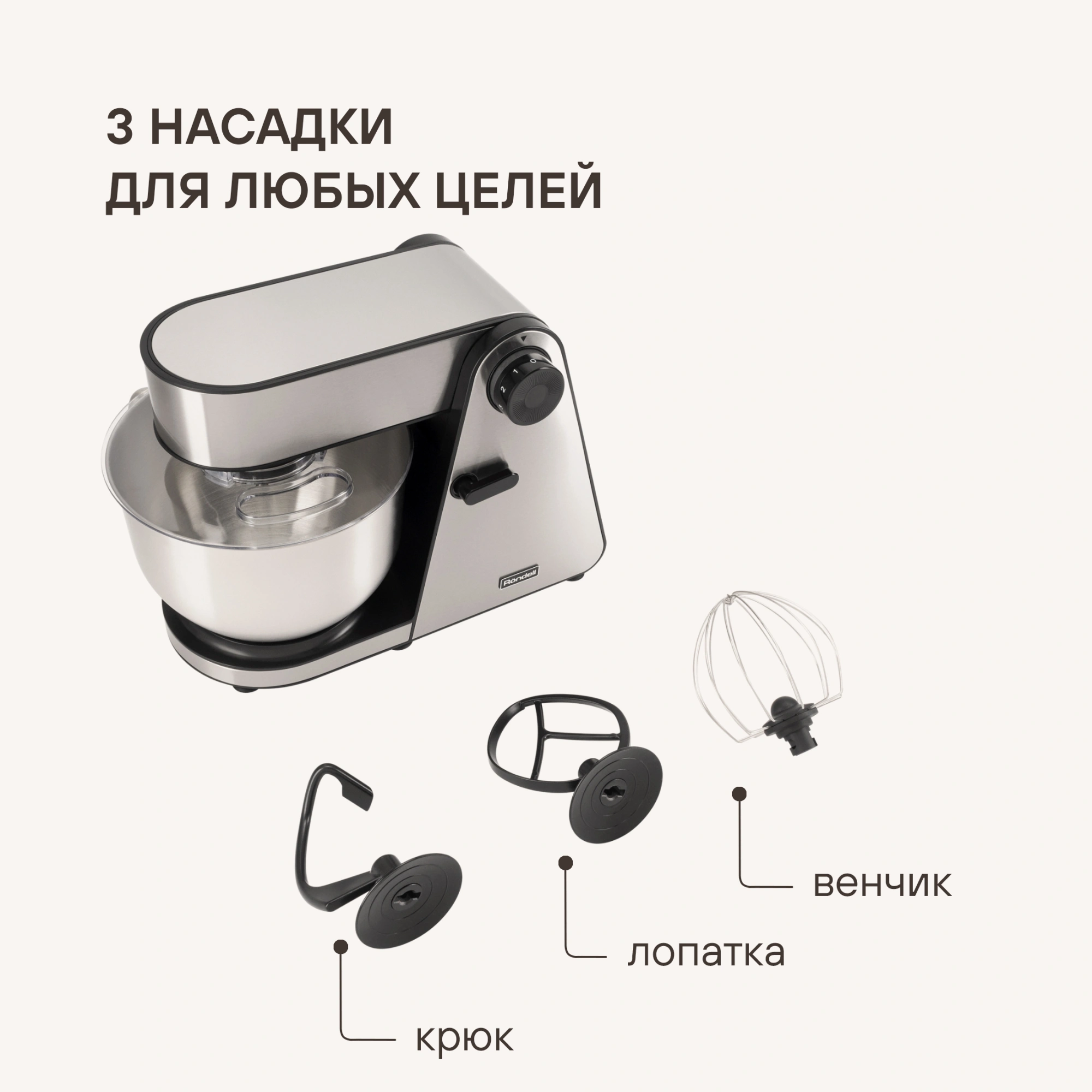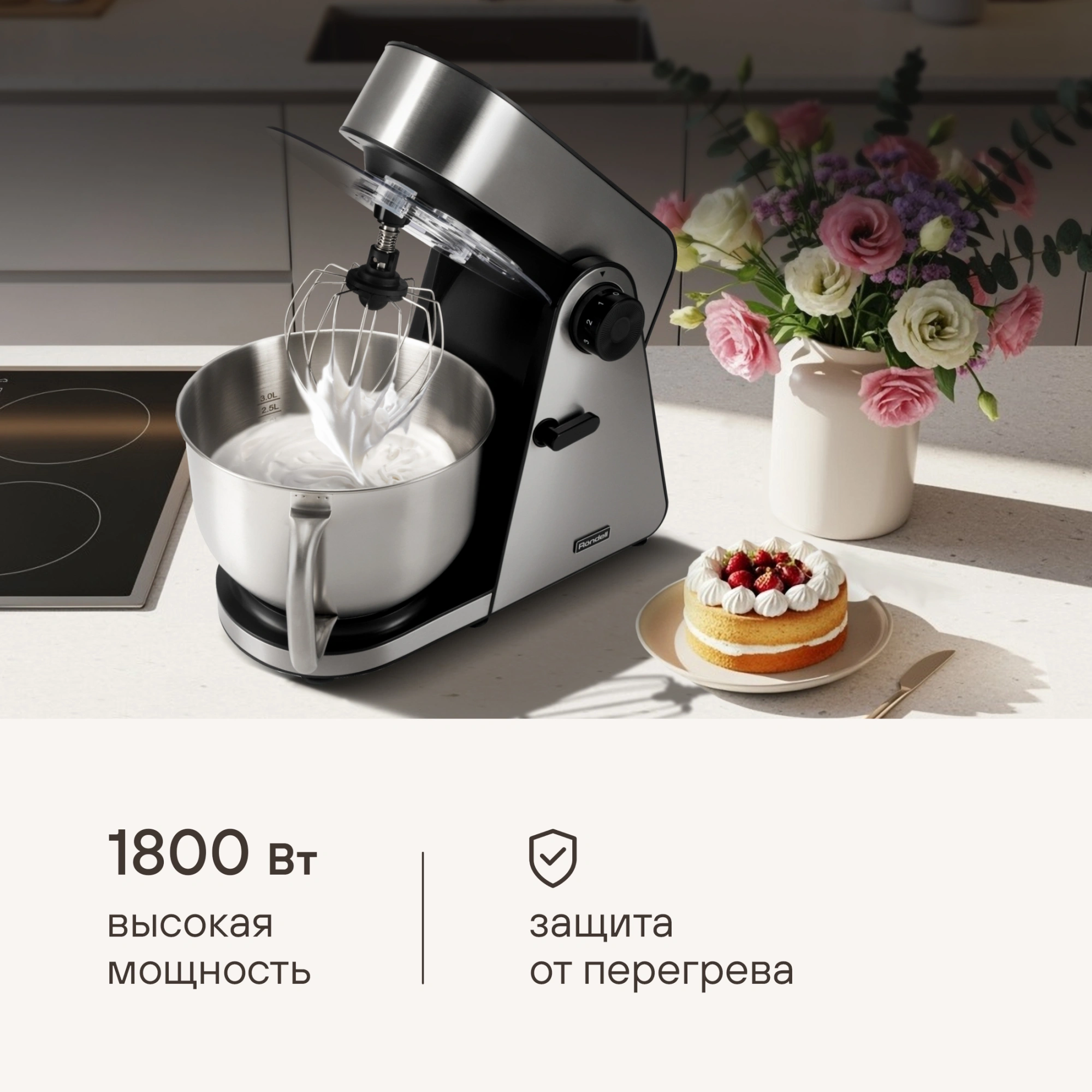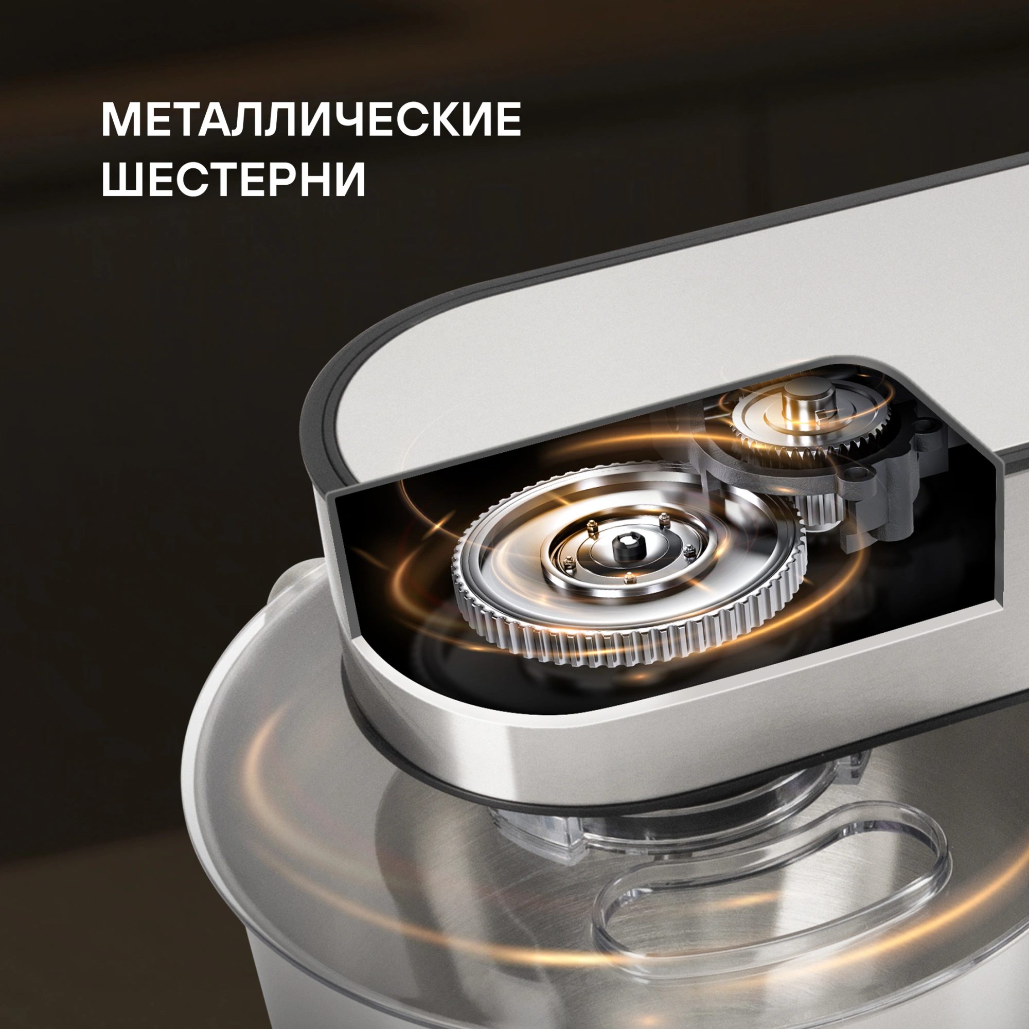 AC-мотор; металлические шестерни; 3D-вращение насадок; насадки можно мыть в посудомоечной машине