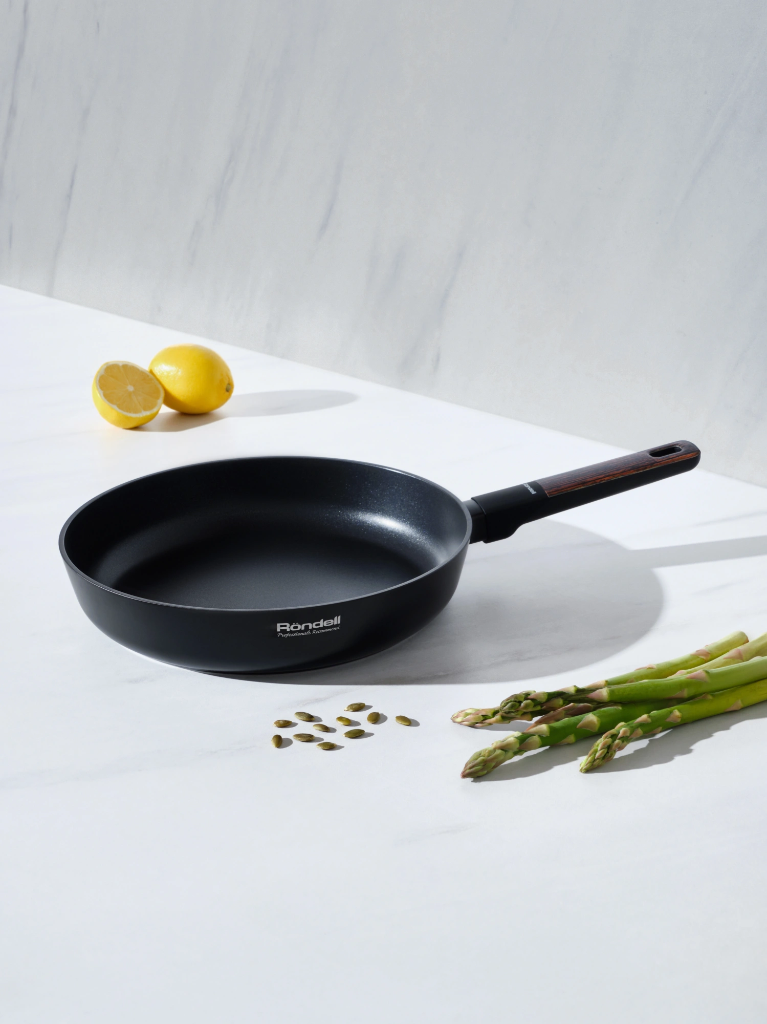 Изготовлено из кованого алюминия. Прочное внутреннее двухслойное антипригарное покрытие. Стильная бакелитовая ручка с Soft Touch покрытием и вставкой из ABS пластика, стилизованная под натуральное ореховое дерево. Рекомендуется ручная мойка во избежание повреждения Soft Touch покрытия на аксессуарах