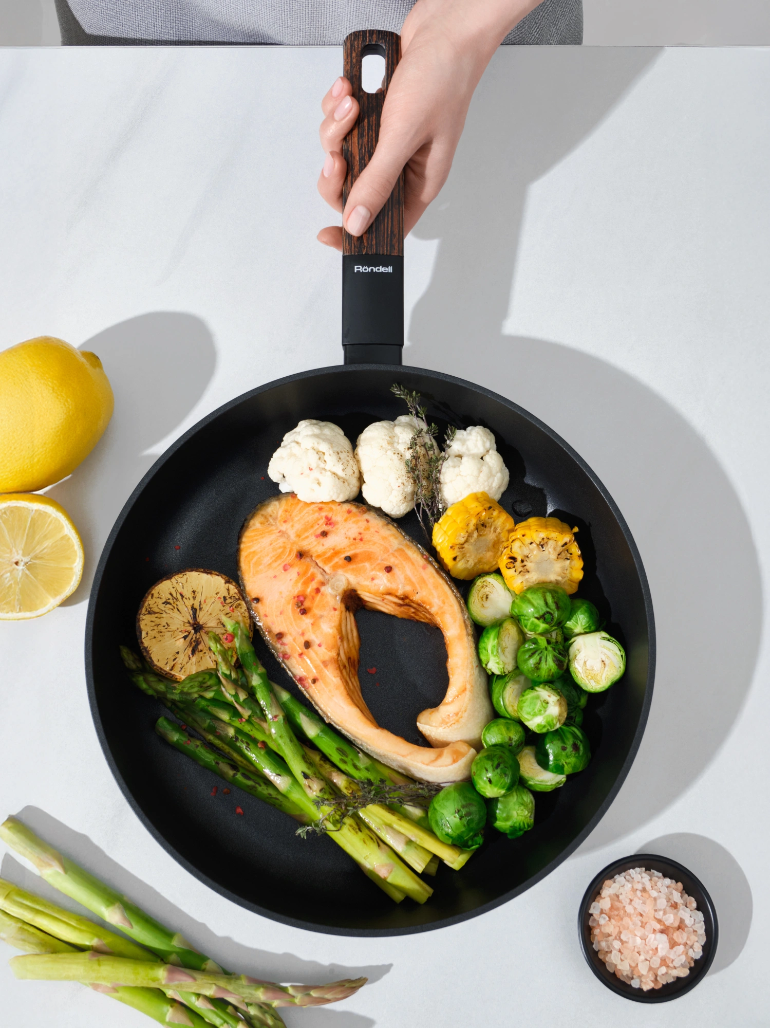 Изготовлено из кованого алюминия. Толщина стенок – 2,8 мм, дна – 3,5 мм. Прочное внутреннее двухслойное покрытие: превосходные антипригарные свойства. Не содержит PFOA. Безопасно для здоровья. Рекомендуется ручная мойка во избежание повреждения soft touch покрытия на аксессуарах.