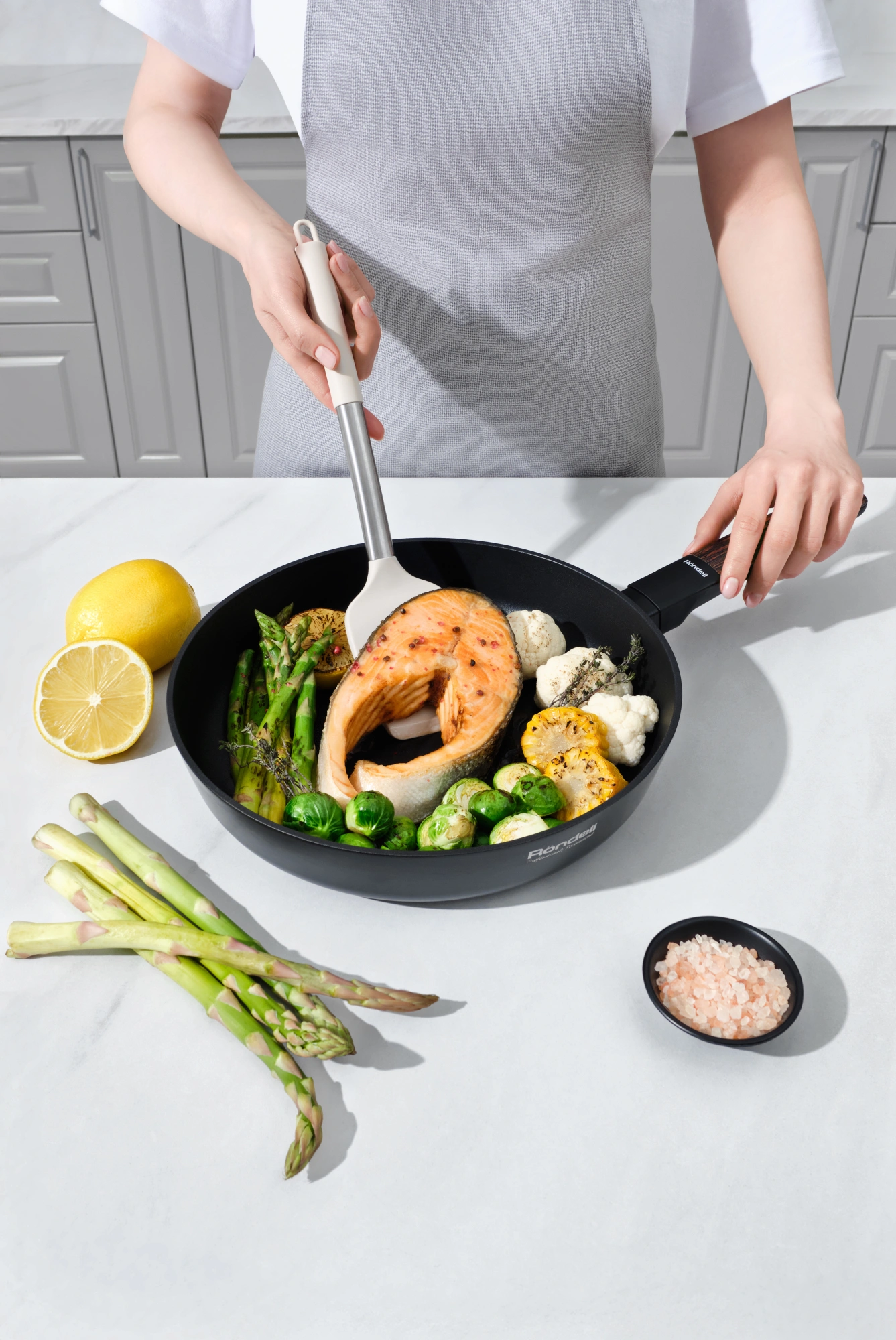 Изготовлено из кованого алюминия. Прочное внутреннее антипригарное покрытие. Стильная бакелитовая ручка с soft touch покрытием и вставкой из ABS пластика, стилизованная под натуральное ореховое дерево. Рекомендуется ручная мойка во избежание повреждения soft touch покрытия на аксессуарах.