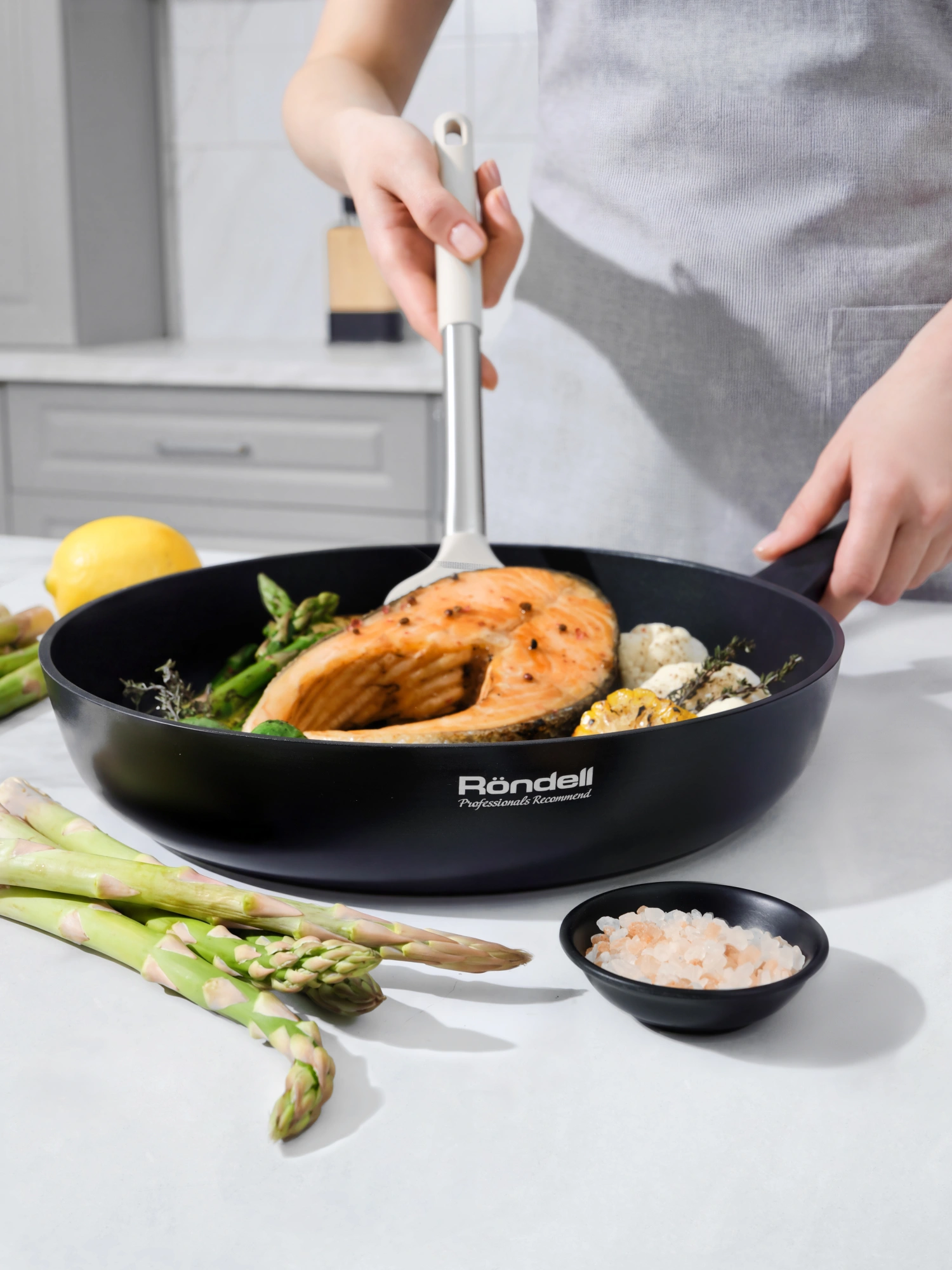 Изготовлено из кованого алюминия. Толщина стенок – 2,8 мм, дна – 3,5 мм. Прочное внутреннее двухслойное покрытие имеет превосходные антипригарные свойства. Не содержит PFOA. Безопасно для здоровья. Рекомендуется ручная мойка во избежание повреждения soft touch покрытия на аксессуарах.